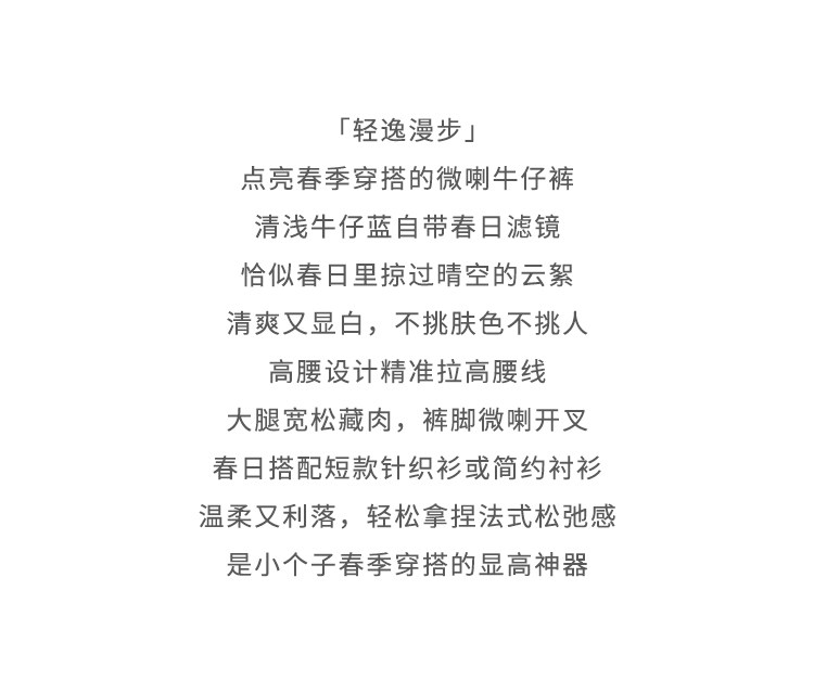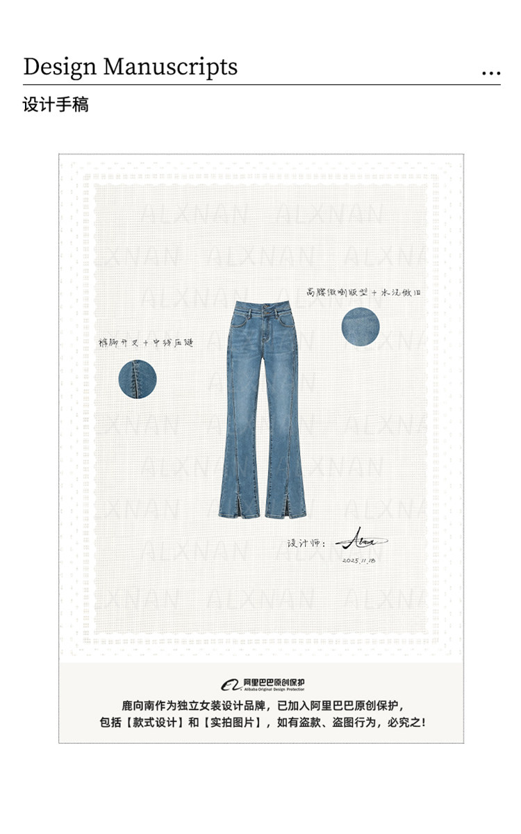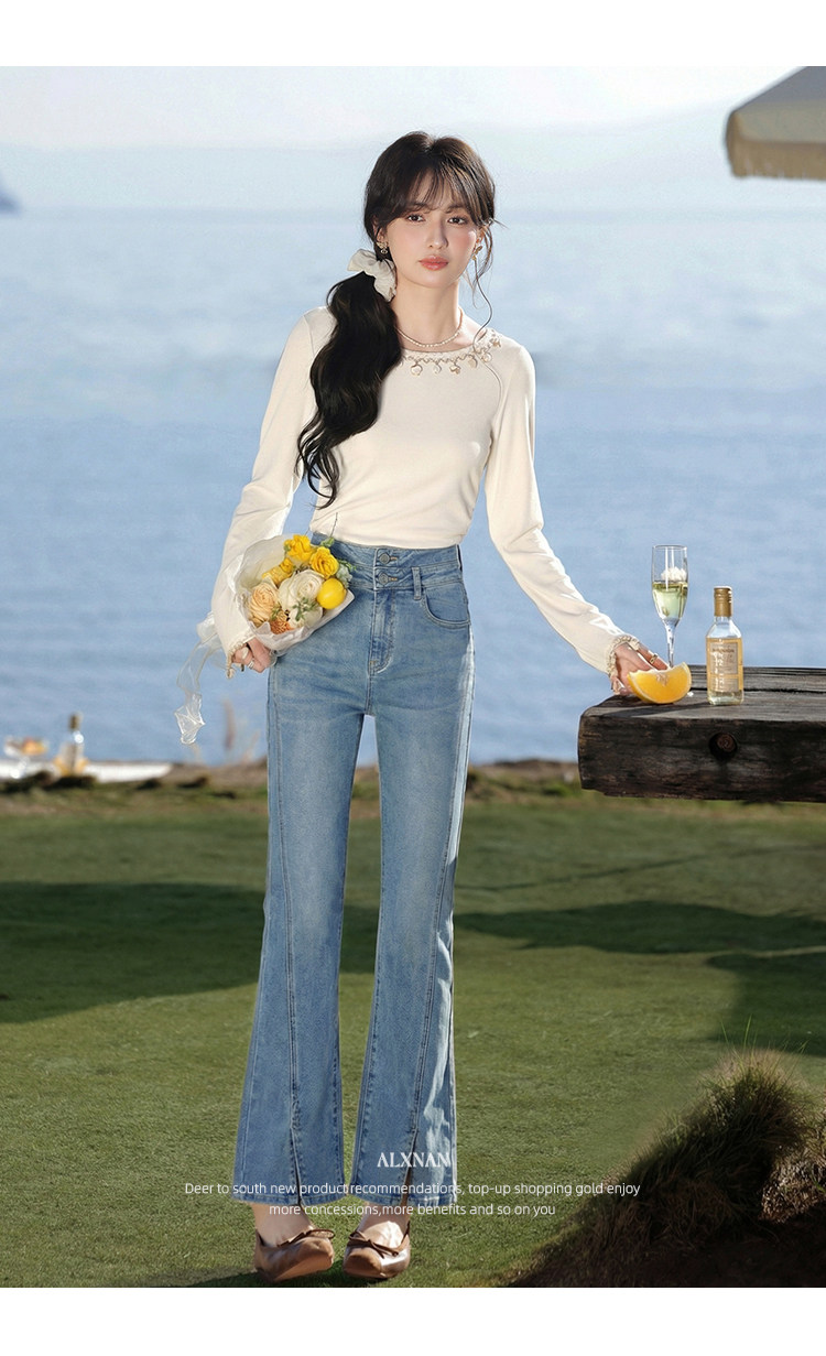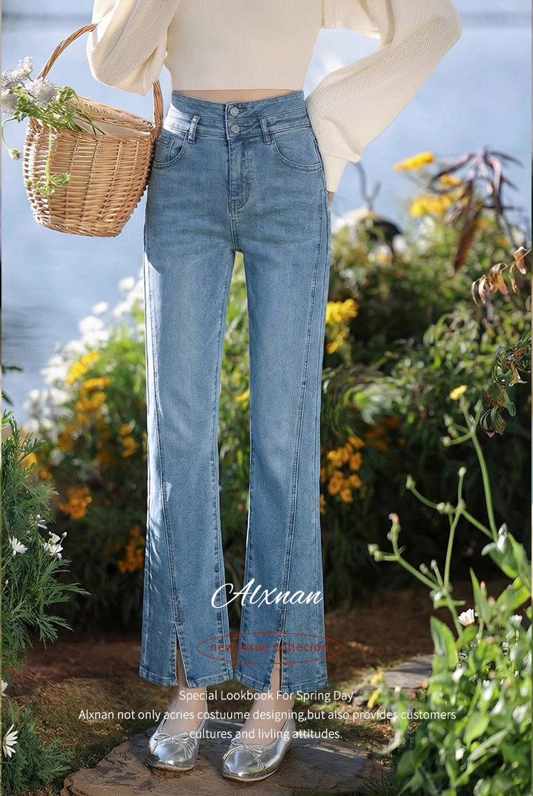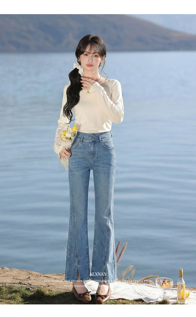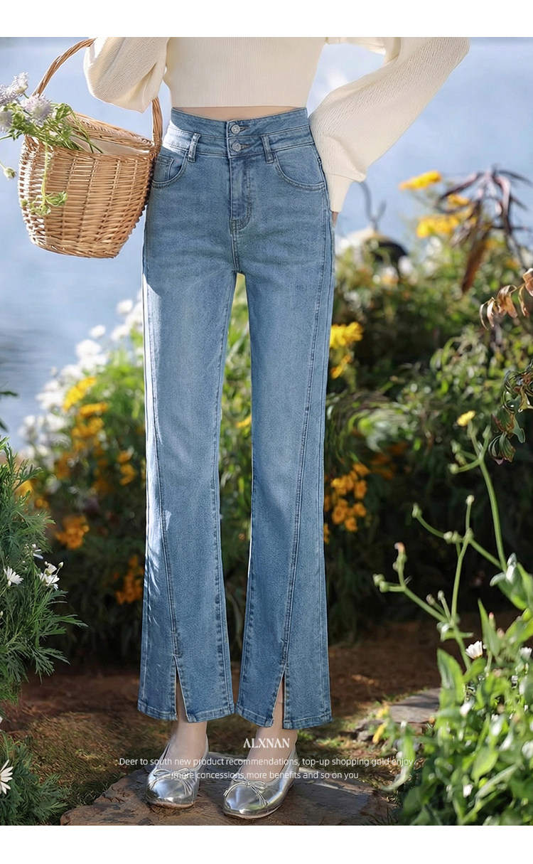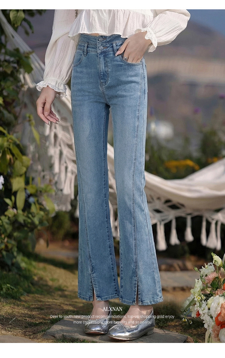 鹿向南「轻逸漫步」蓝色开叉微喇牛仔裤女春季小个子显瘦直筒长裤