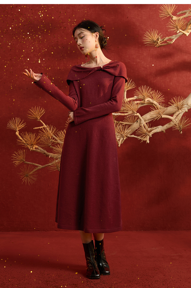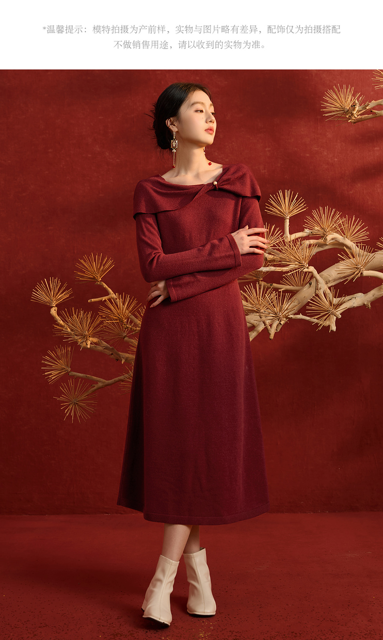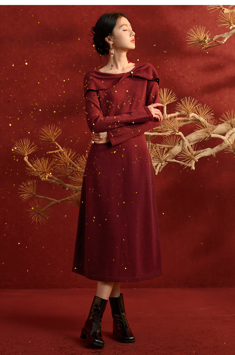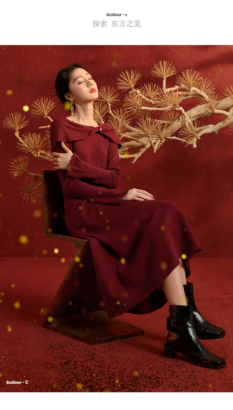三彩【金风玉露】2025冬季新款新中式针织连衣裙蝴蝶结长裙C