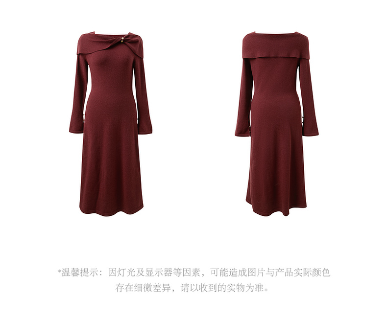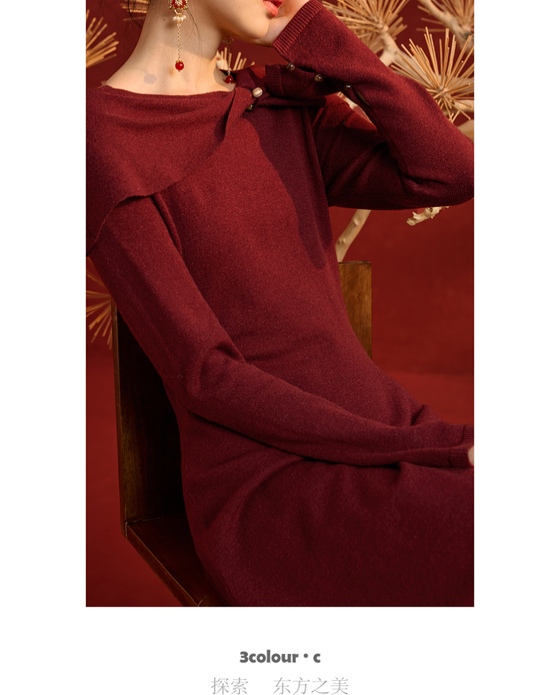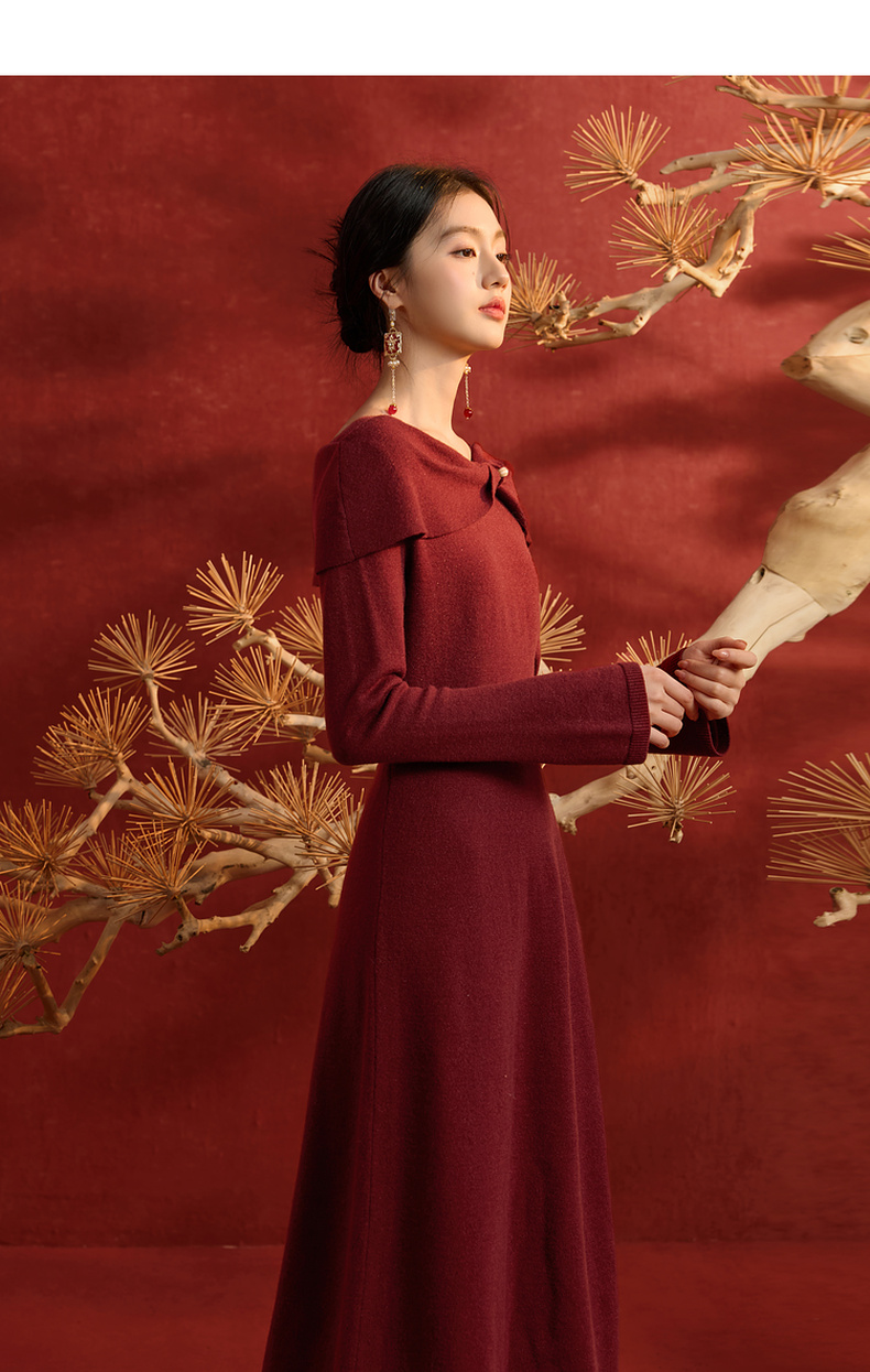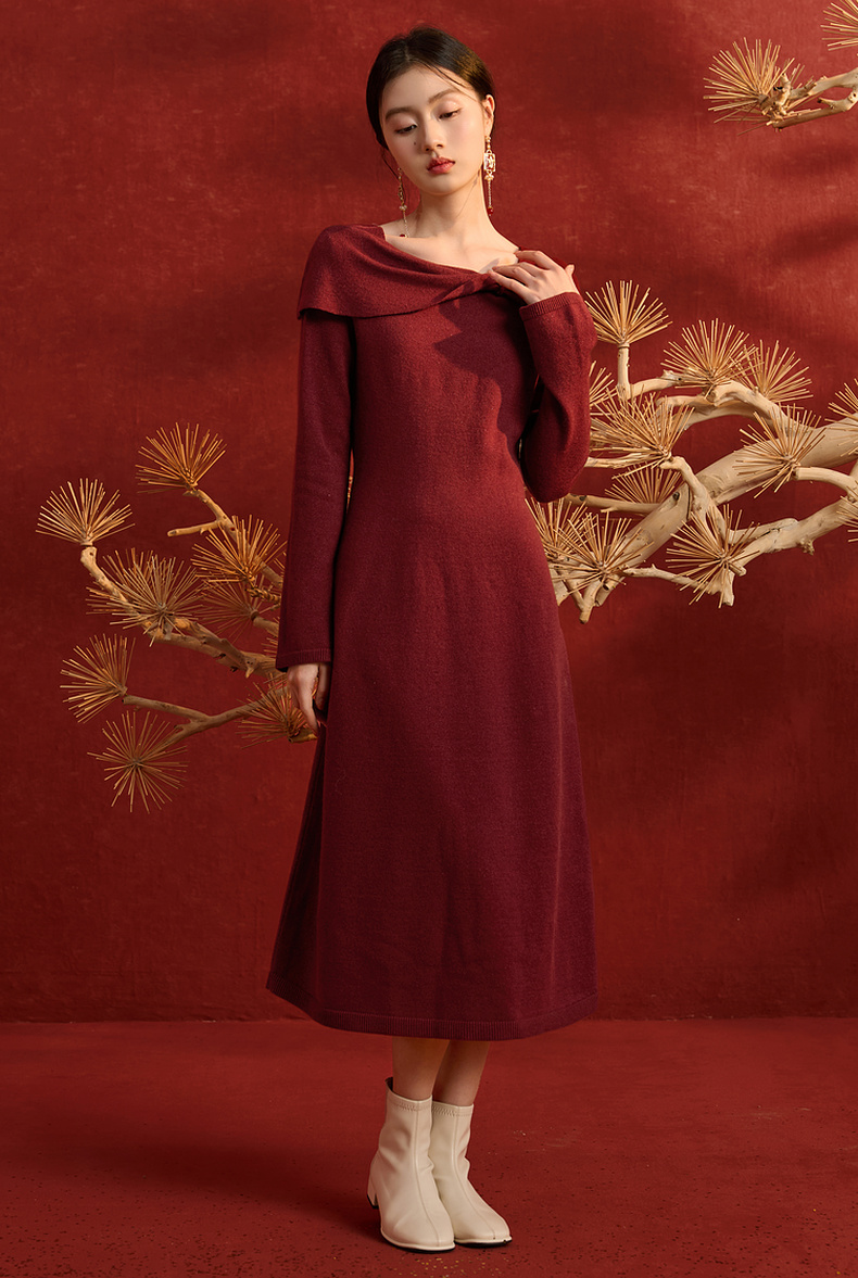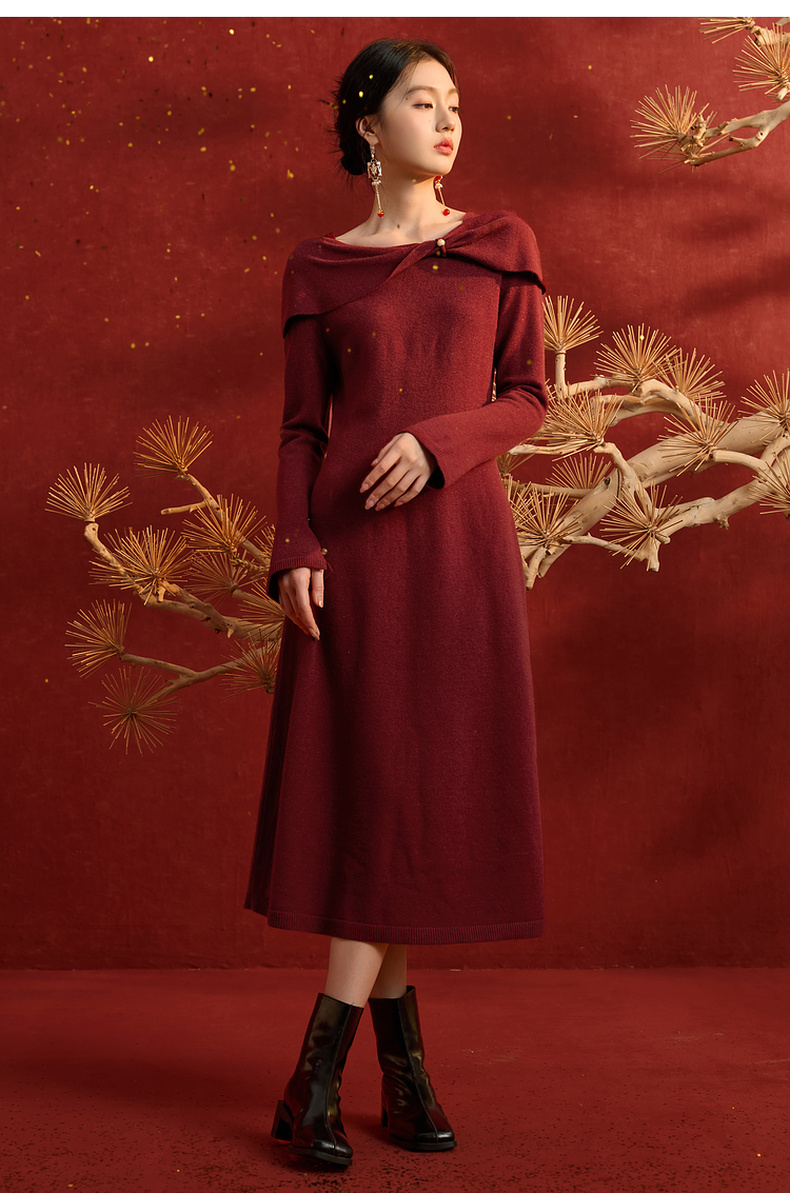 三彩【金风玉露】2025冬季新款新中式针织连衣裙蝴蝶结长裙C