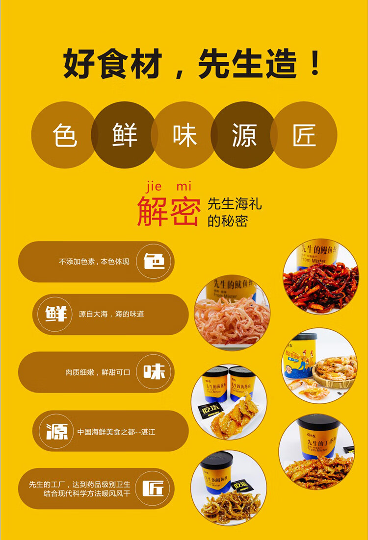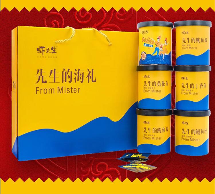 广东湛江虾先生牌 即食鱼干 先生的海礼550g/盒(香辣丁香鱼120g、香辣黄花鱼100g、鱿鱼丝罐装80g、即食虾干50g、蜜香鳗鱼丝100g、香辣鳗鱼丝100g)