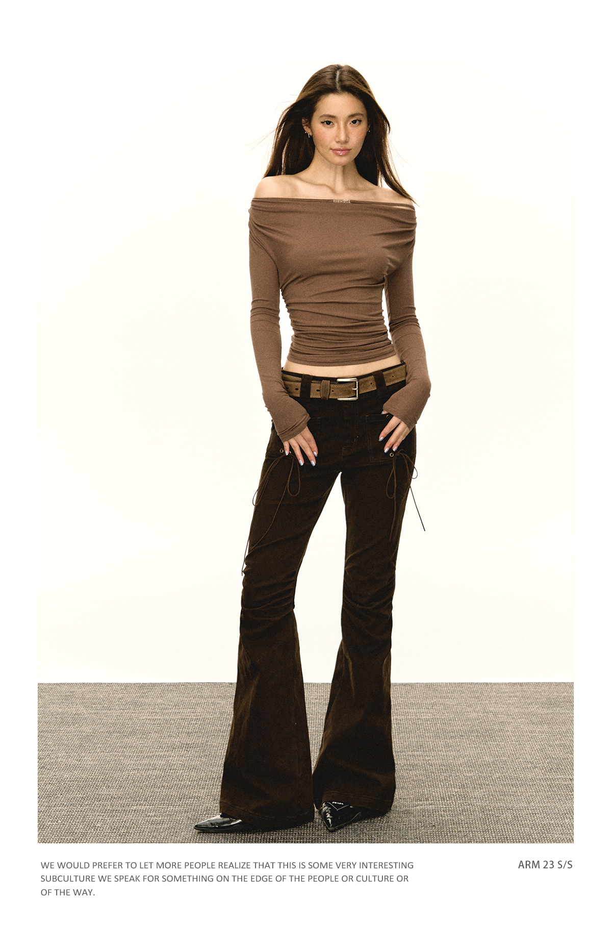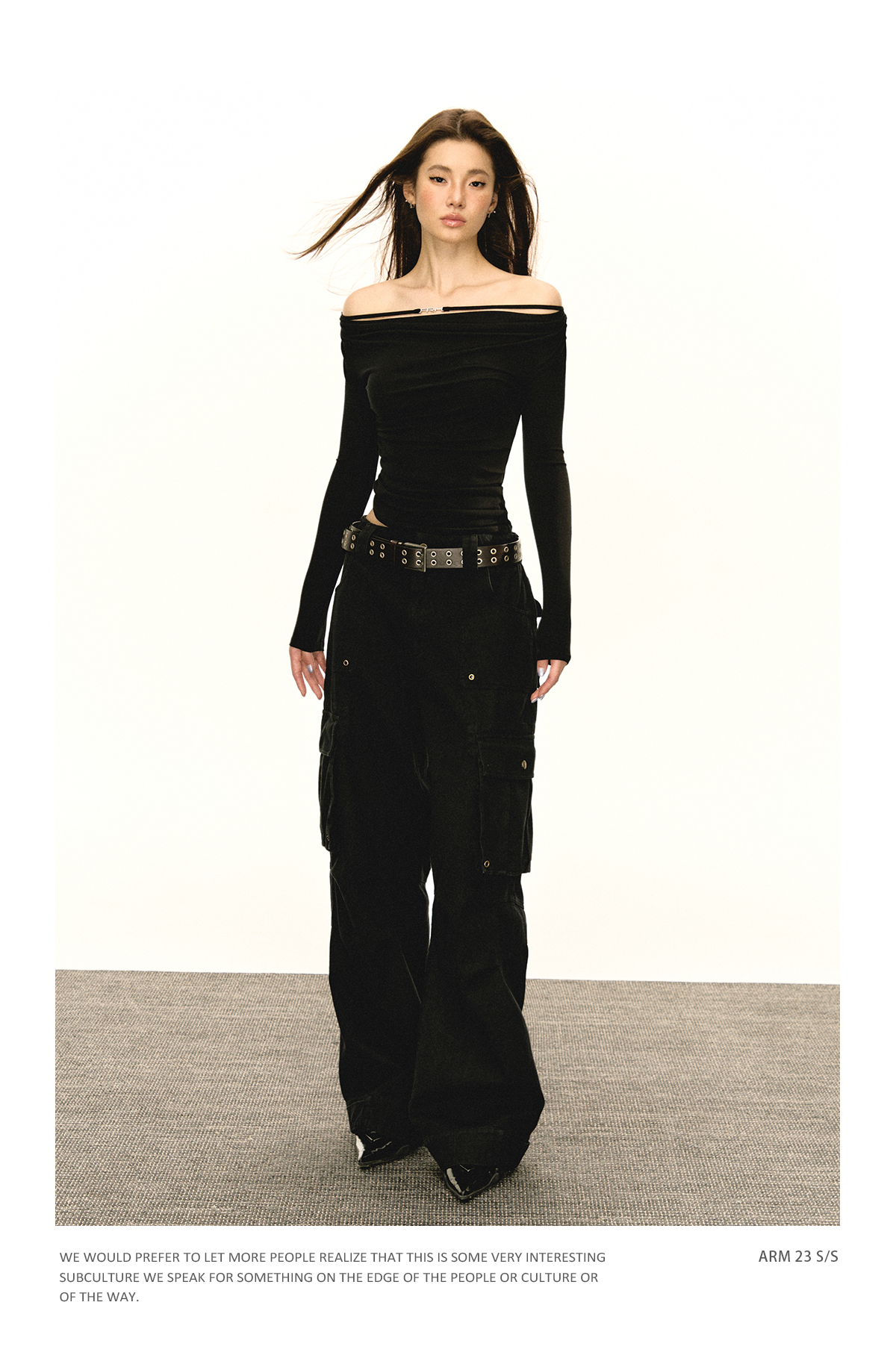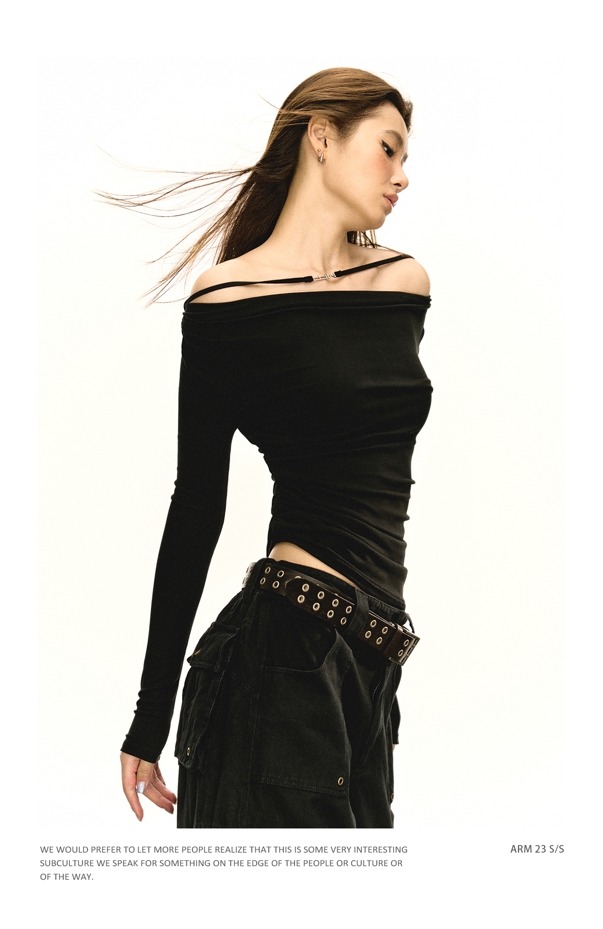 Ariseism美式复古辣妹一字肩长袖露肩上衣秋季季新款内搭打底衫