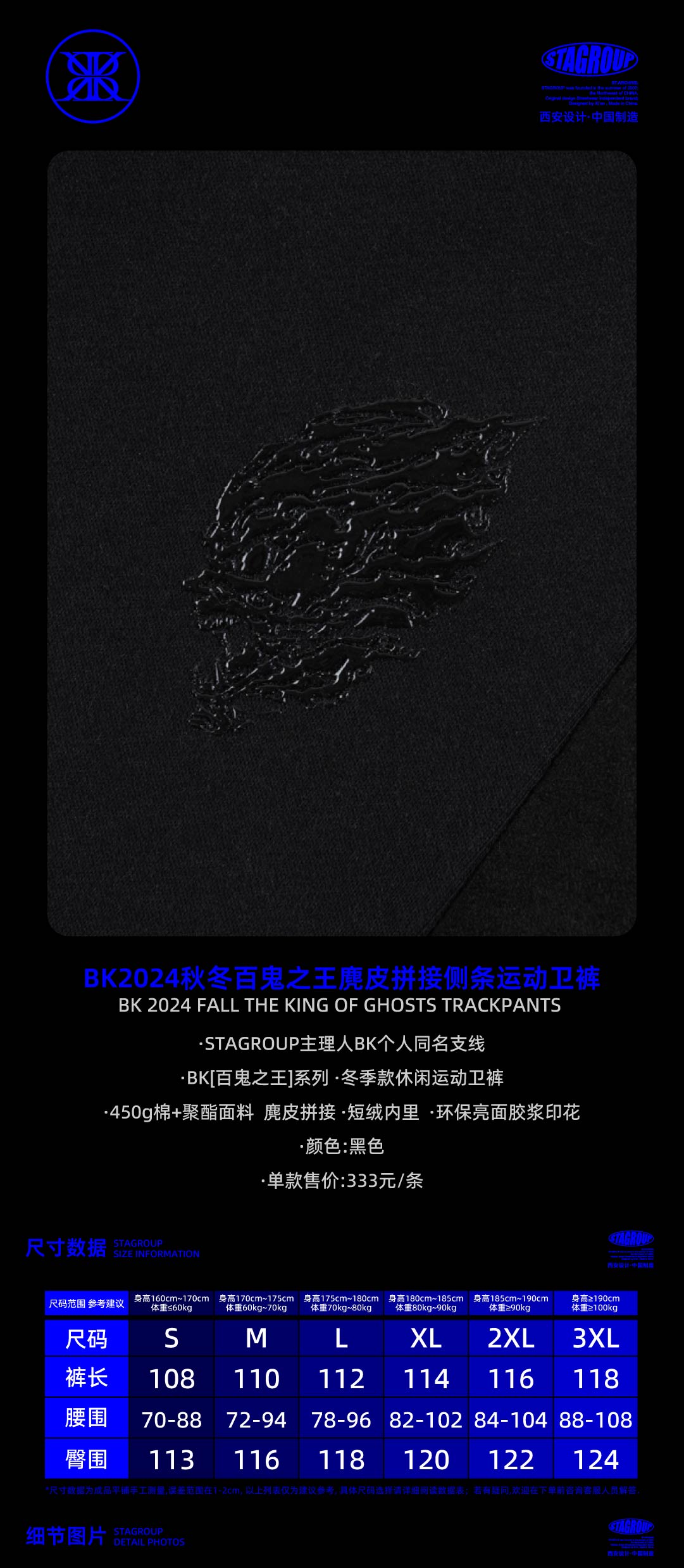 BK2024秋冬百鬼之王麂皮拼接侧条运动卫裤