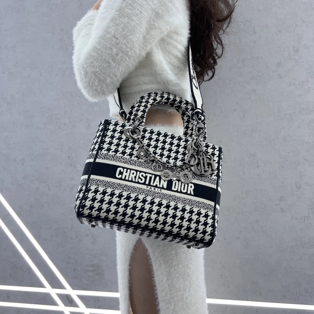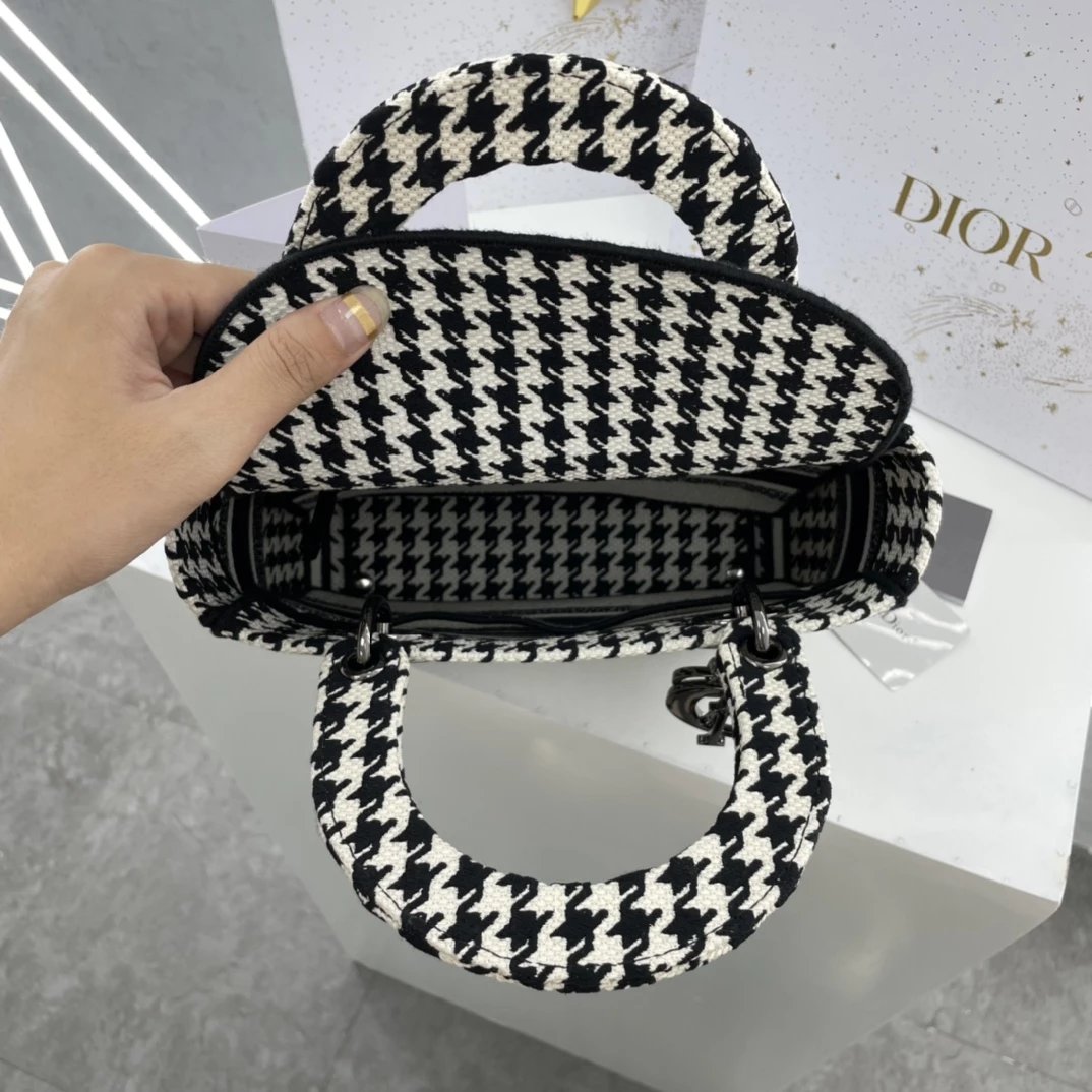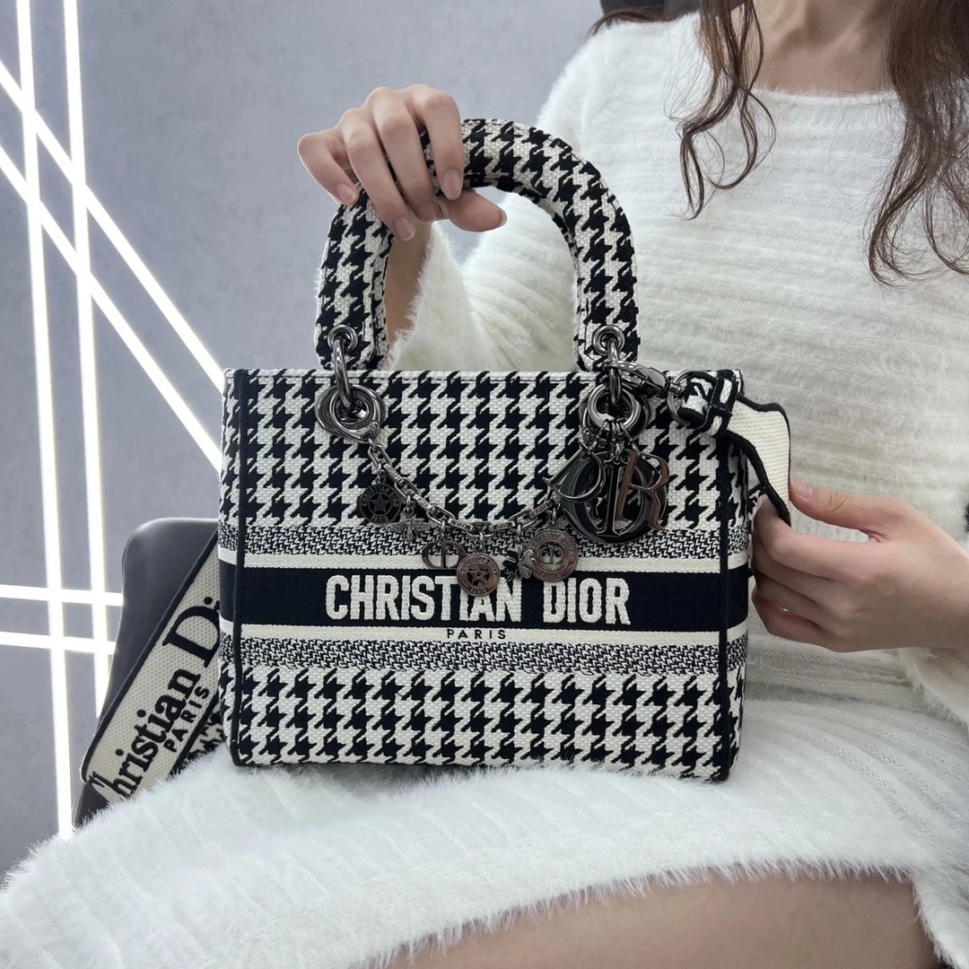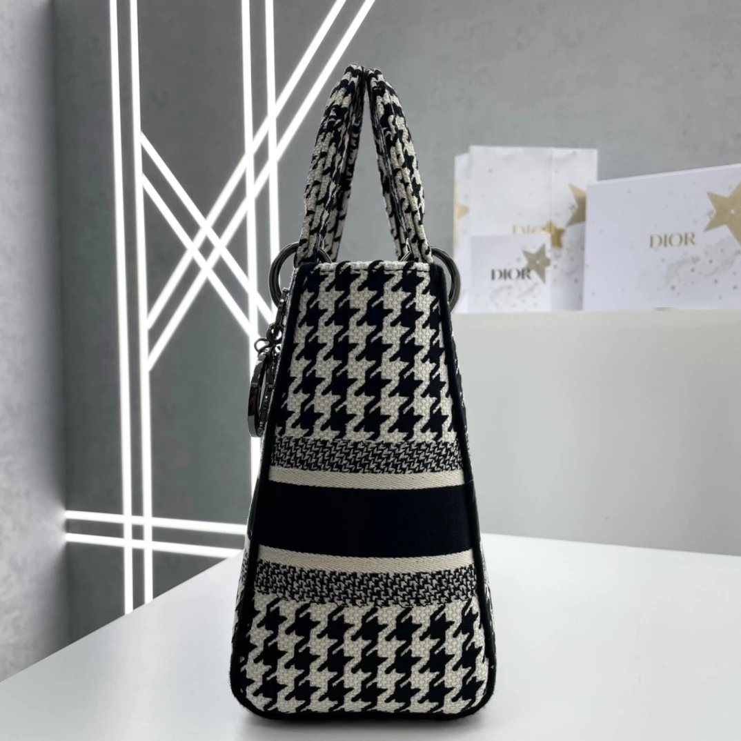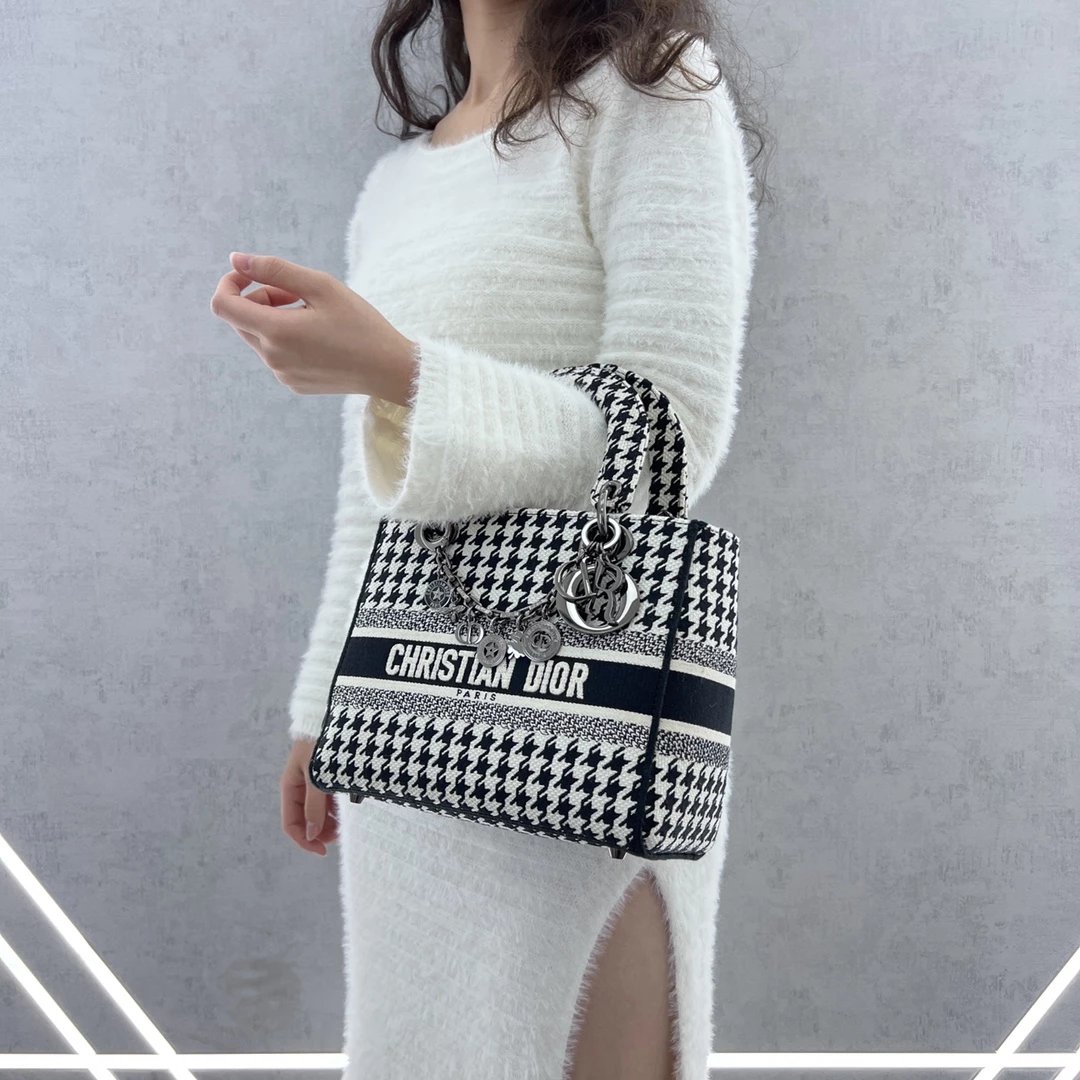 Lady D-Lite千鸟格戴妃手提包 ,千鸟格纹图案刺绣搭配富有质感的饰面金属!D家