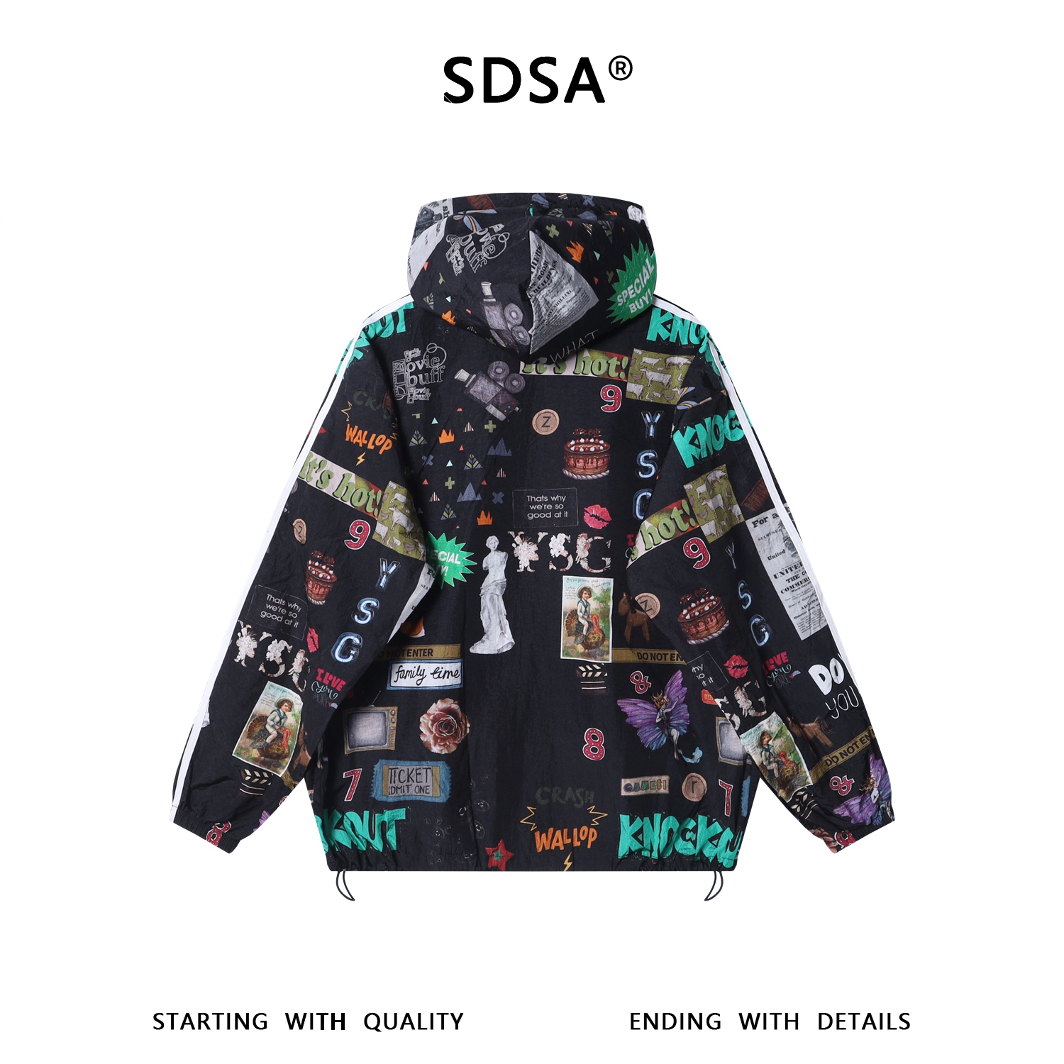 SDSA秋冬新款痞帅男装时尚趣味涂鸦拉链连帽夹克外套下摆松紧百搭