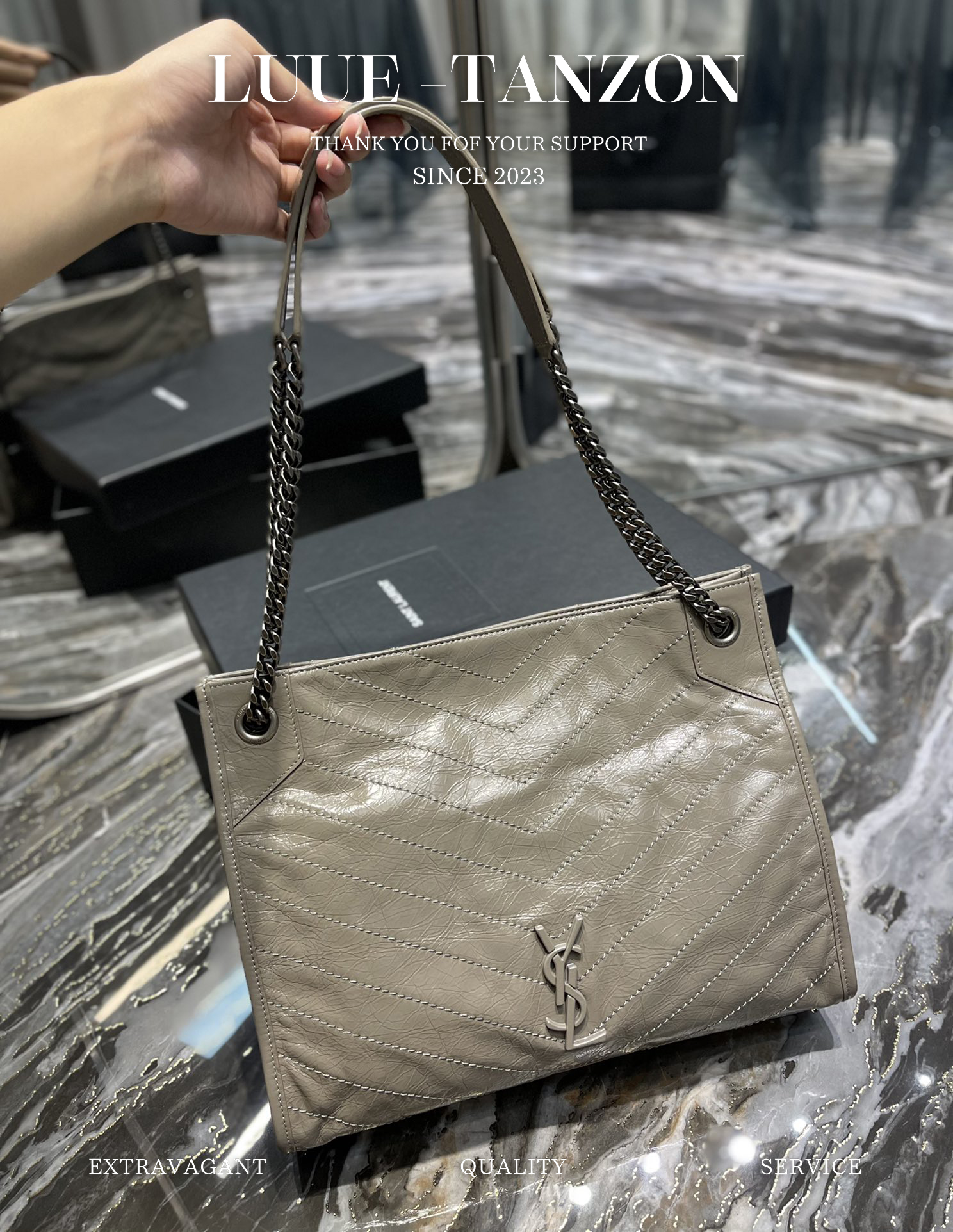 圣罗兰 Niki Logo标识 复古 褶皱皮革 大容量 托特包 链条单肩手提包 中号 女款 经典推荐(LZ)