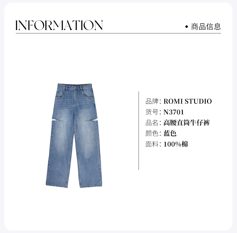ROMI STUDIO“率性简约”百搭宽松高腰直筒割破磨白牛仔裤N3701