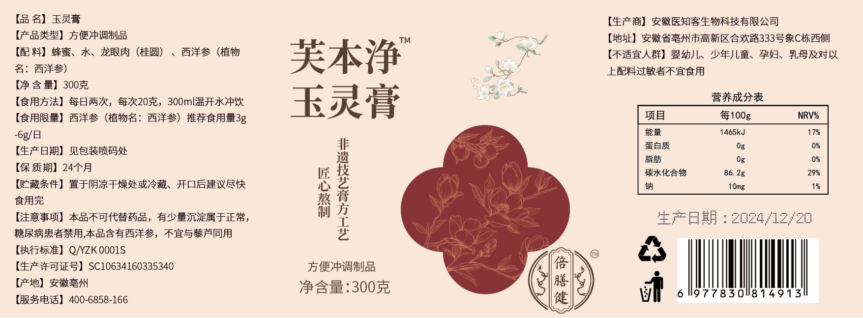 【官方旗舰】芙本浄玉灵膏蒸桂圆西洋参玉灵膏正品古法熬制冲饮300g