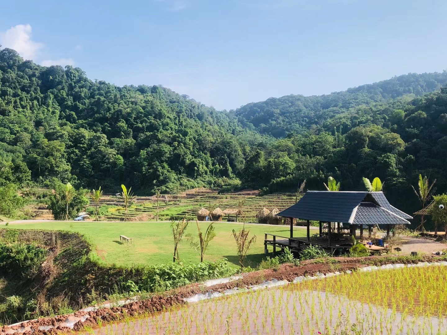 遮荫的棚子现场用芭蕉搭建,有点贝爷户外求生的感觉了!煮饭的器皿变成了比手臂还粗的竹筒,汤汁的调味料是徒步中摘的野菜,包裹米饭的是路边新鲜的芭蕉叶,在城市里吃多了精致的美食,你将会第一次感觉到,这样荒野原始的炊火绝对是难忘的美味。