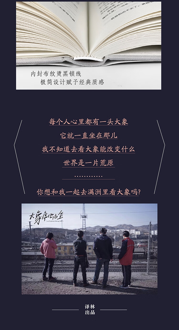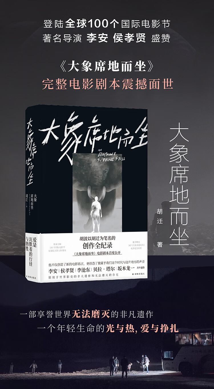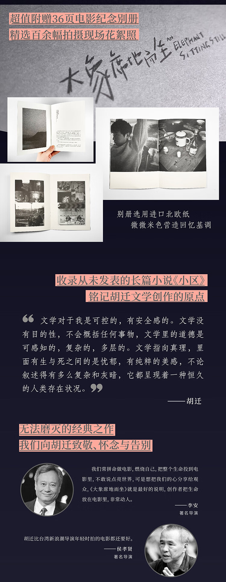 ▲《大象席地而坐》电影剧本*度完整公开 作为胡迁*初也是*后的作品,《大象席地而坐》为其赢得了世界性的关注和声誉。电影在日本上映时,媒体盛赞这是“中国新生代影人*初的*后的*高的杰作”。这部电影的故事雏形*早来自胡迁的同名短篇小说,而本书所收录的则是完整的电影分镜头剧本,电影正是据此完成了拍摄,阅读剧本可以强烈感受到胡迁对不同艺术载体的自如驾驭,尤其是他对文学语言和影像语言敏锐的感知力和表现力。 ▲附赠精心制作的《大象席地而坐》电影别册 为了向这部非凡遗作致敬,随书特别制作了36P纪念别册,除精选近百幅电影拍摄现场的花絮照片外,还邀请参与这部电影拍摄全程的导演助理瑶瑶撰写了回忆文章,并收录了对这部电影的深度解读以及世界知名影人的评价,对于初次接触到电影的读者来说,这个别册是与书中剧本相呼应的引入与介绍,而对喜爱这部电影的影迷和读者来说,也是很好的珍藏。