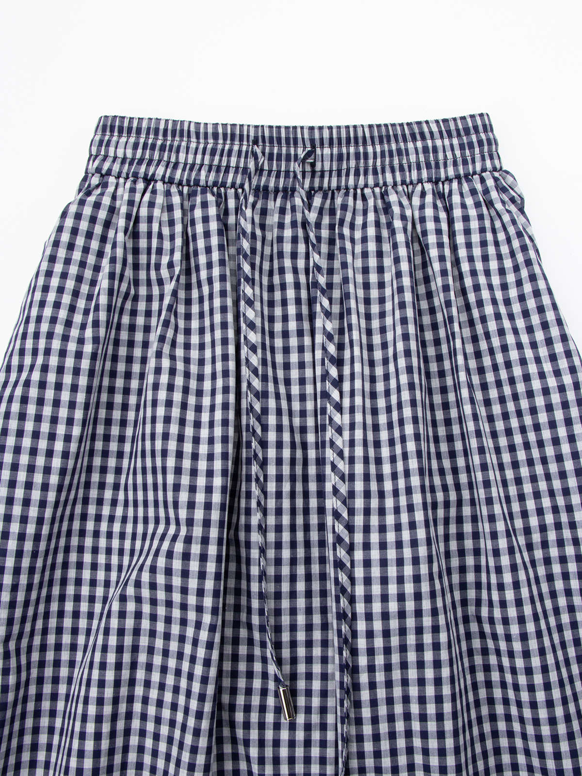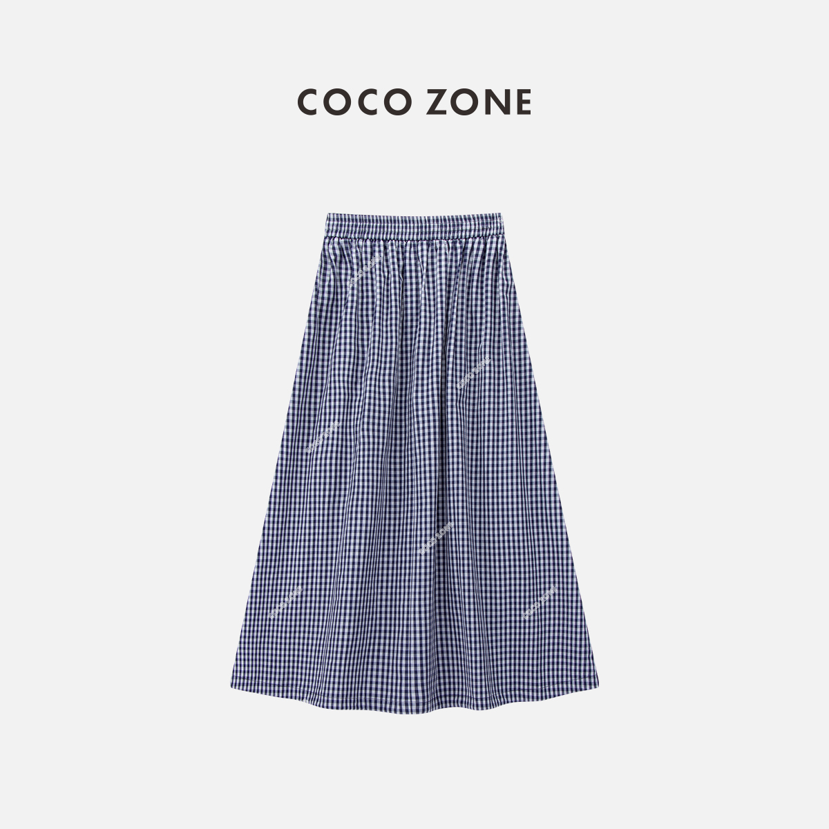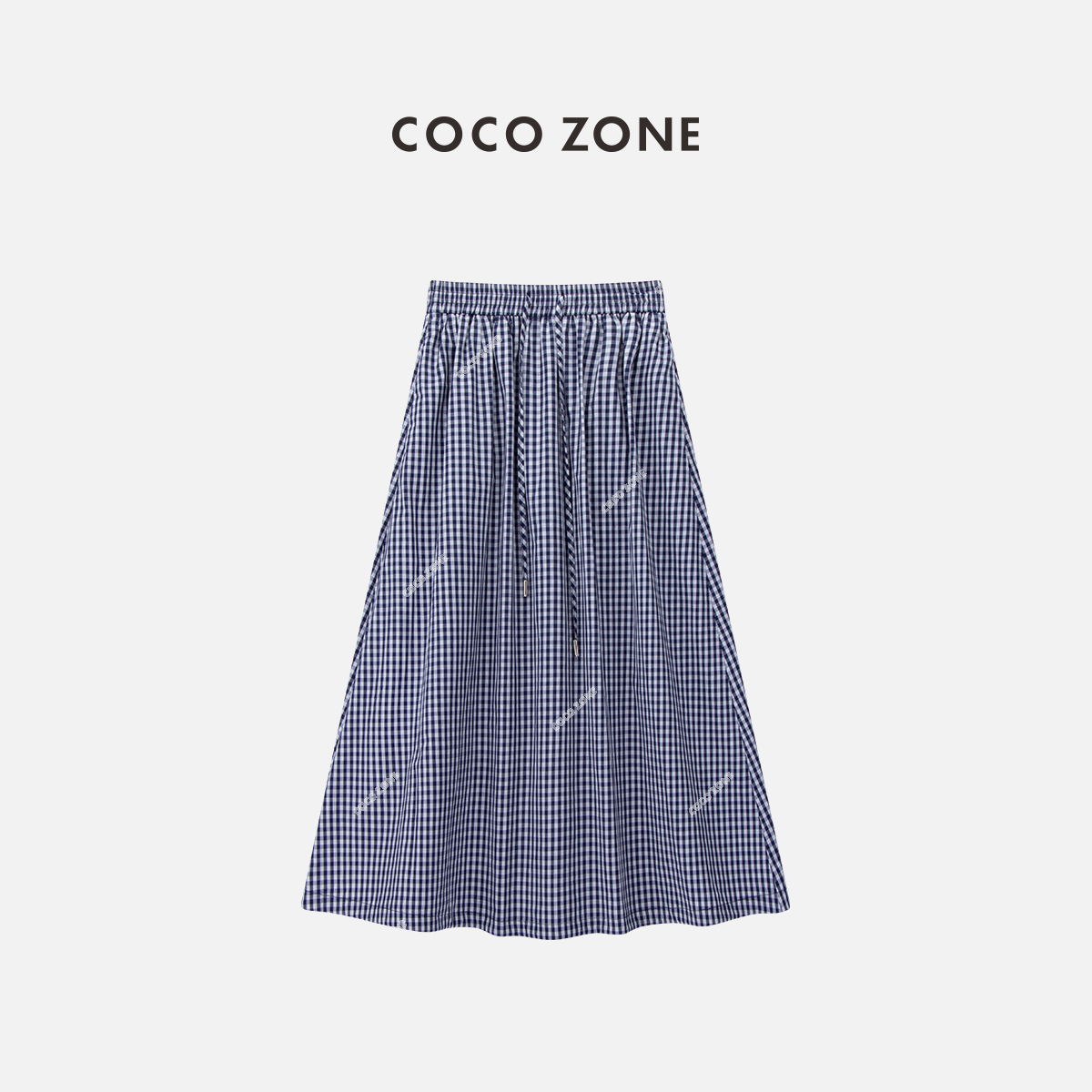COCO ZONE "蓝格"100棉格子抽绳A字半身裙百搭复古中长裙CC1B0846