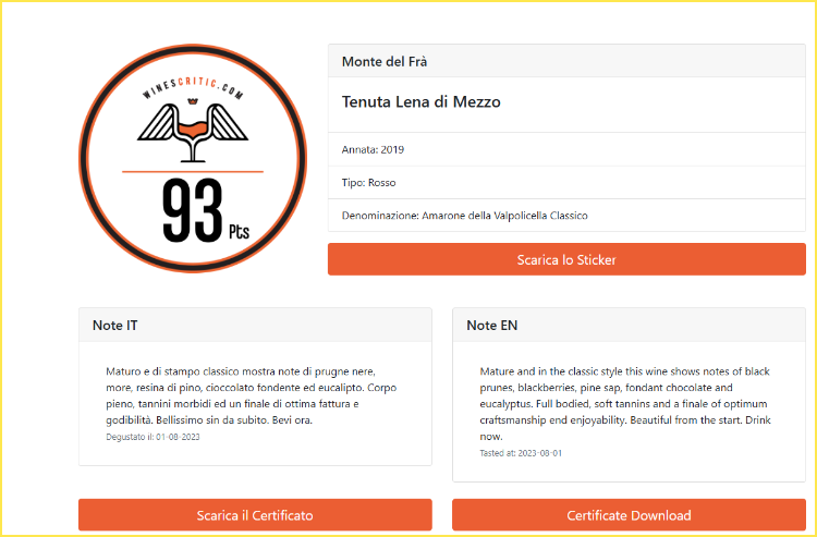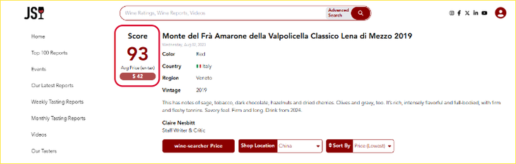 “成熟且经典的阿玛罗尼,呈现出黑李子、黑莓、松树汁、巧克力软糖和桉树的香气。酒体丰满,单宁柔和,美味可口。”