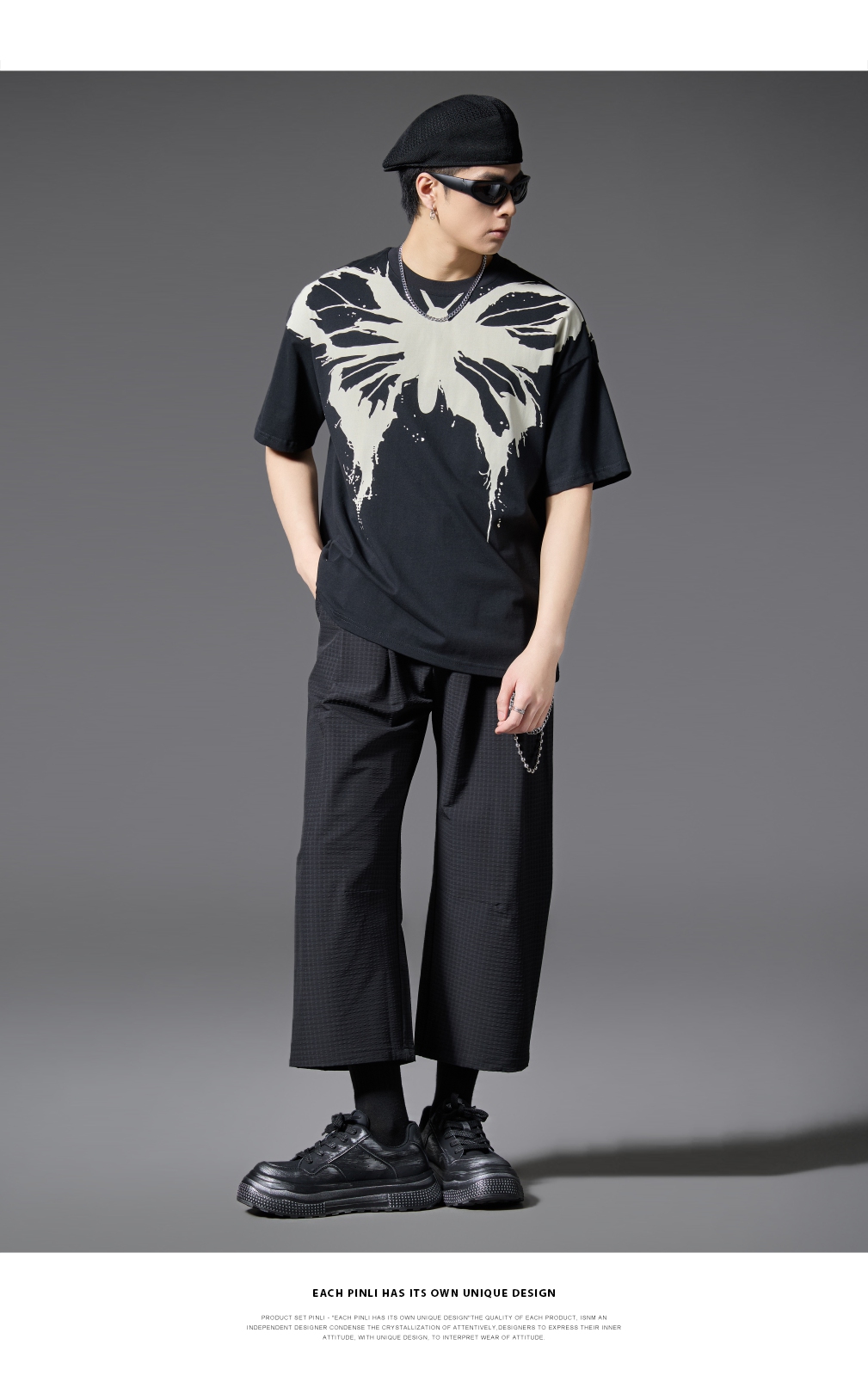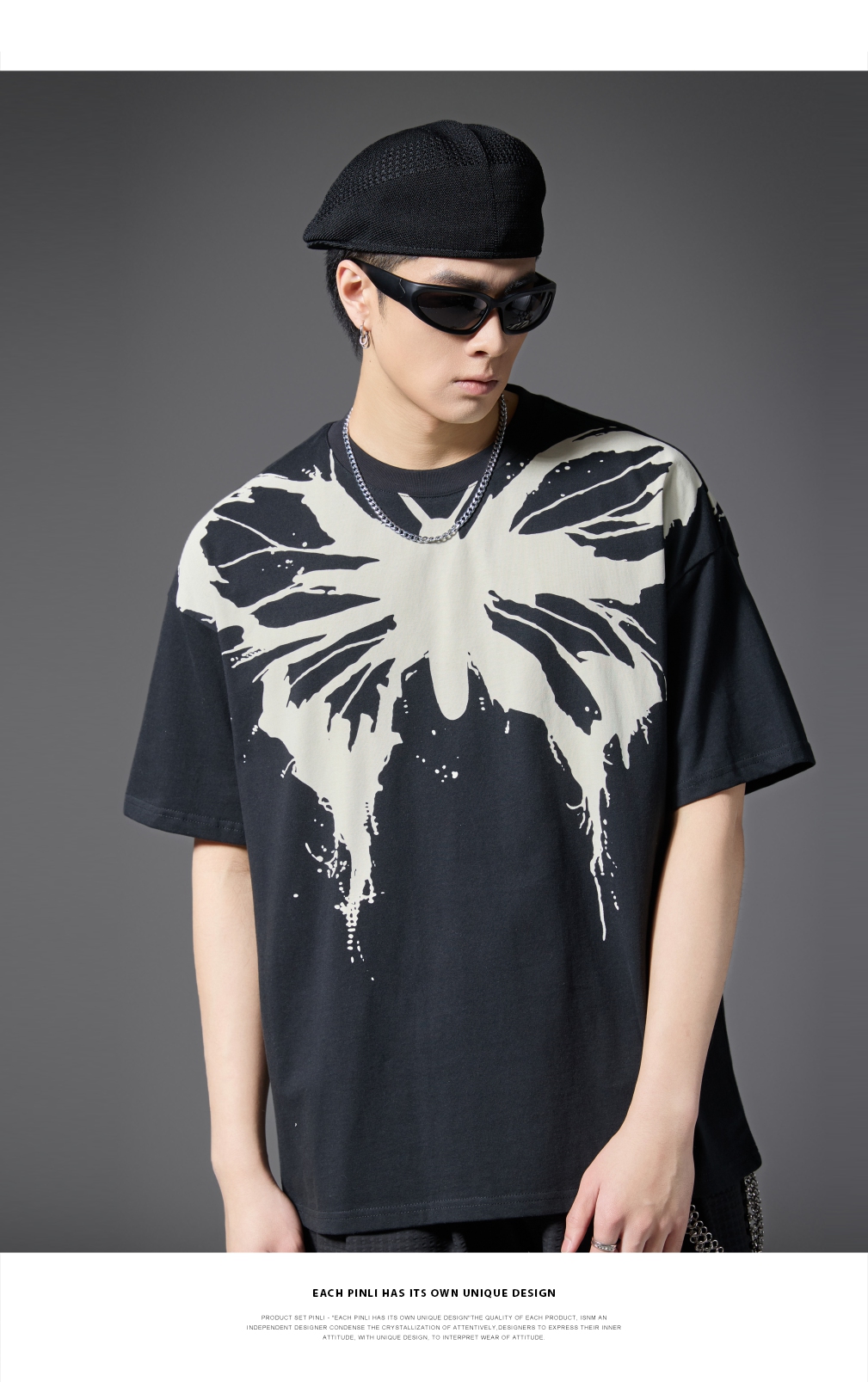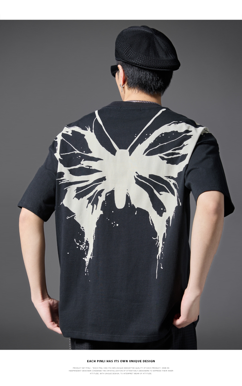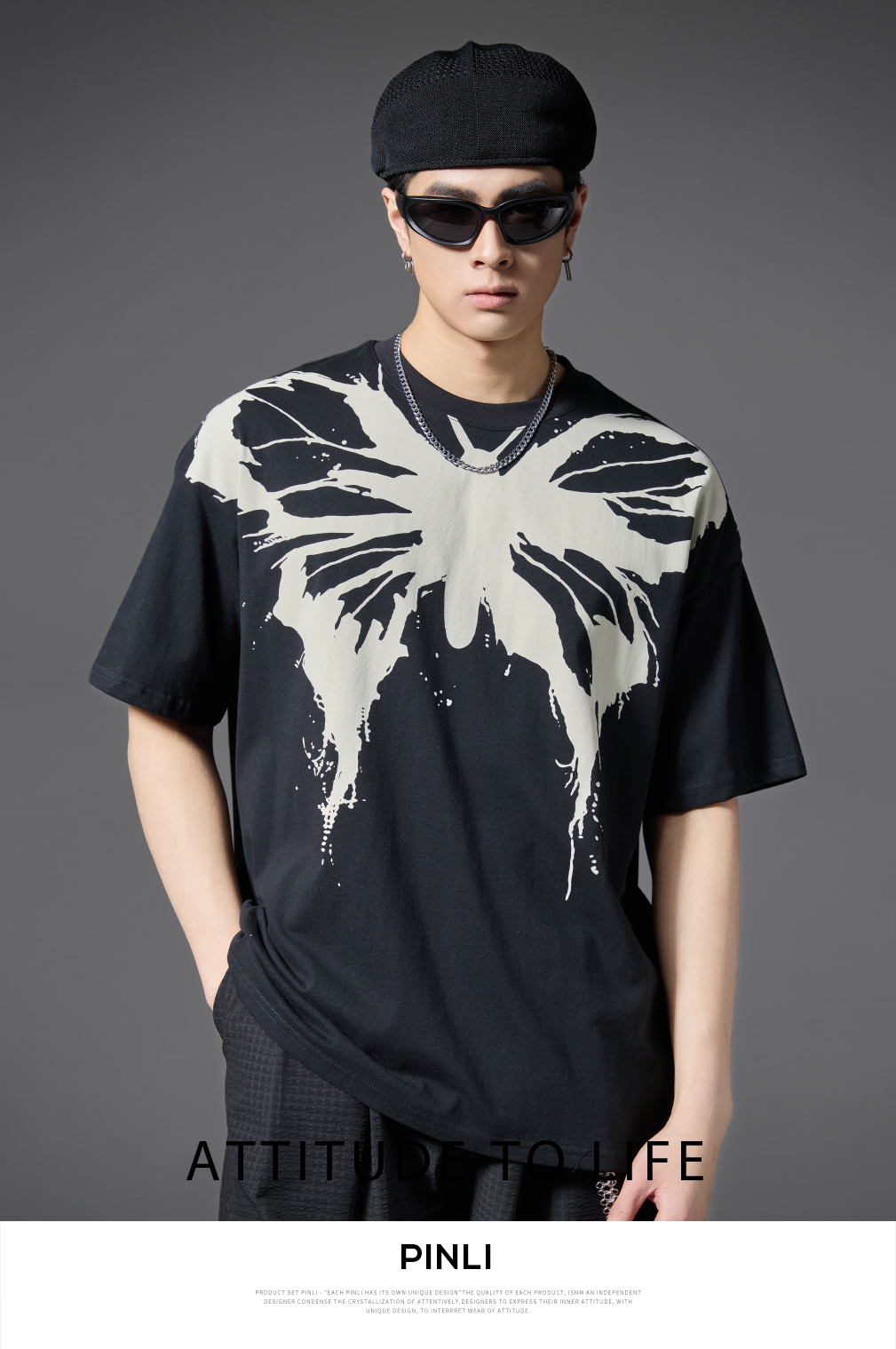 PINLI品立2025春夏新款男蝴蝶印花圆领休闲短袖T恤上衣B252111010