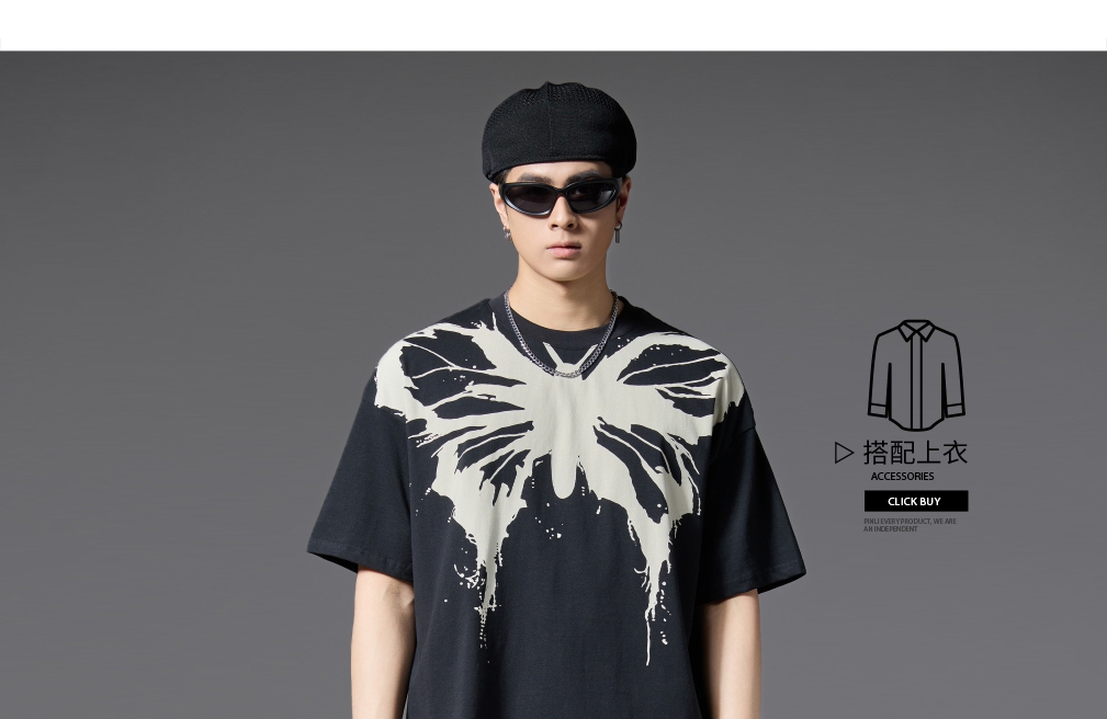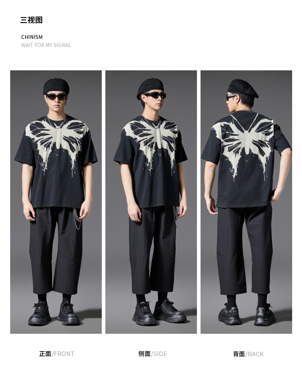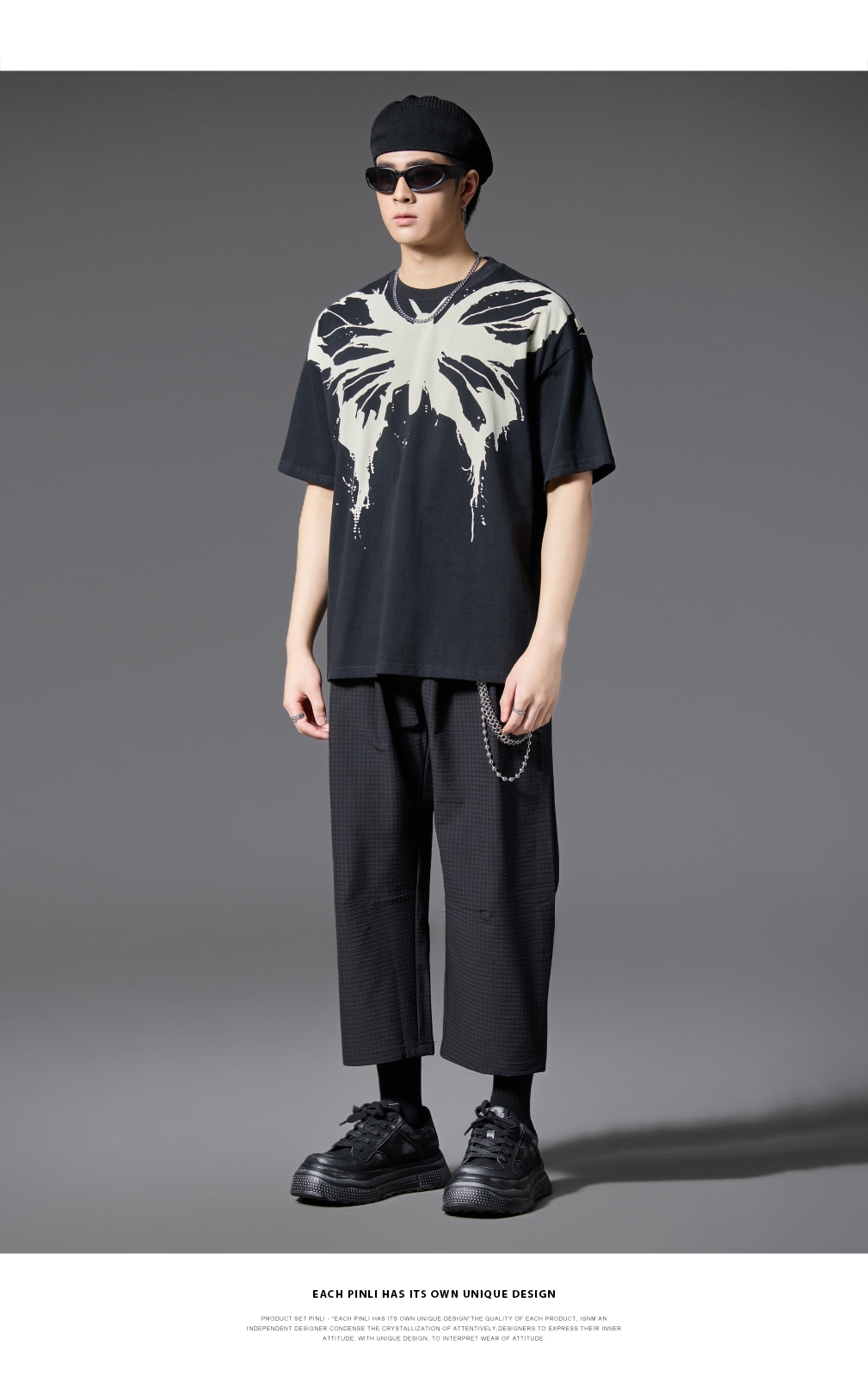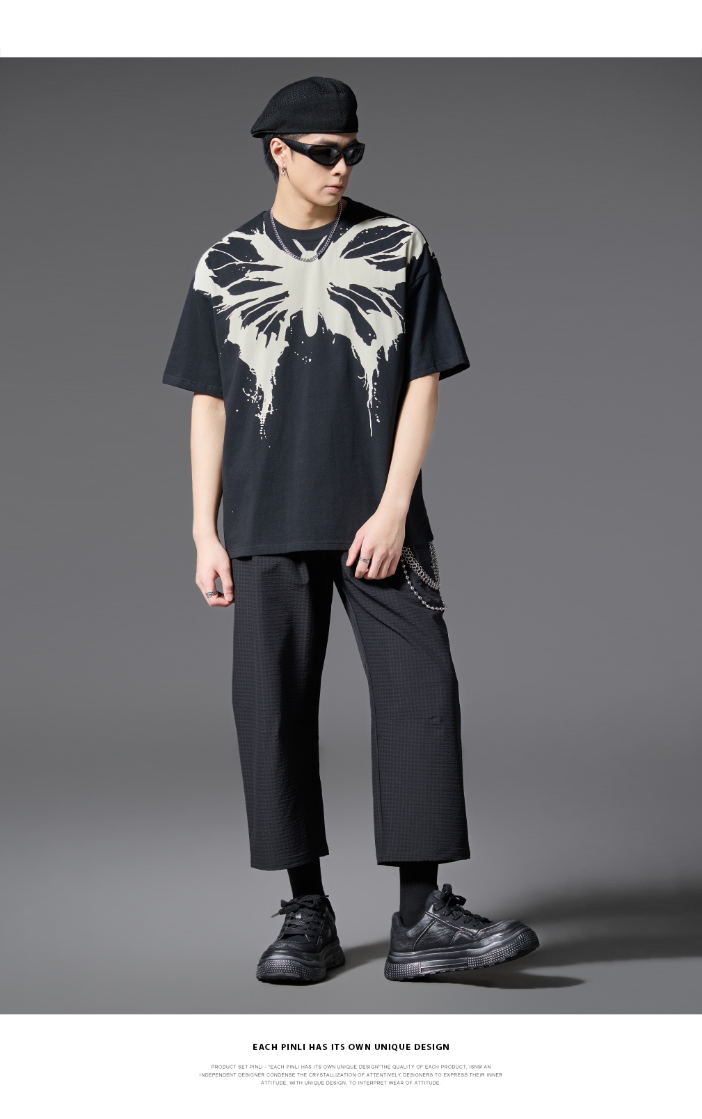 PINLI品立2025春夏新款男蝴蝶印花圆领休闲短袖T恤上衣B252111010
