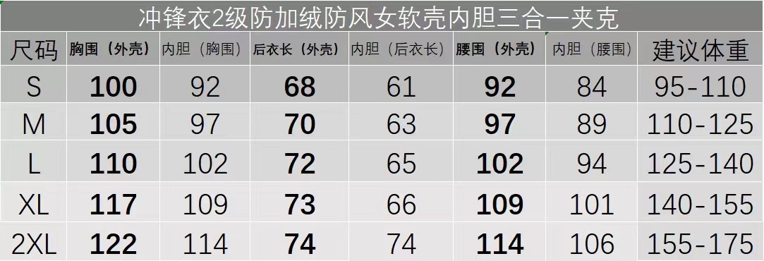 26年新款可隆冲锋衣2级防泼水防风男女软壳内胆三合一夹克女士加绒三合一冲锋衣来啦!外壳全方面压胶加激光切割技术,真正的复刻。没有一丝改动。腰部弹力收腰更显身材,不会显得特别臃肿。袖口魔术贴可自由调节松紧(魔术贴Logo 与原版一致)水洗标可支持NFC扫描。高密度防风效果,所有拼接处都做了压胶处理!内胆加绒保暖。品质请放心!强悍来袭!客供定制的面料,高密防风防水透气面料,真正的3D立体裁剪,侧缝包边技术,袖口添加松紧可自由调节 真正做到贴合身材比例, 防风保暖 细节做工各方面都很到位,糕级感拉满!