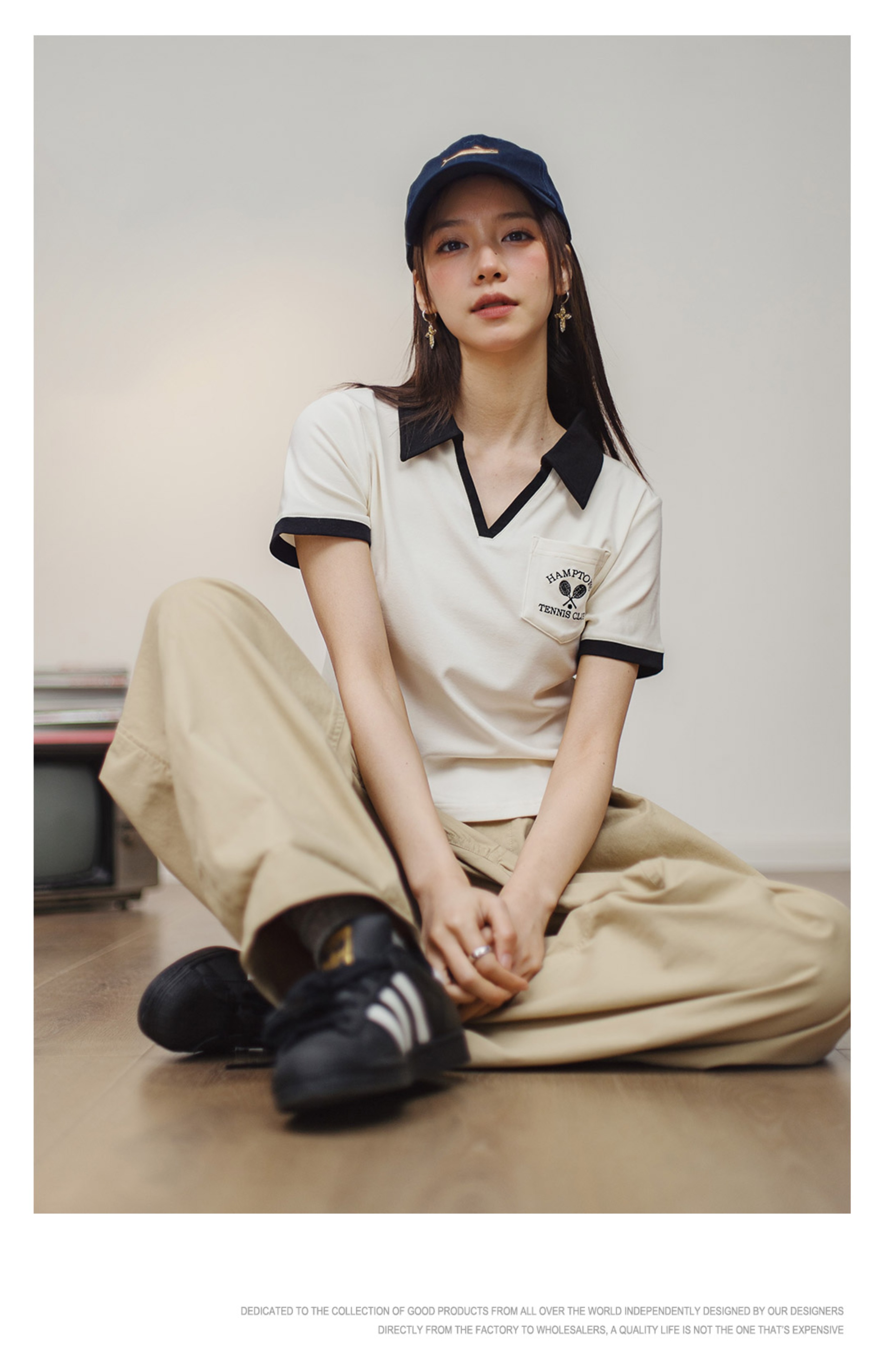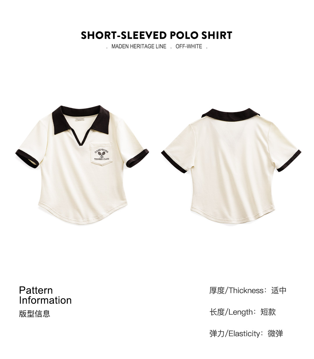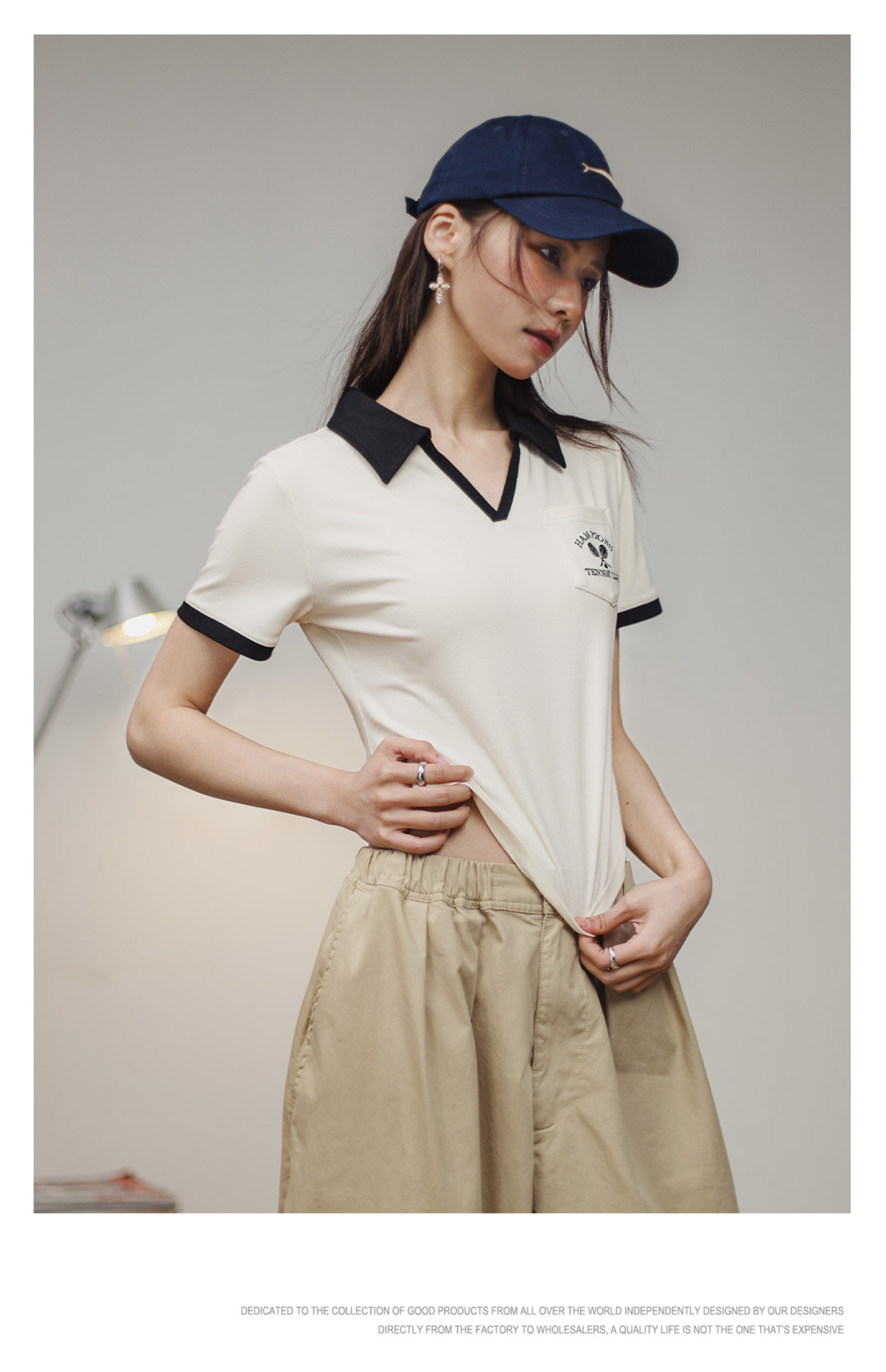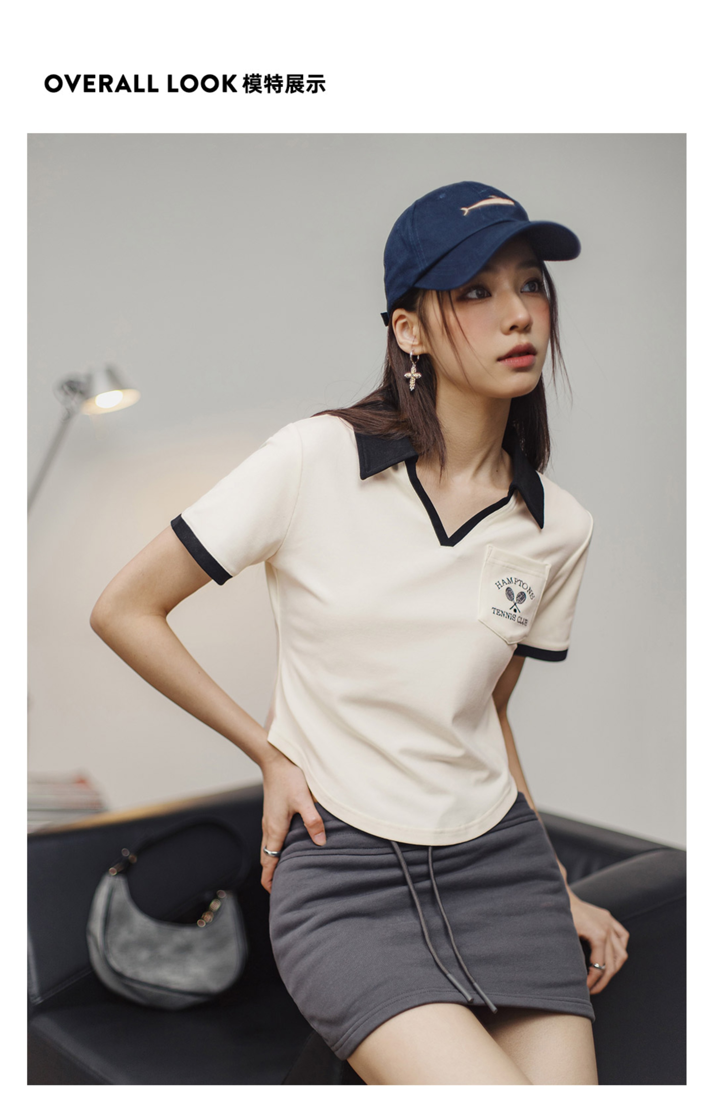 马登复古V领Polo衫正肩显瘦短袖修身T恤小众设计老钱风撞色上衣女