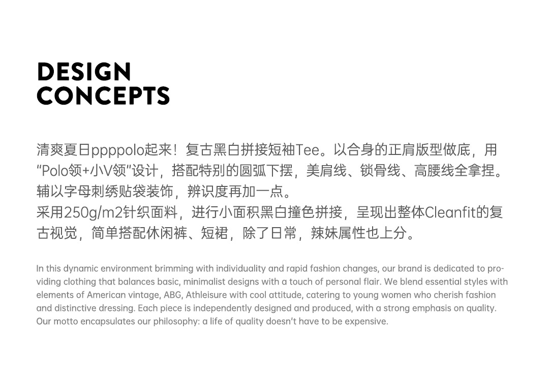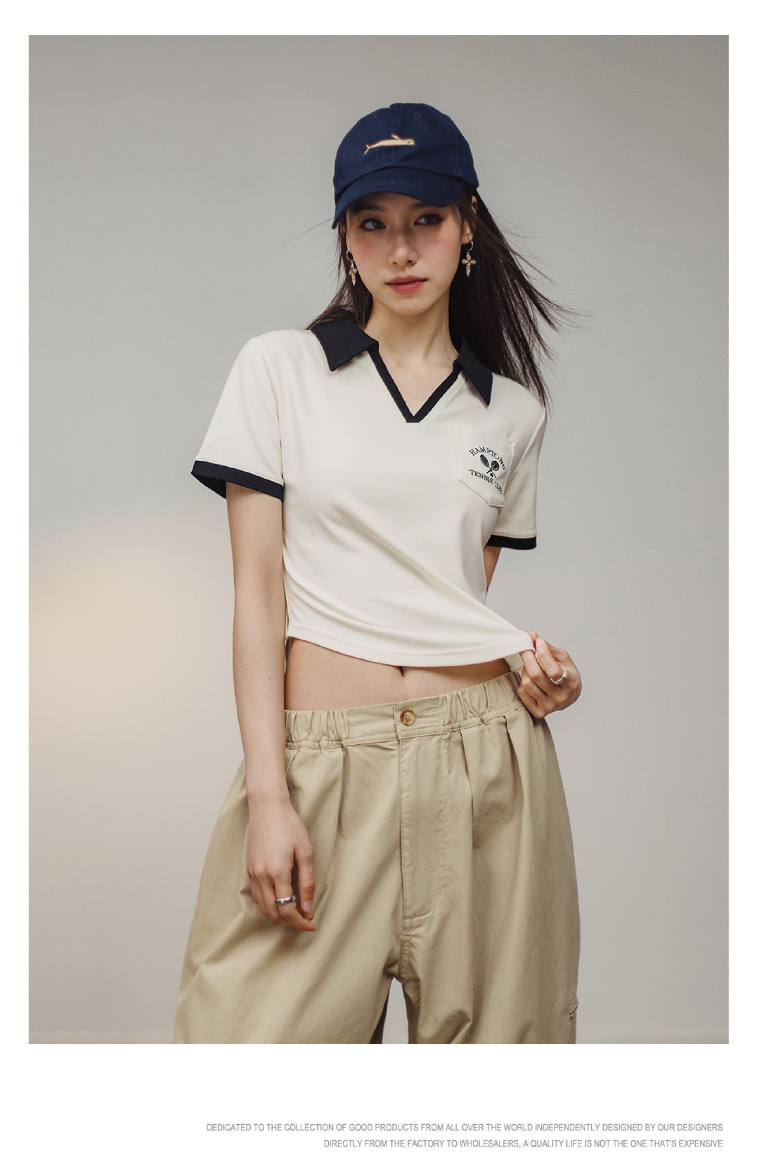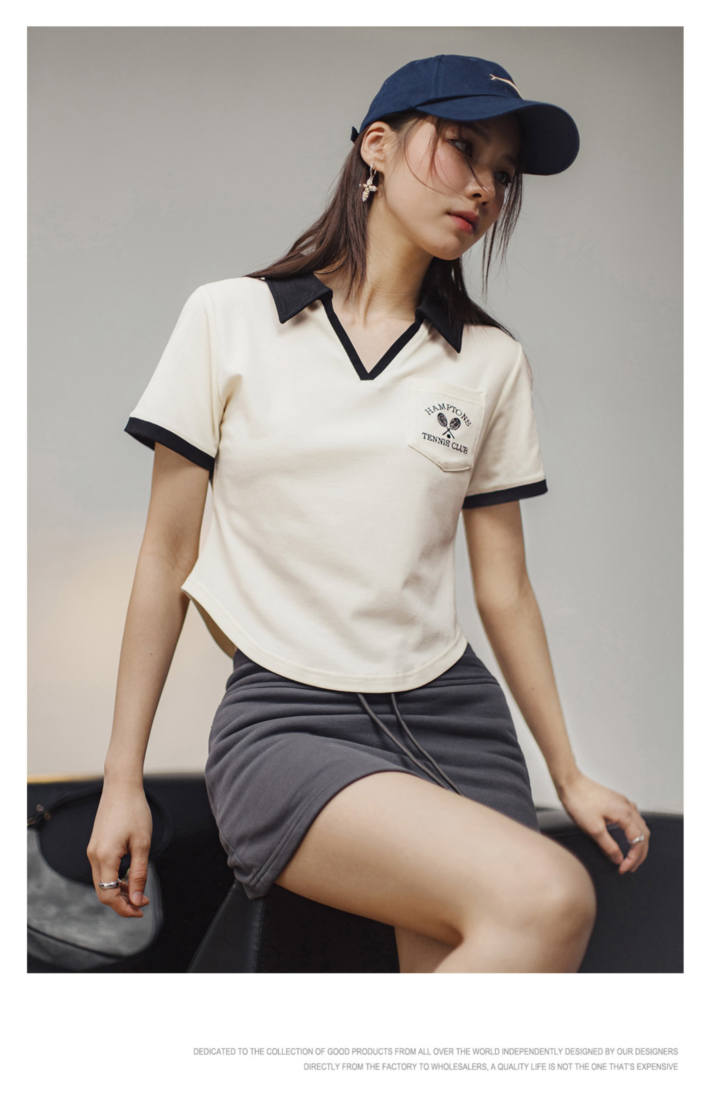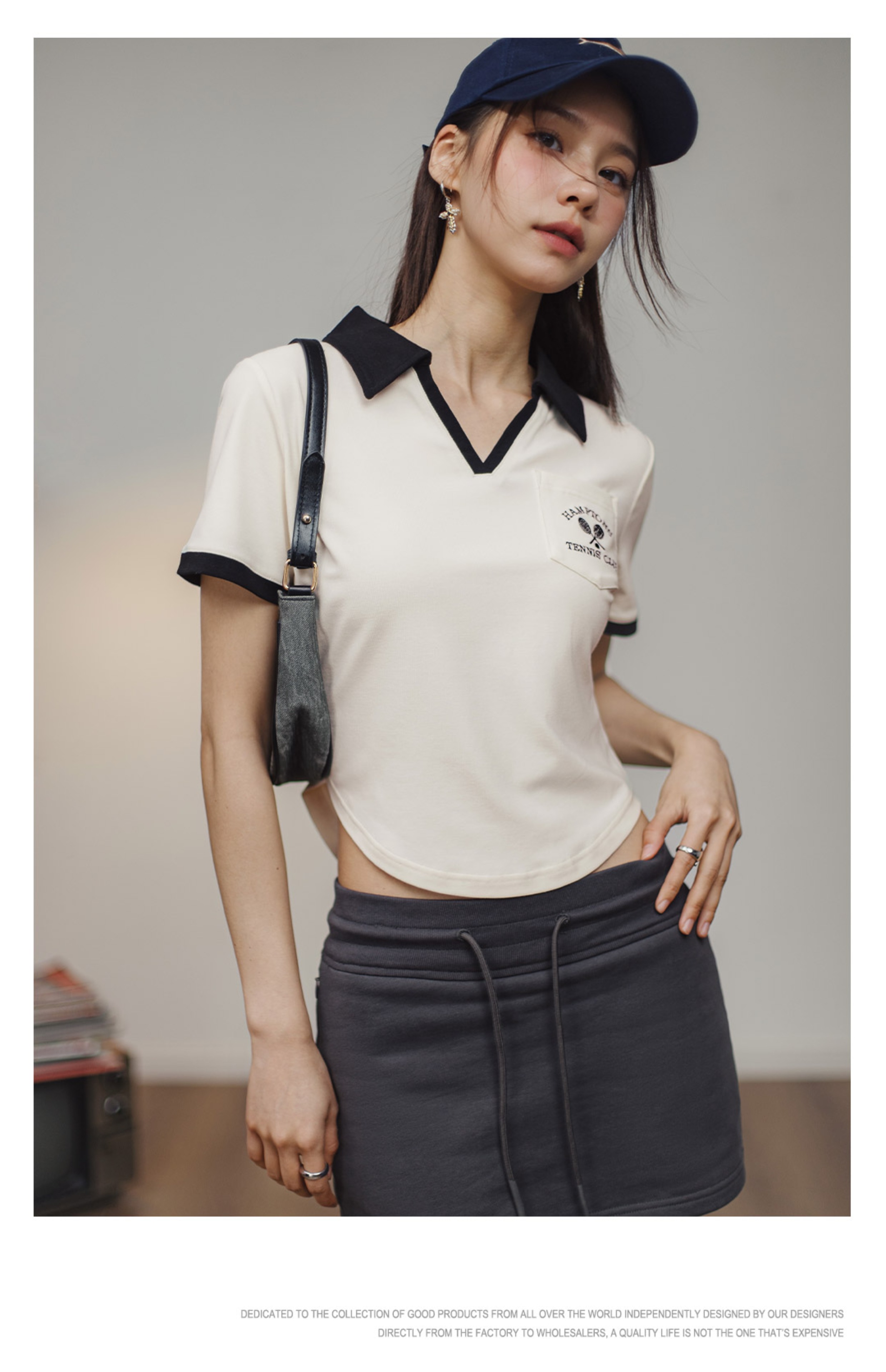 马登复古V领Polo衫正肩显瘦短袖修身T恤小众设计老钱风撞色上衣女