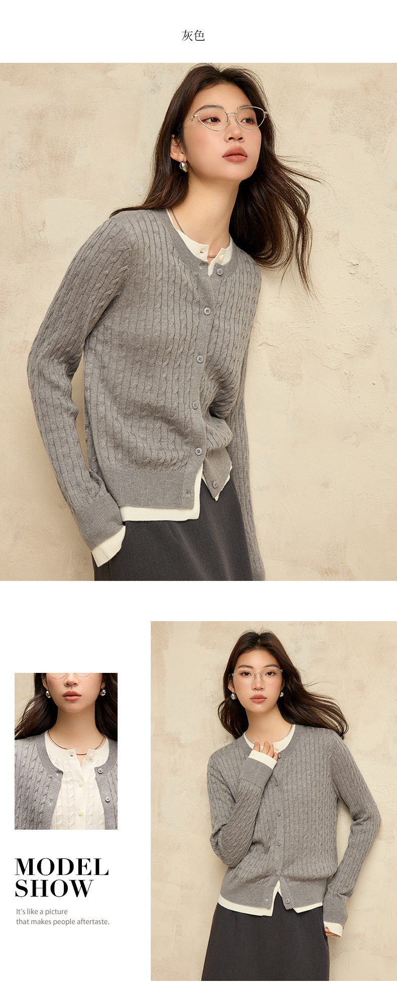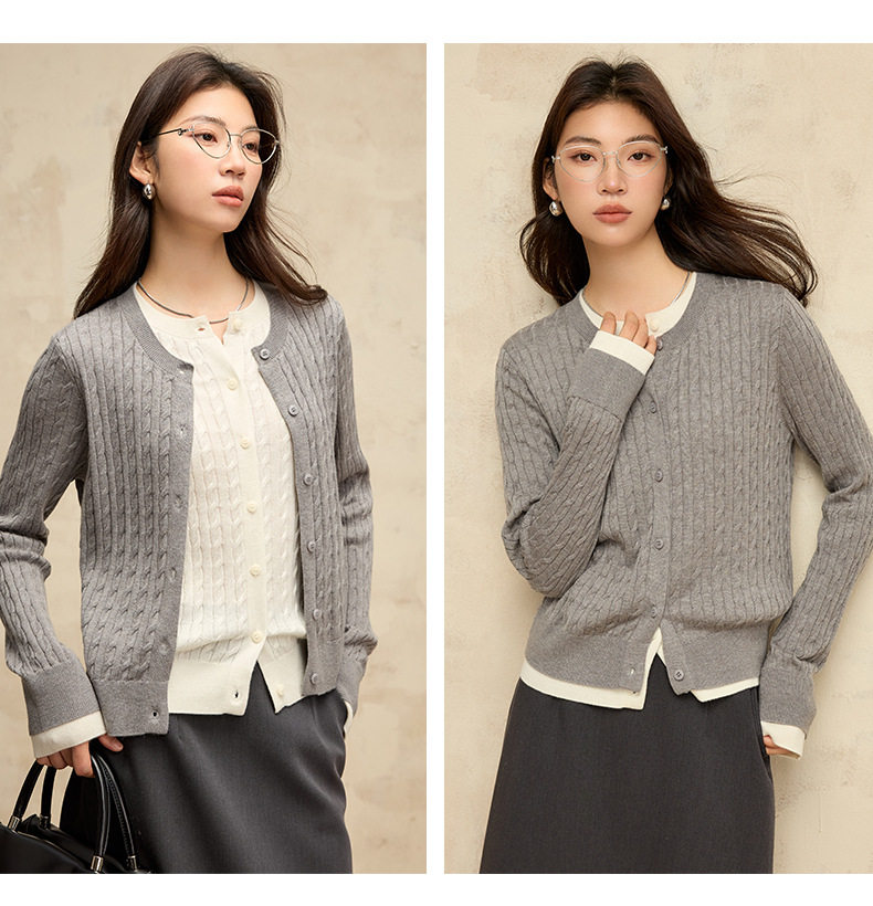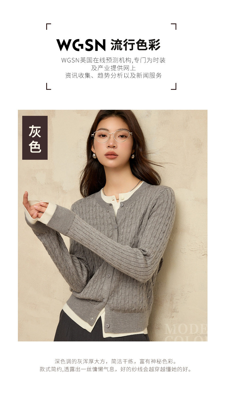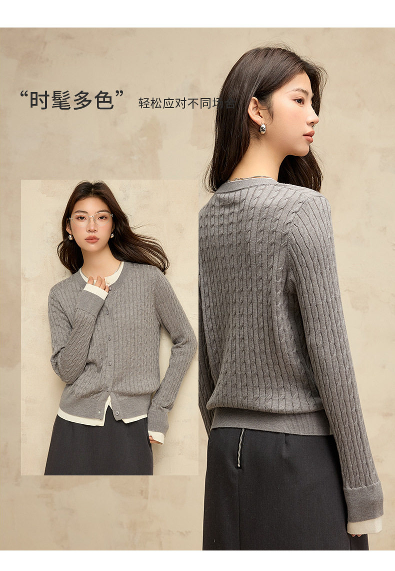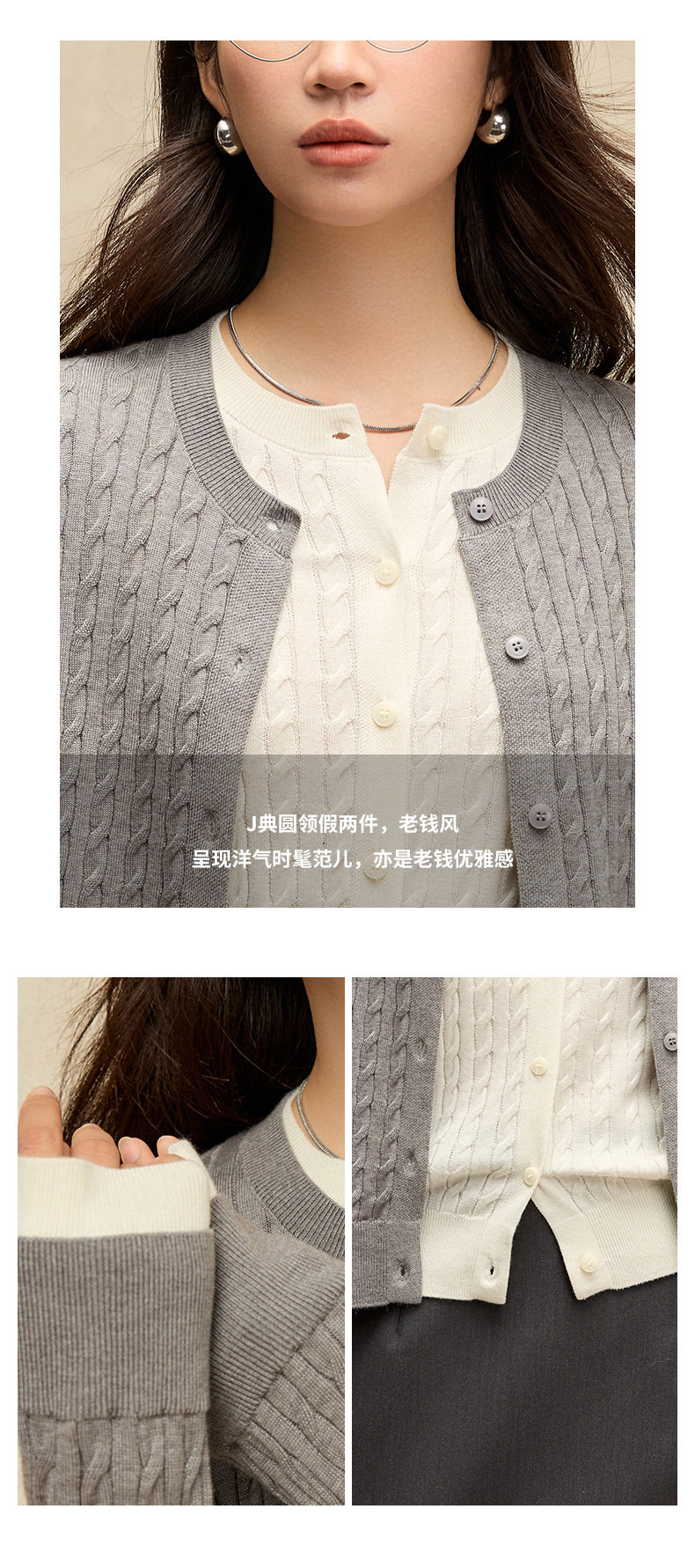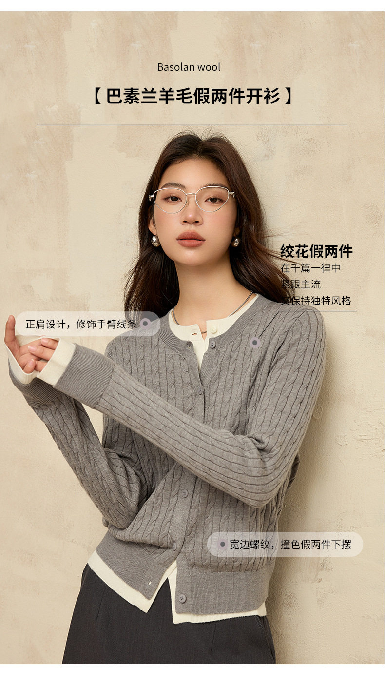 高级感假两件撞色圆领羊毛外套女24秋季新款时尚宽松麻花针织开衫