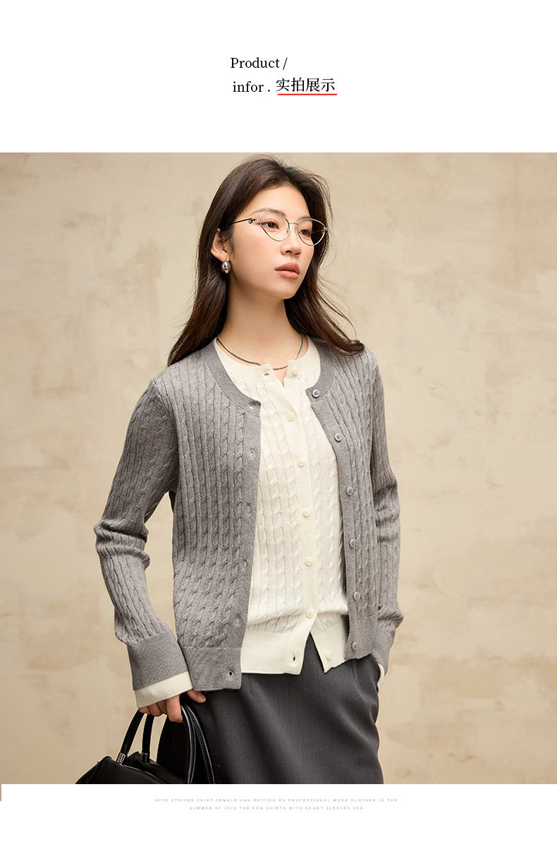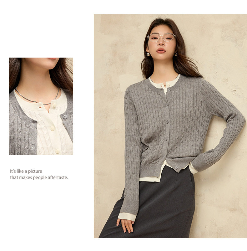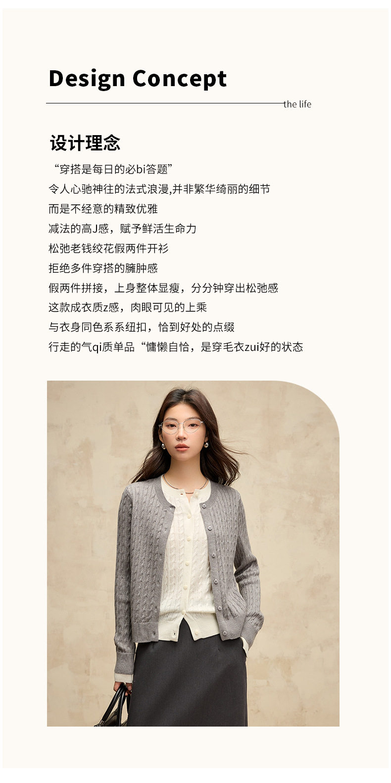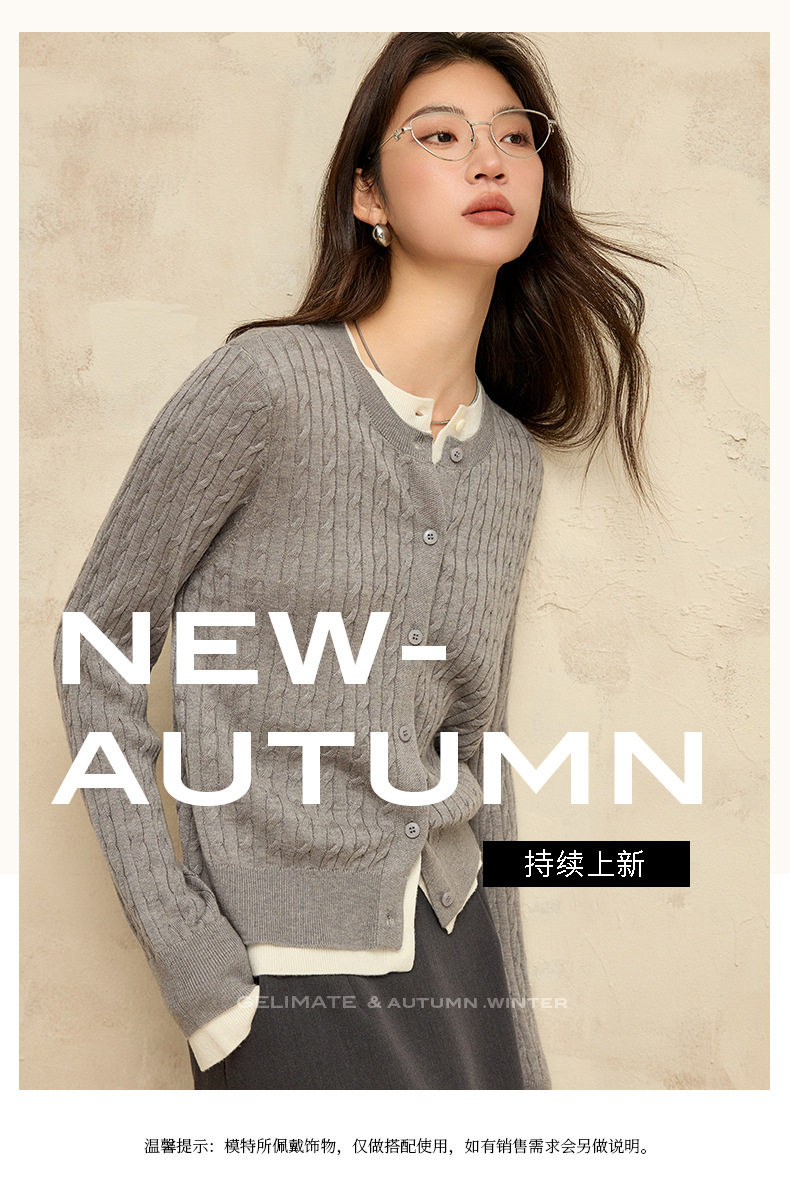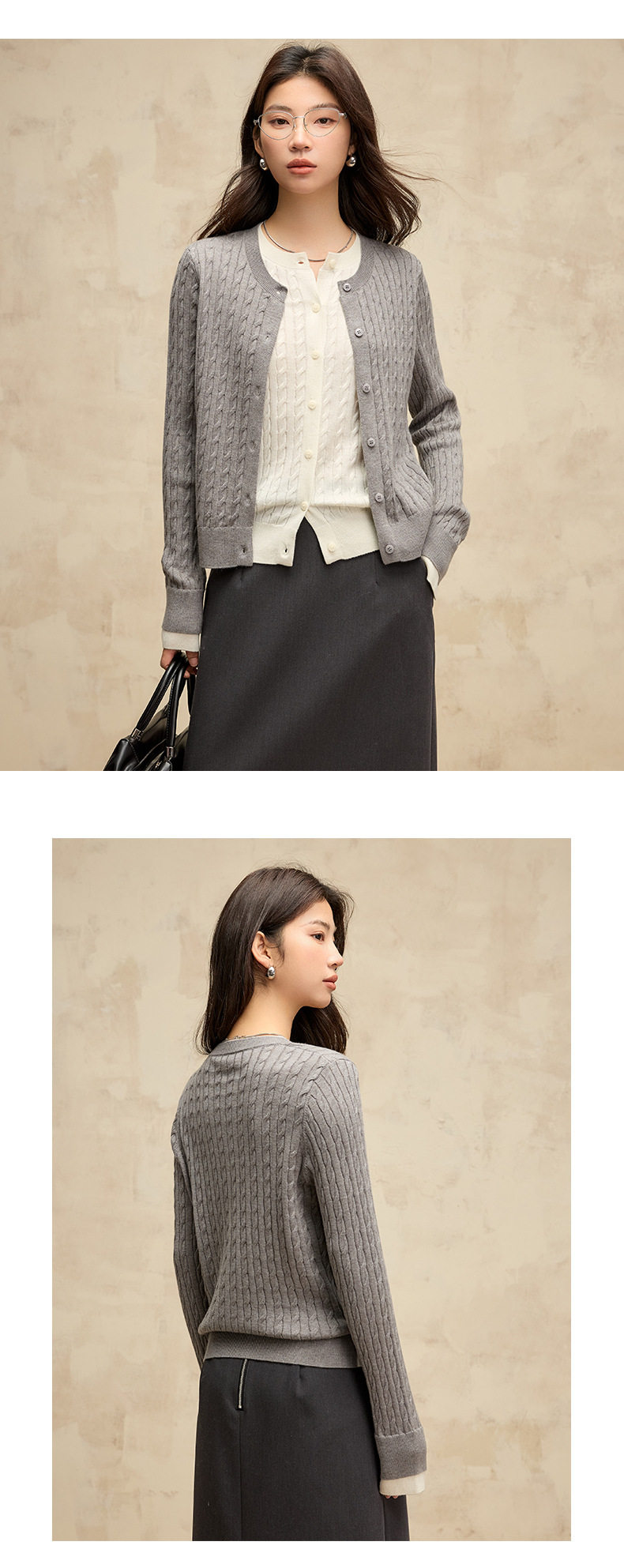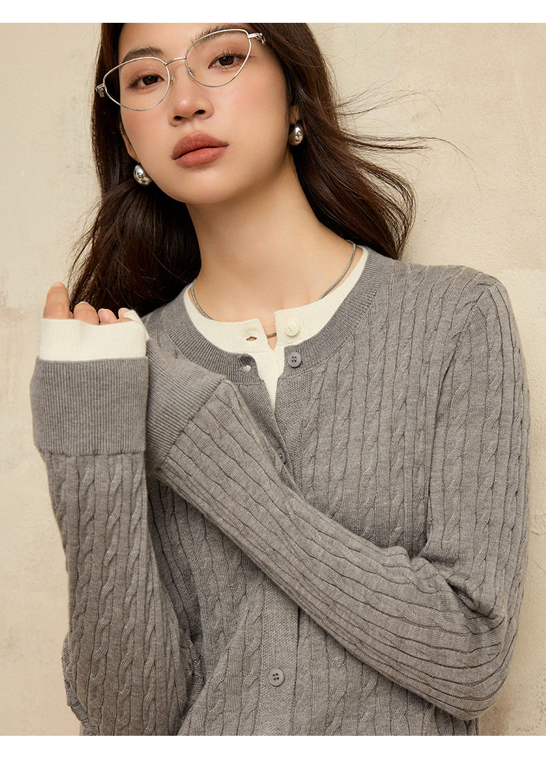 高级感假两件撞色圆领羊毛外套女24秋季新款时尚宽松麻花针织开衫