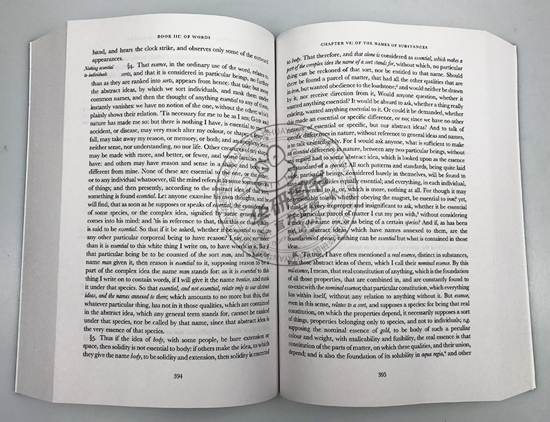 An Essay Concerning Human Understanding《人类理解论》是英国哲学家约翰·洛克关于经验论的哲学著作,它的任务是探究知识的性质和人类探究真理的能力。全书分为四卷:第一卷的内容是批评“天赋观念”论;第二卷主要研究作为知识的来源的“观念”,说明“实体”、“样式”、“关系”这些复杂观念是如何形成的;第三卷关注的是“话语”,阐述关于“概念”的学说、“名义本质”与“实在本质”学说;第四卷是“知识与意见”,阐述了洛克的知识论。