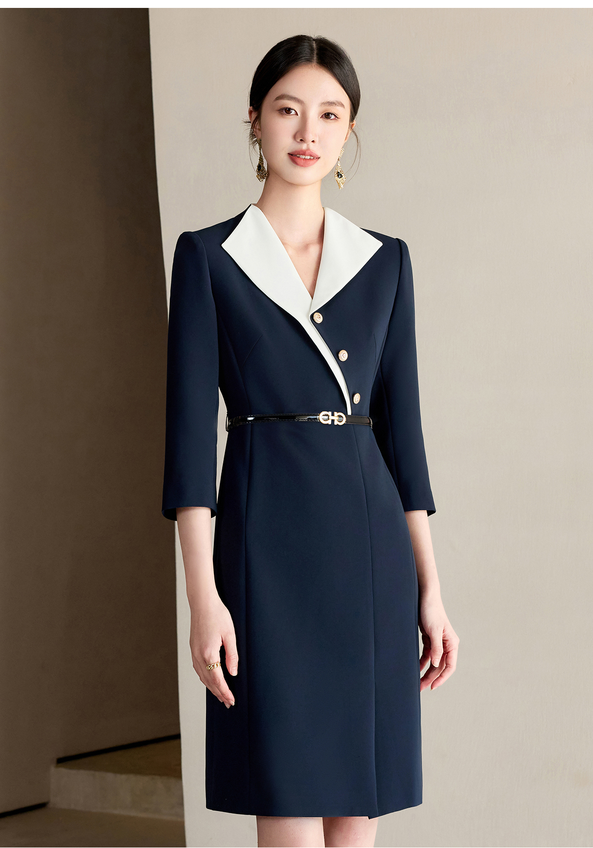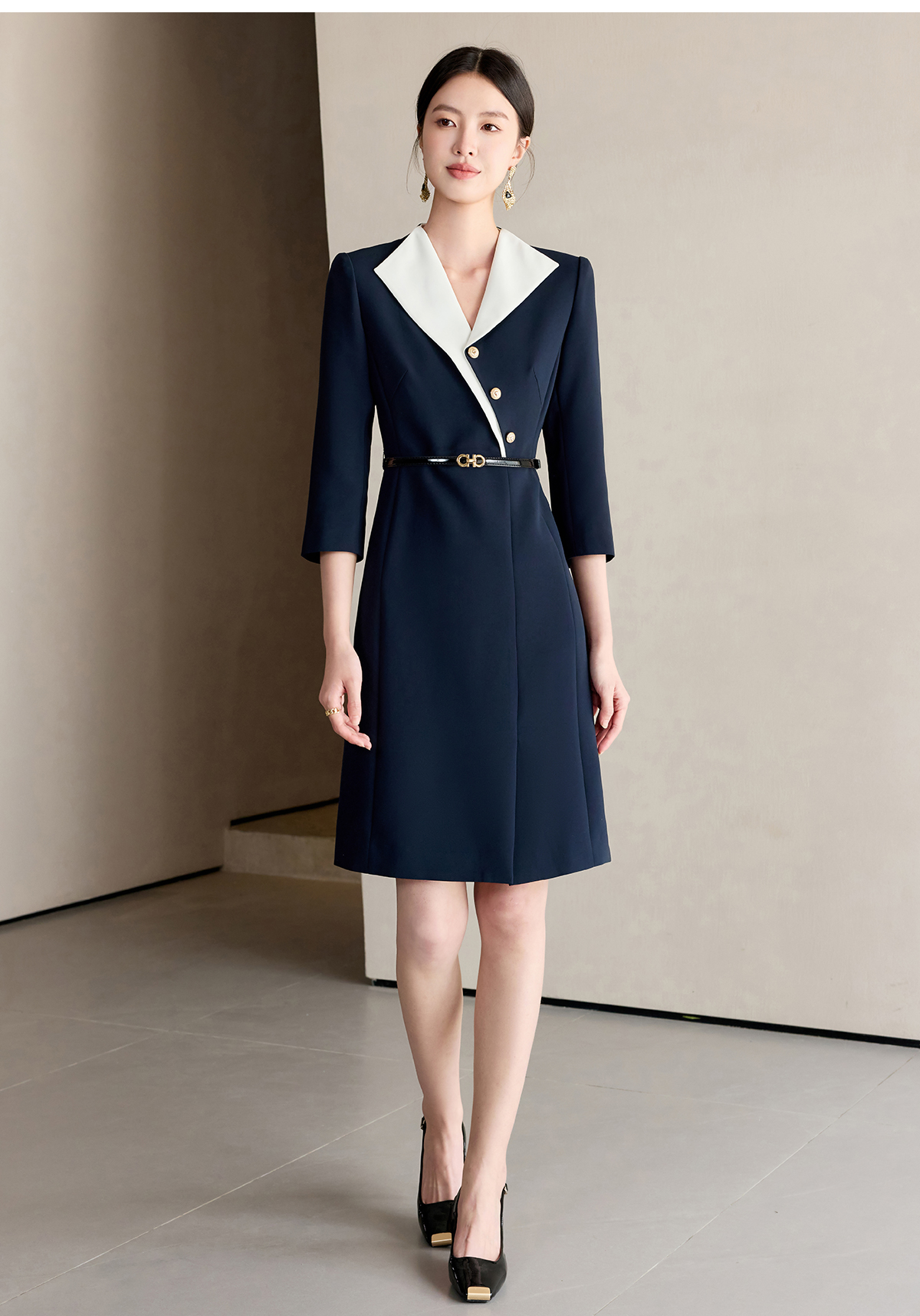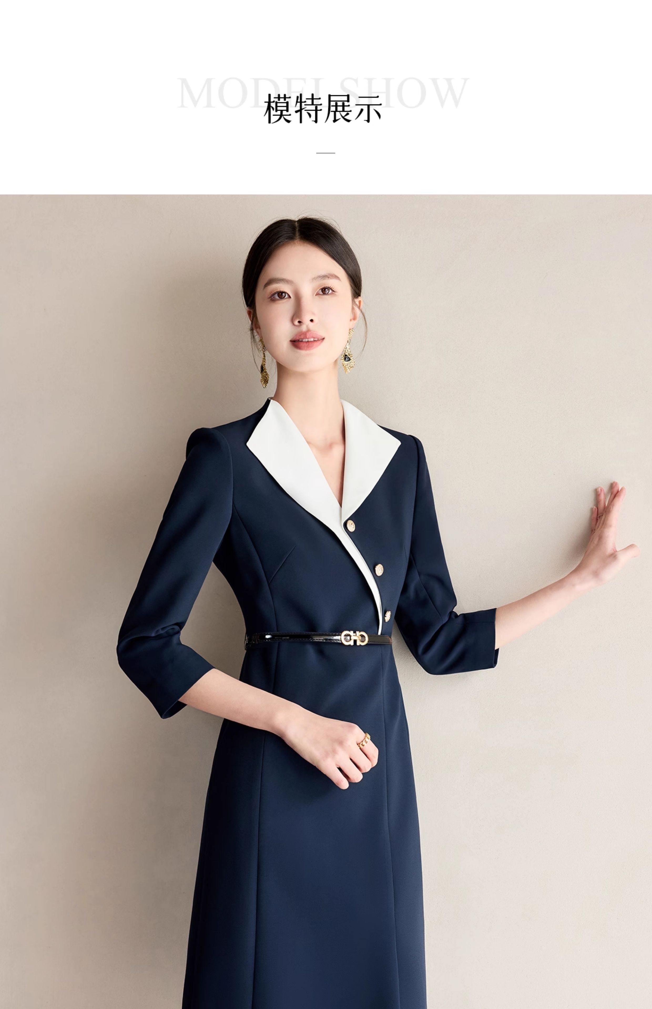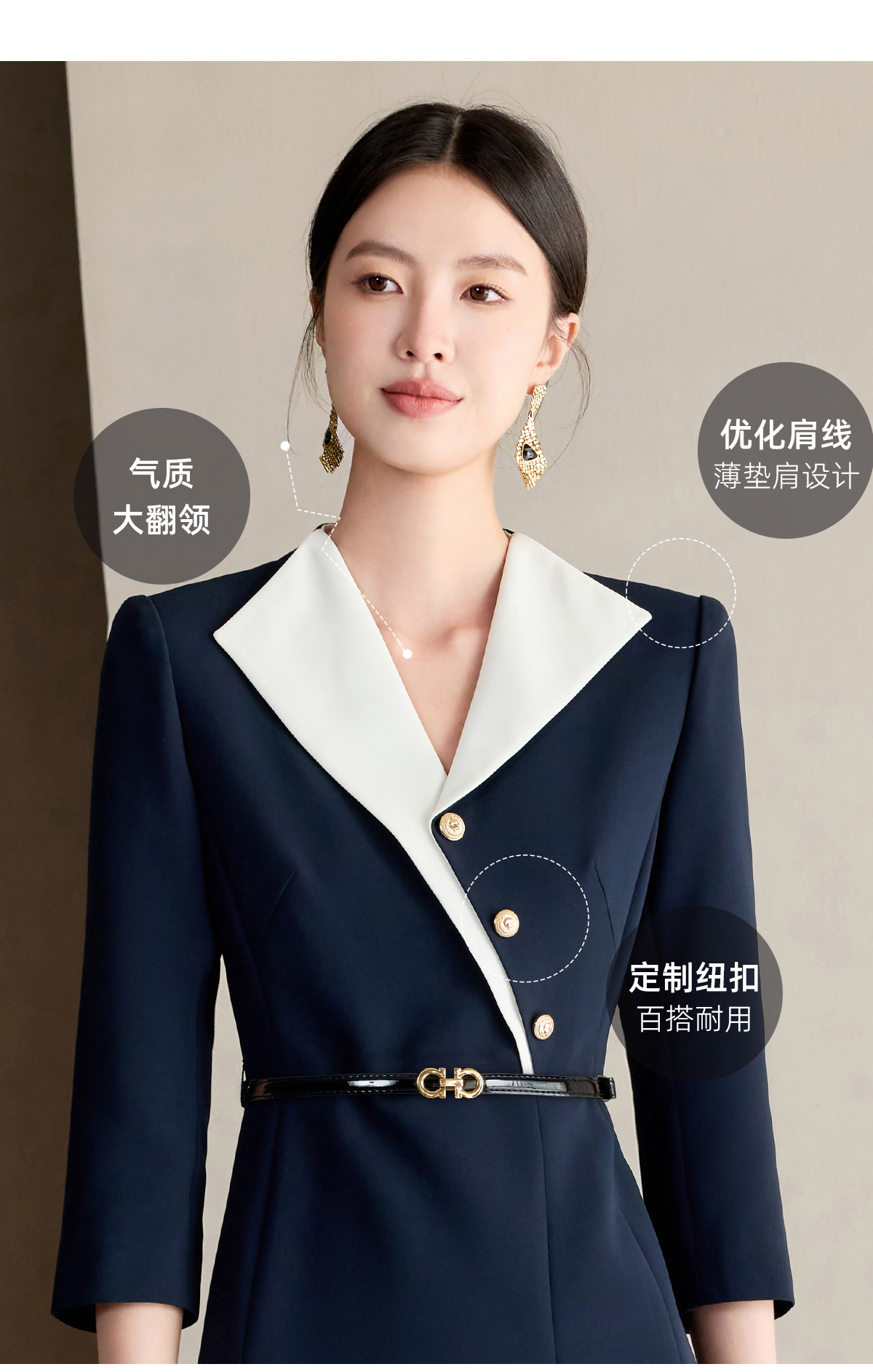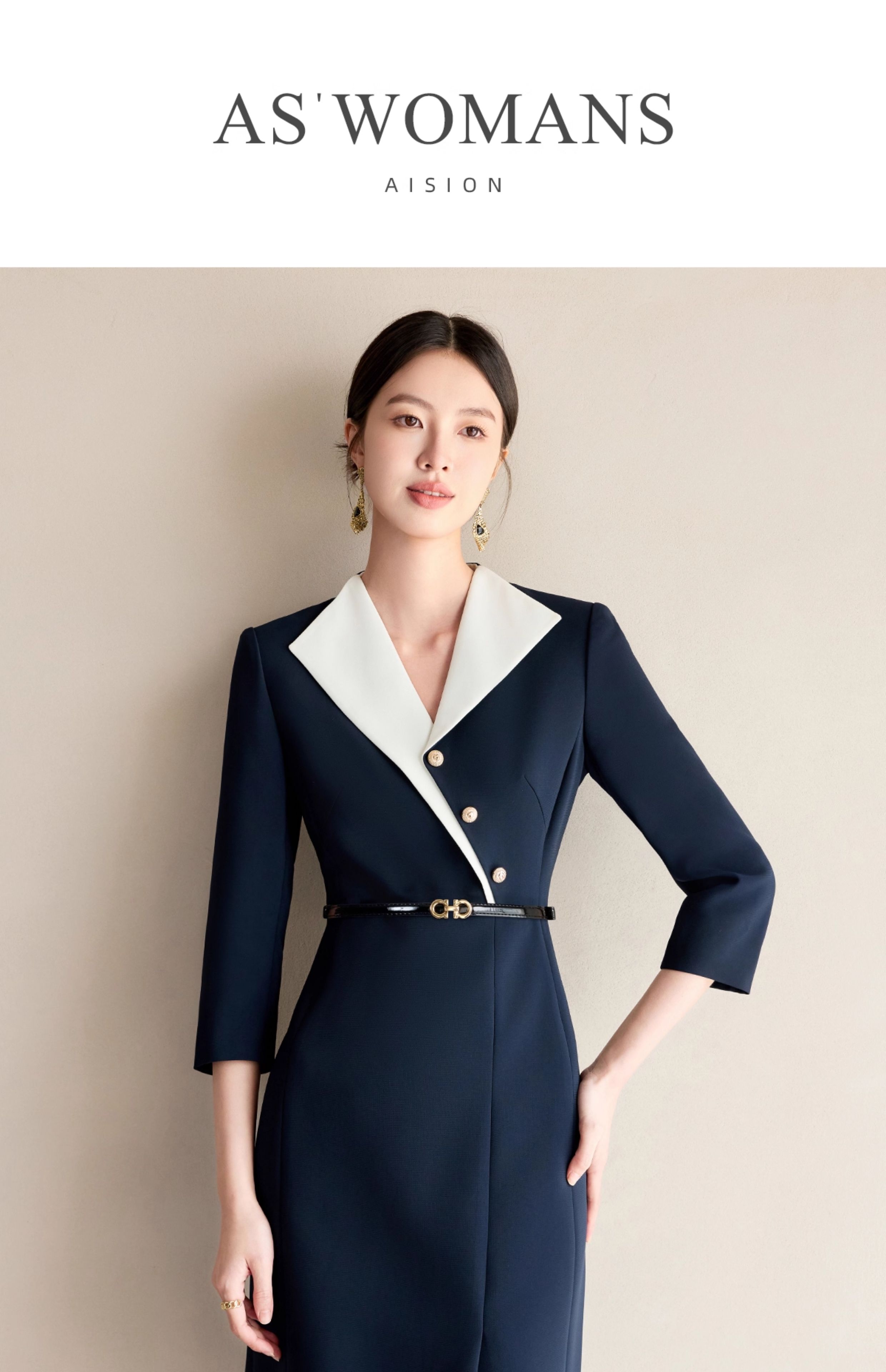 艾尚臣藏青色西装连衣裙高级感气质V领轻熟风连衣裙通勤职场正装