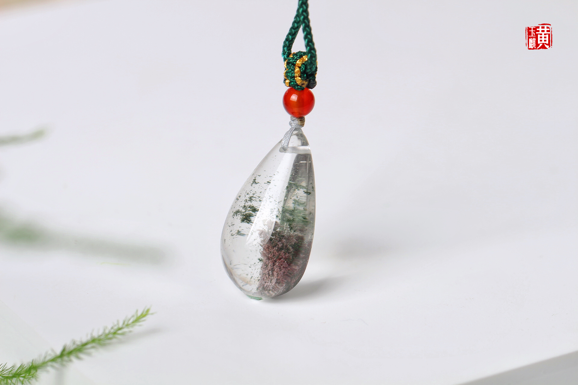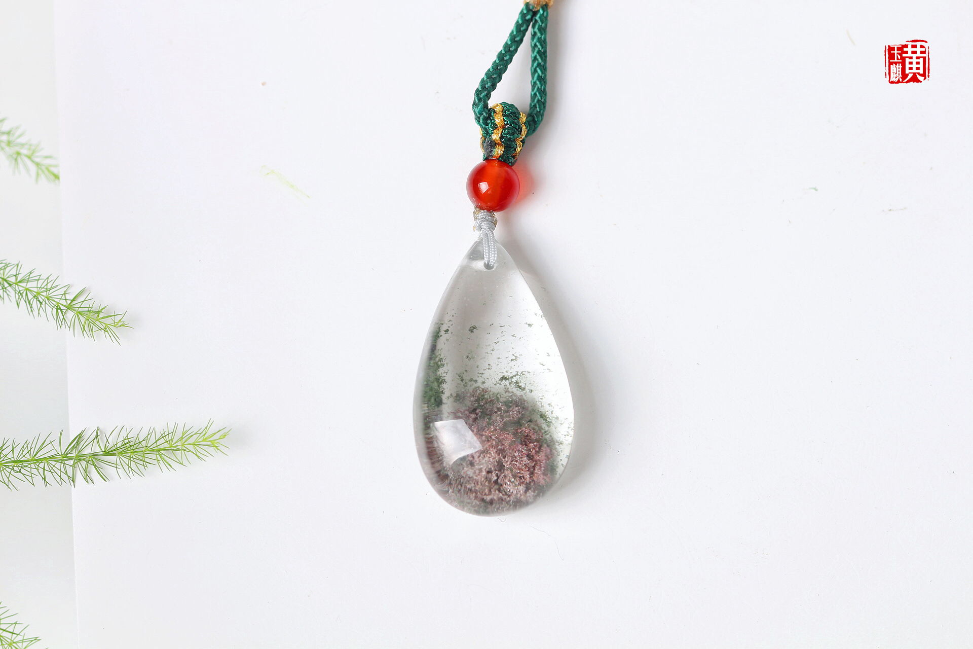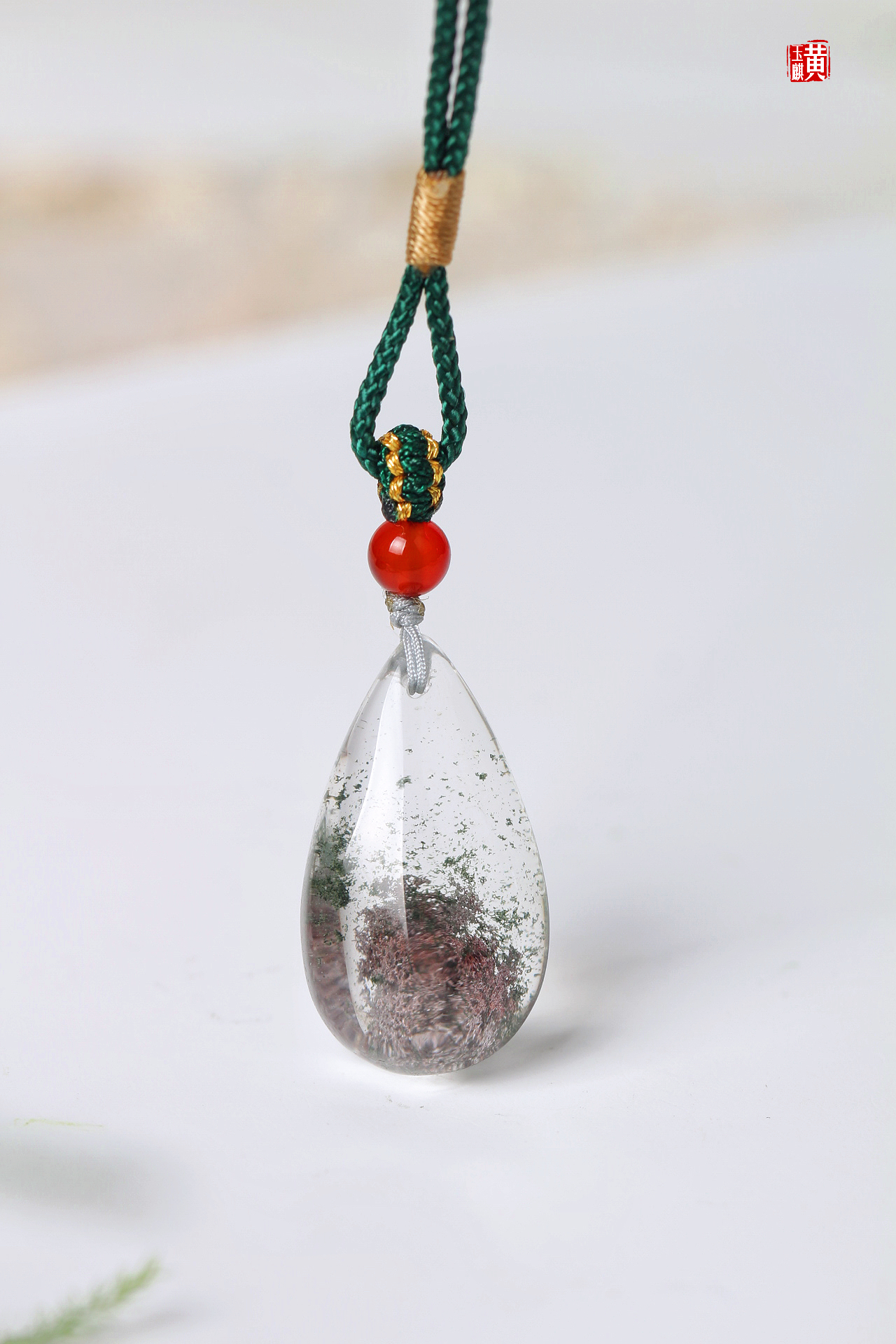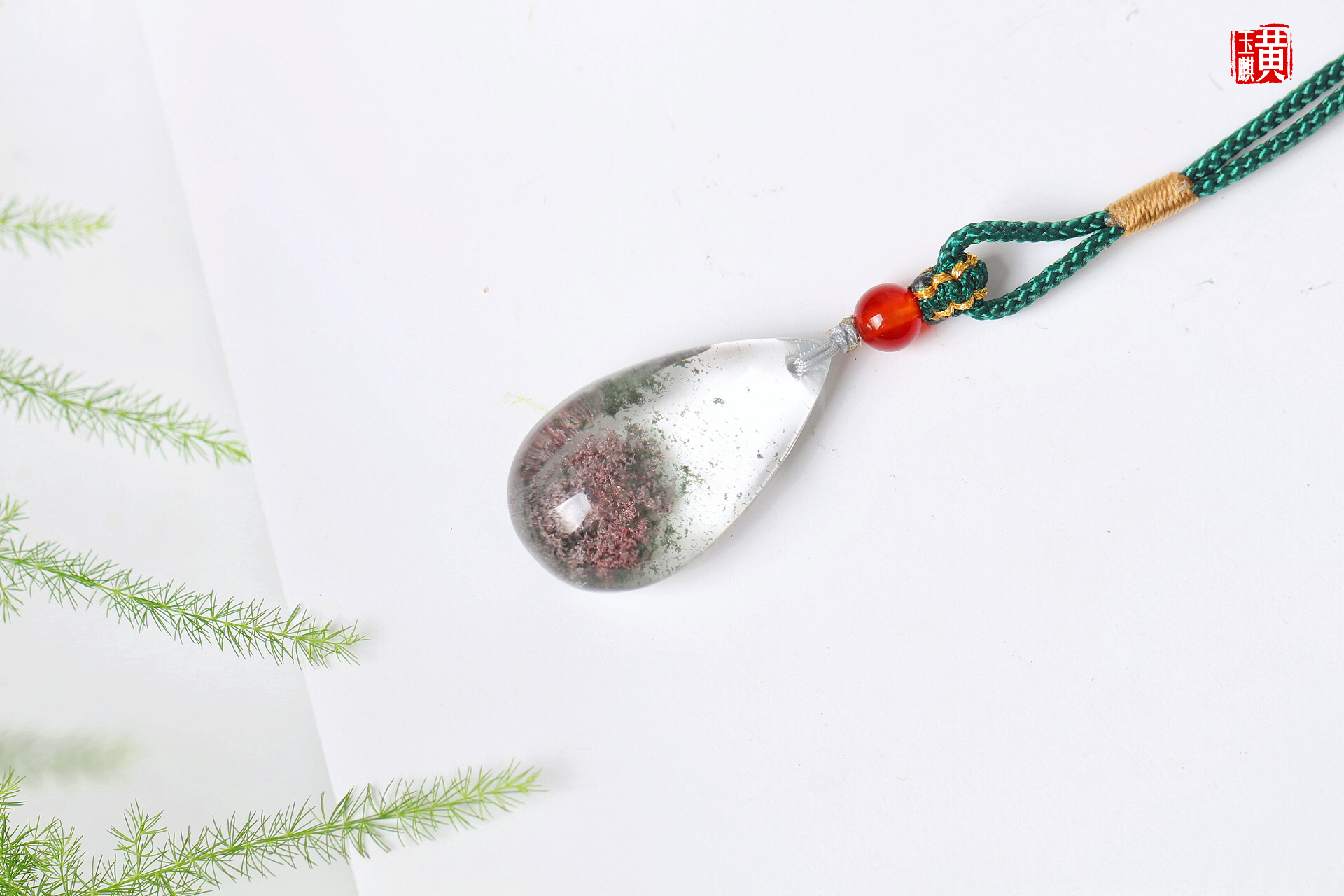 一枚通透的幽灵水晶吊坠,好看的水滴形,内含红幽灵和绿幽灵,如枫叶遍布山林,红幽灵寓意旺人缘感情、生活红火;绿幽灵寓意旺事业财运、聚财纳福,佩戴灵动别致。