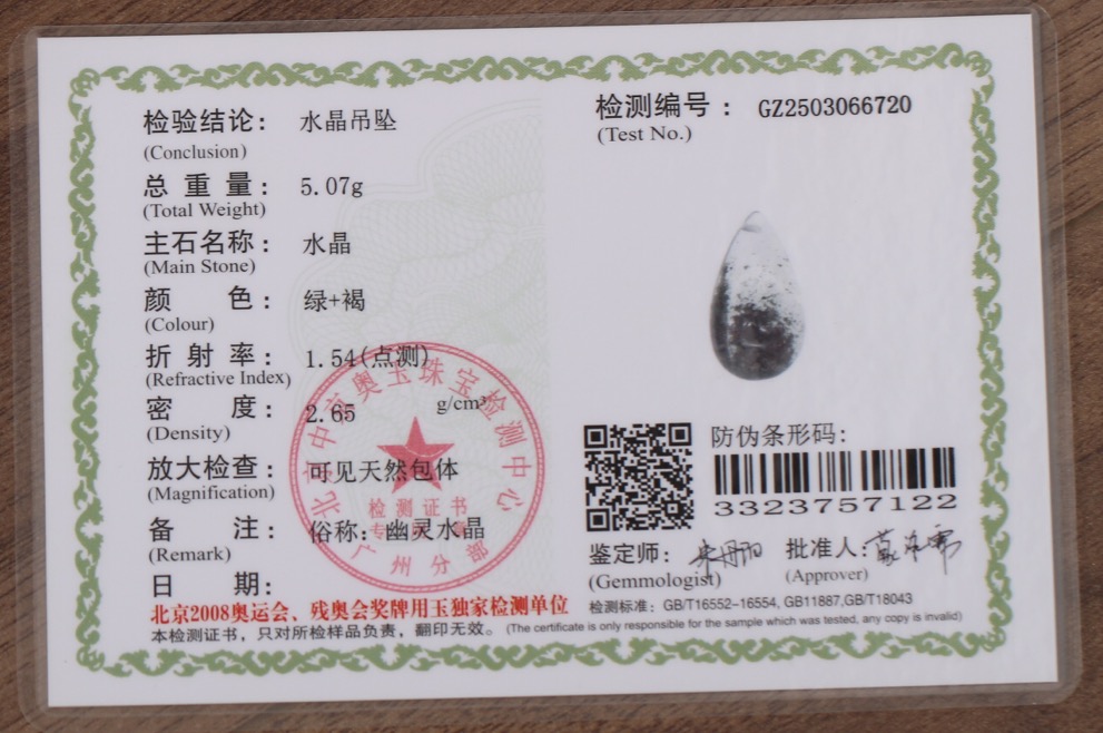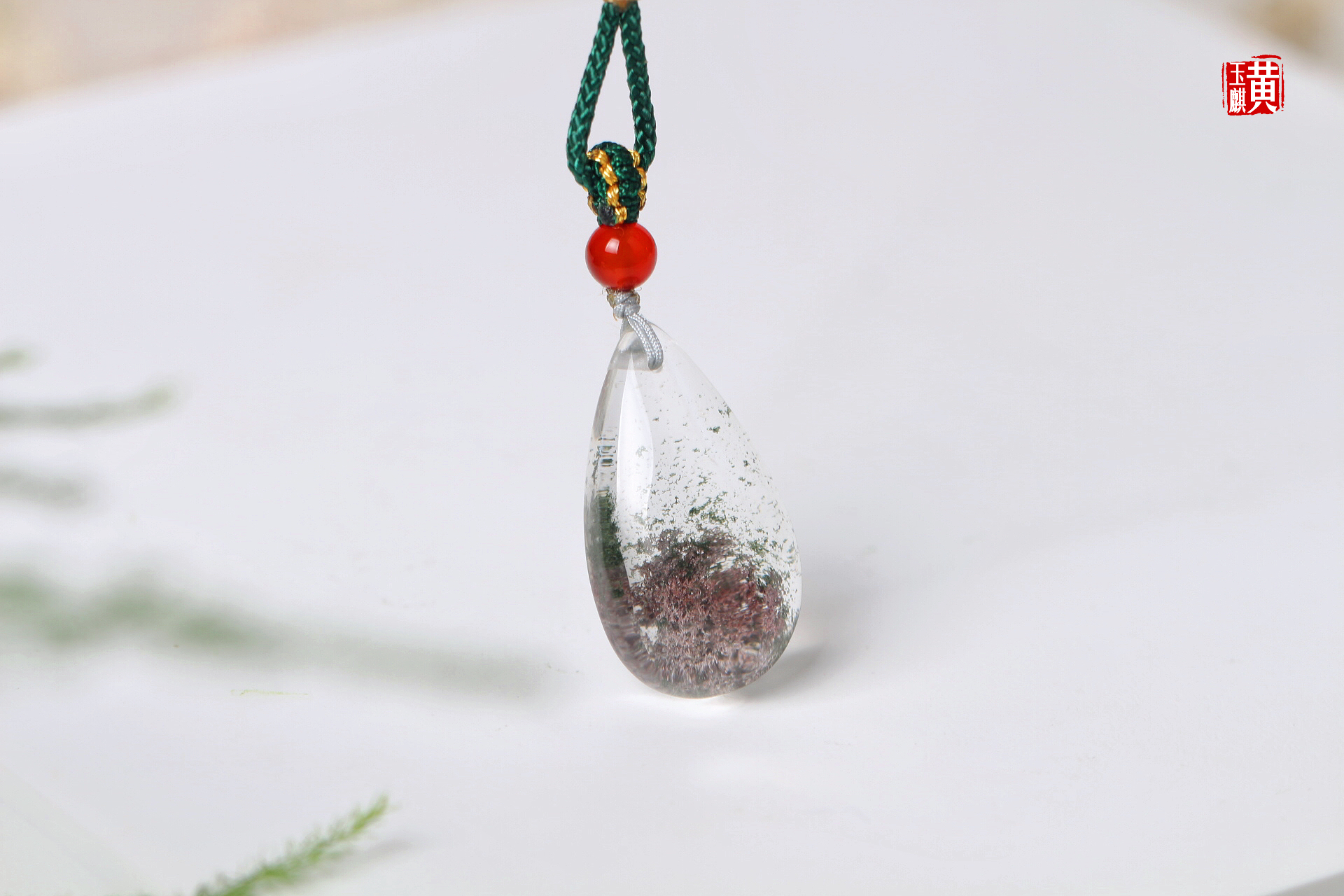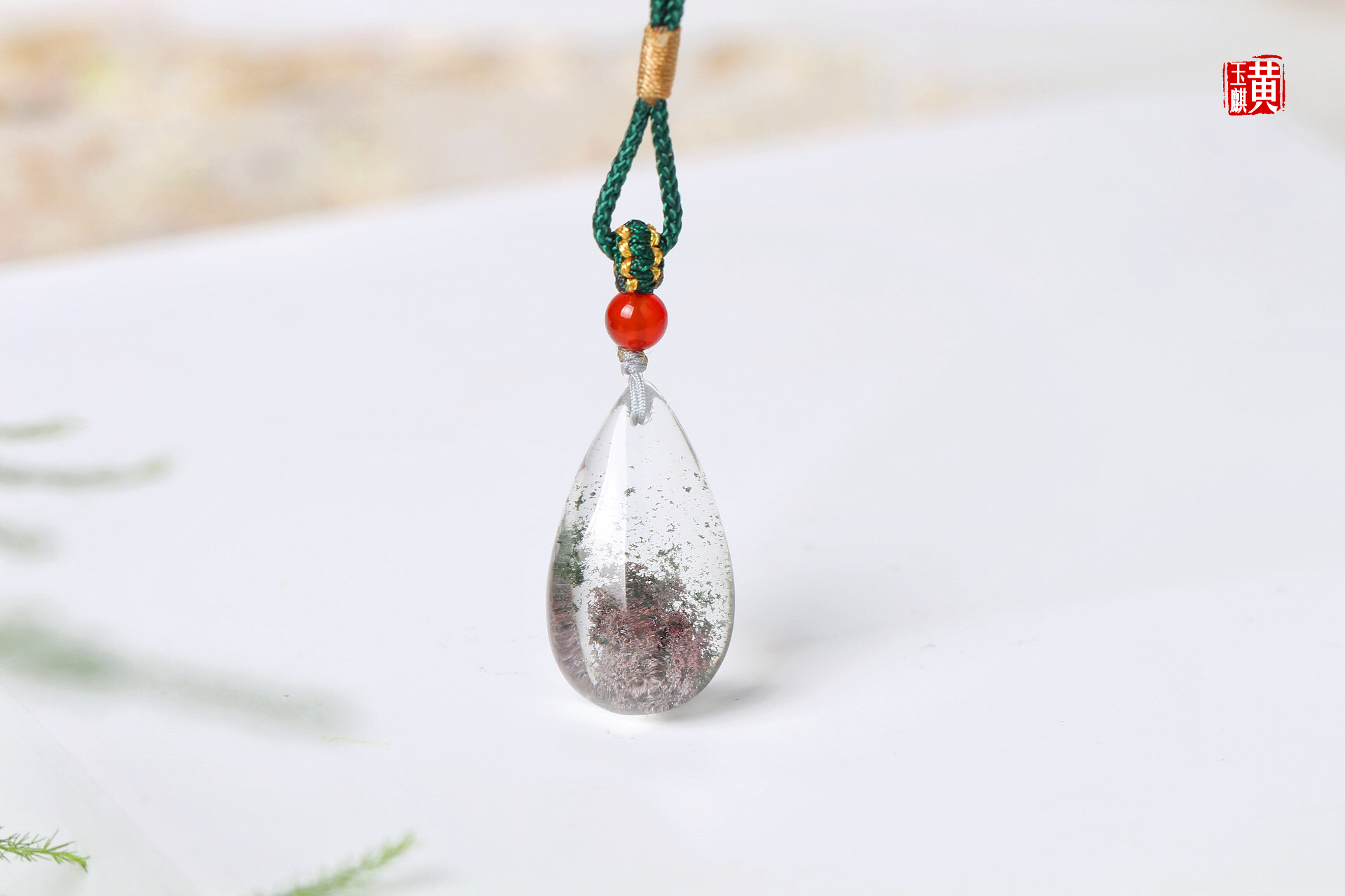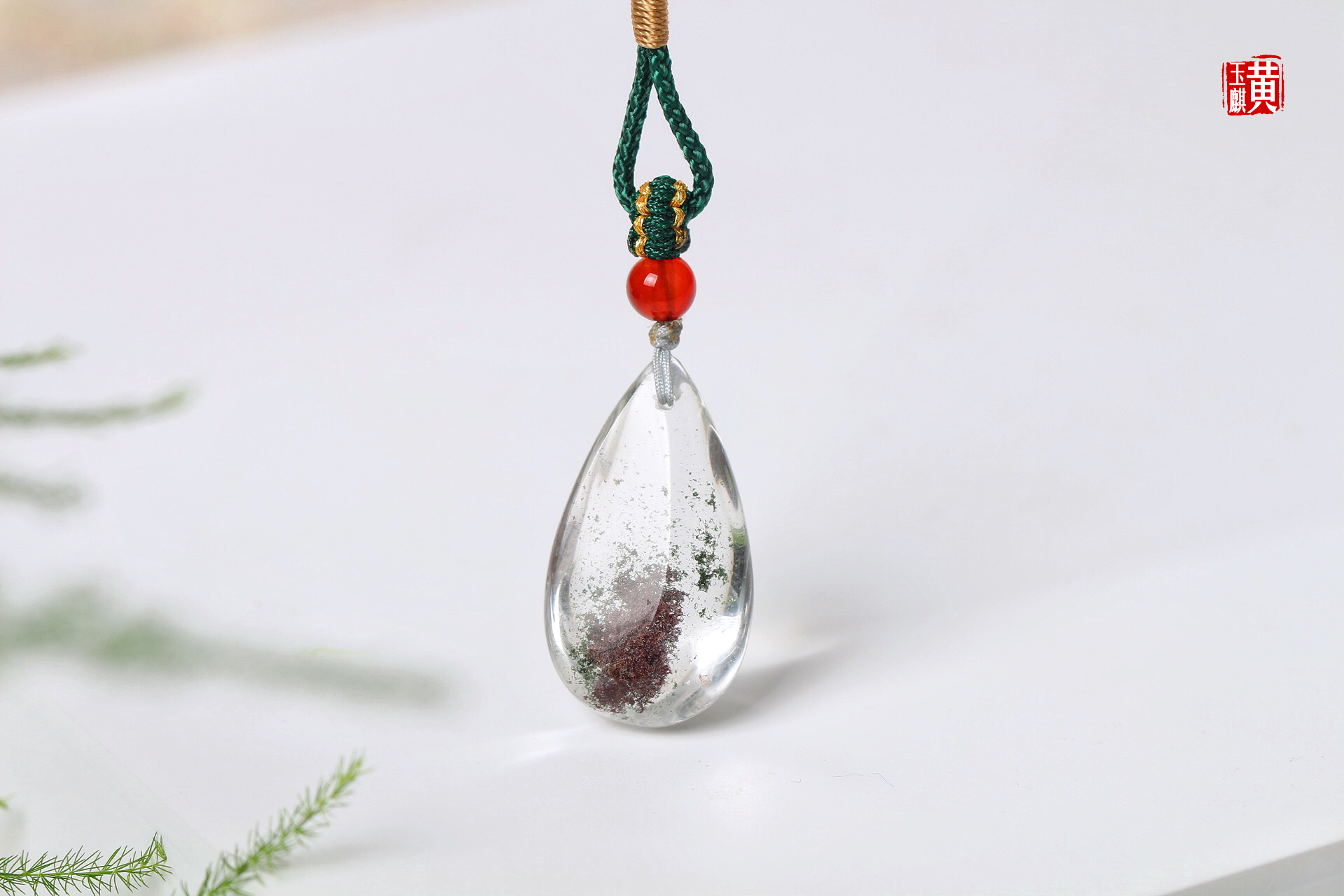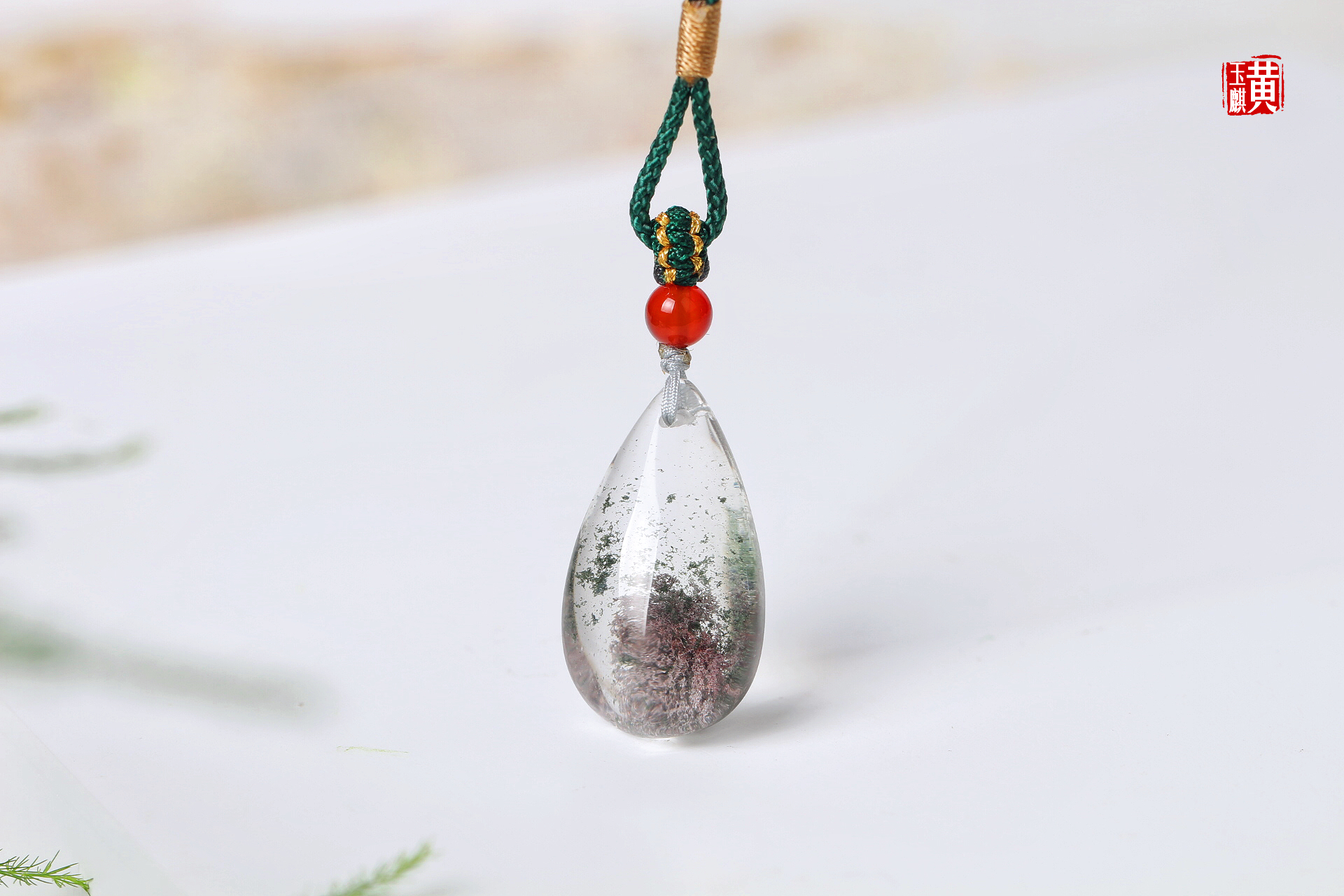 一枚通透的幽灵水晶吊坠,好看的水滴形,内含红幽灵和绿幽灵,如枫叶遍布山林,红幽灵寓意旺人缘感情、生活红火;绿幽灵寓意旺事业财运、聚财纳福,佩戴灵动别致。