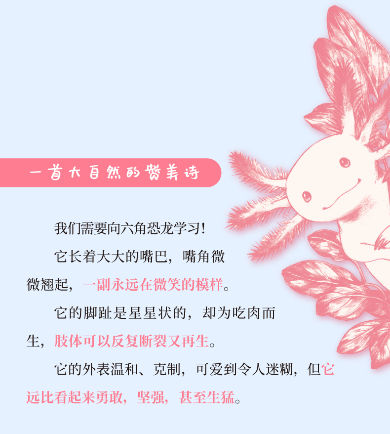 《纽约时报》畅销书,美国全国公共广播电台年度;最佳书籍,全美最大实体书店巴诺书店年度选书。一首大自然的赞美诗:六角恐龙、华美极乐鸟、鲸鲨、独角鲸、含羞草......每一种动物、每一株植物都有着自己与众不同的特质。一部爱与归属的回忆录:保持微笑,恣意跳舞,安静自持,勇敢拒绝......在孤独、沮丧、不知所措时,神奇生物教会了我这些事。生命本就是奇迹,回忆总让人温柔。季风的温润潮湿、橙子园里的芬芳清甜、黄金树枝叶摩挲的窸窸窣窣都藏着成长的记忆。《六角恐龙的微笑》是一部优雅的散文集,一位治愈心灵的良伴,她将温暖你的冬天,凉爽你的夏天,缤纷你的四季。