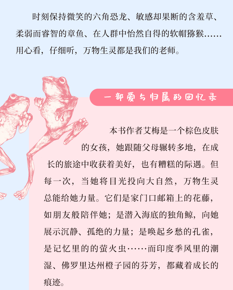 艾梅跟随父母辗转多地,印度喀拉拉邦、堪萨斯州、密西西比州、艾奥瓦州、亚利桑那州......在成长的旅途中收获着美好,也常常陷入糟糕的境遇。但每一次,当她将目光投向大自然,万物生灵总能给她力量。时刻保持微笑的六角恐龙、敏感却果断的含羞草、柔弱而睿智的章鱼、在人群中怡然自得的软帽猕猴......用心看,仔细听,它们便成为她的伙伴、朋友,甚至老师。印度季风里的潮湿、佛罗里达州橙子园的芬芳,则诉说着她成长的回忆。