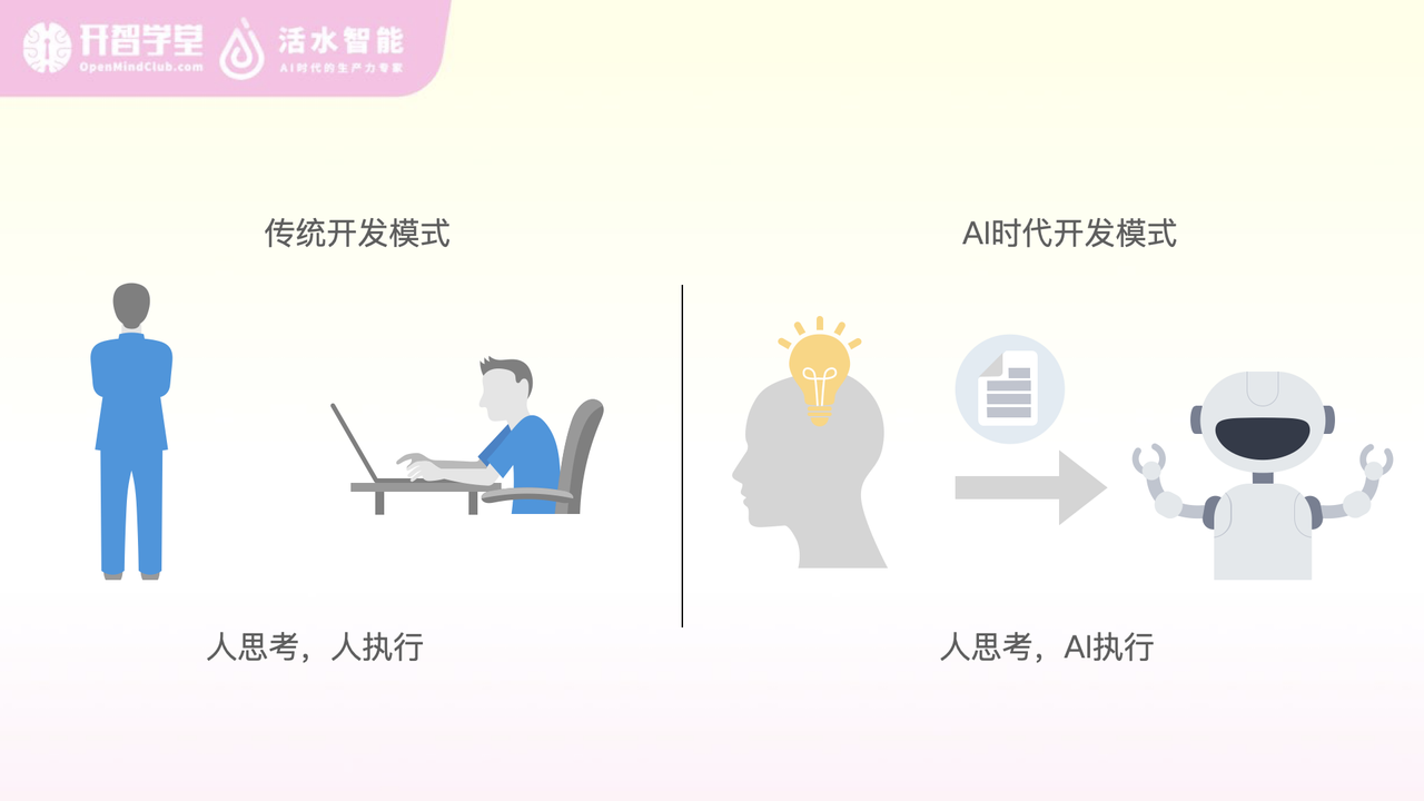为此,阳志平老师结合认知科学与软件开发的丰富经验,提出了适用于AI时代的软件研发方法——认知敏捷法。传统的软件开发模式是「人思考,人执行」。在AI时代,认知敏捷法将其重新定义为「人思考,AI执行」。
