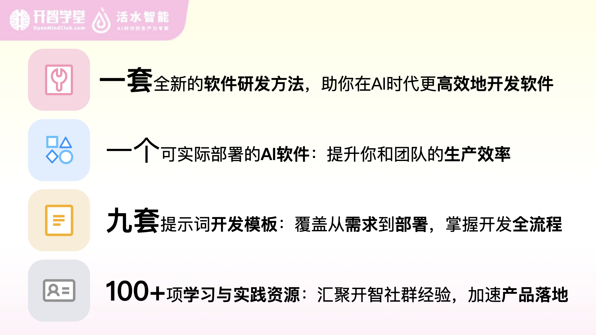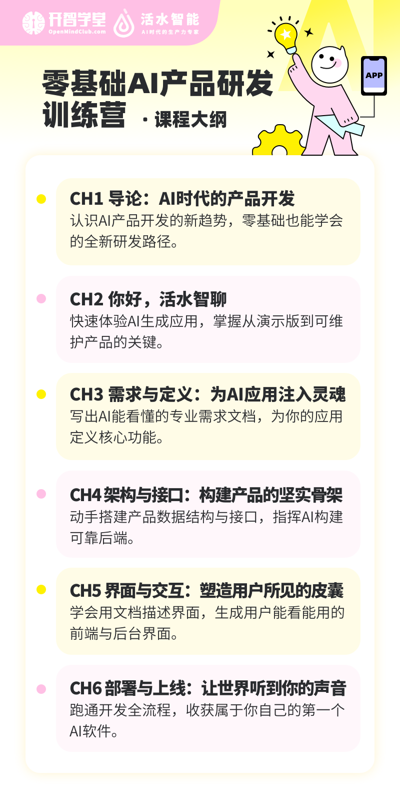 2025年,AI编程迎来了新的跃迁。从Cursor到Claude Code,AI开发工具不断推陈出新。那么,如何打造真正落地的AI产品?为此,开智学堂旗下AI教育品牌「活水智能」推出全新课程——「零基础AI产品研发训练营」。