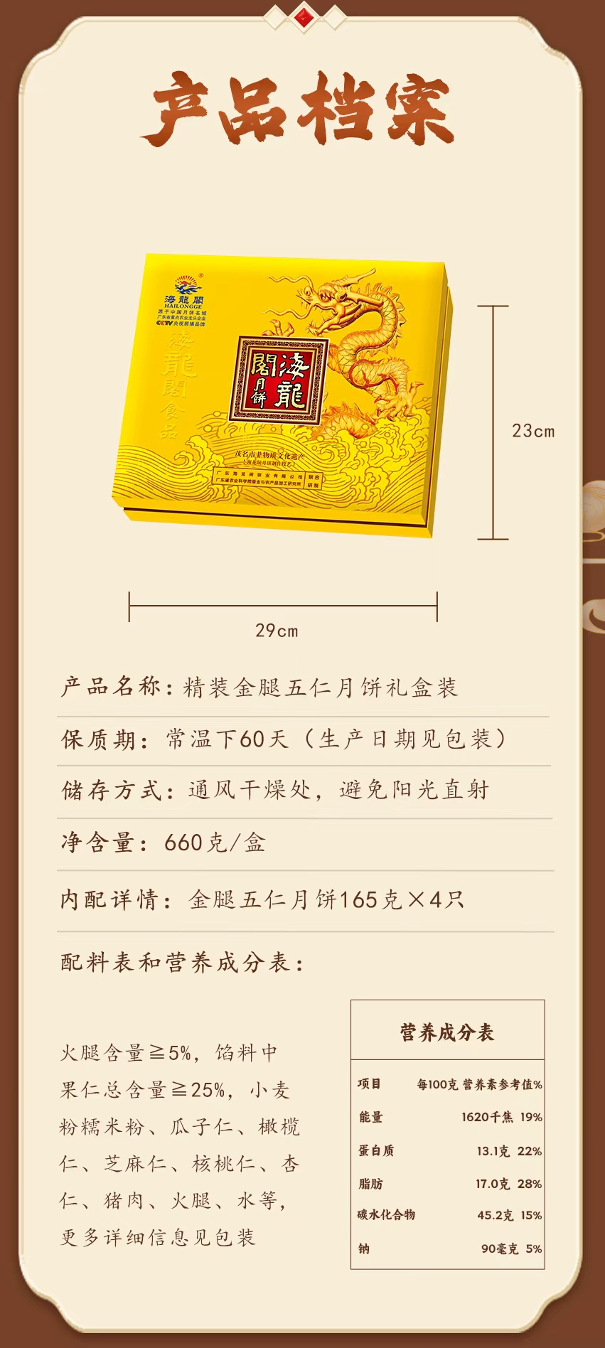 海龙阁金腿五仁月饼精装礼盒660g(内配金腿五仁月饼165g*4只 )