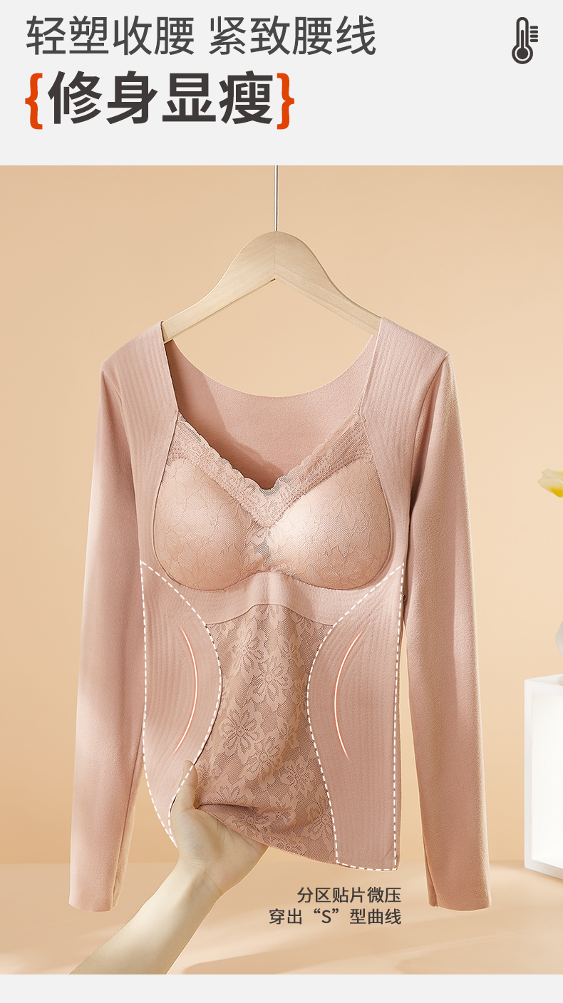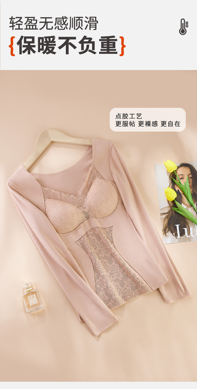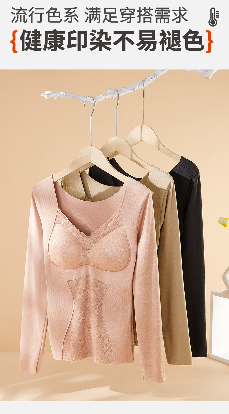 雅黛丽保暖上衣带胸垫长袖高弹显瘦舒适亲肤磨毛蕾丝打底衫可外穿
