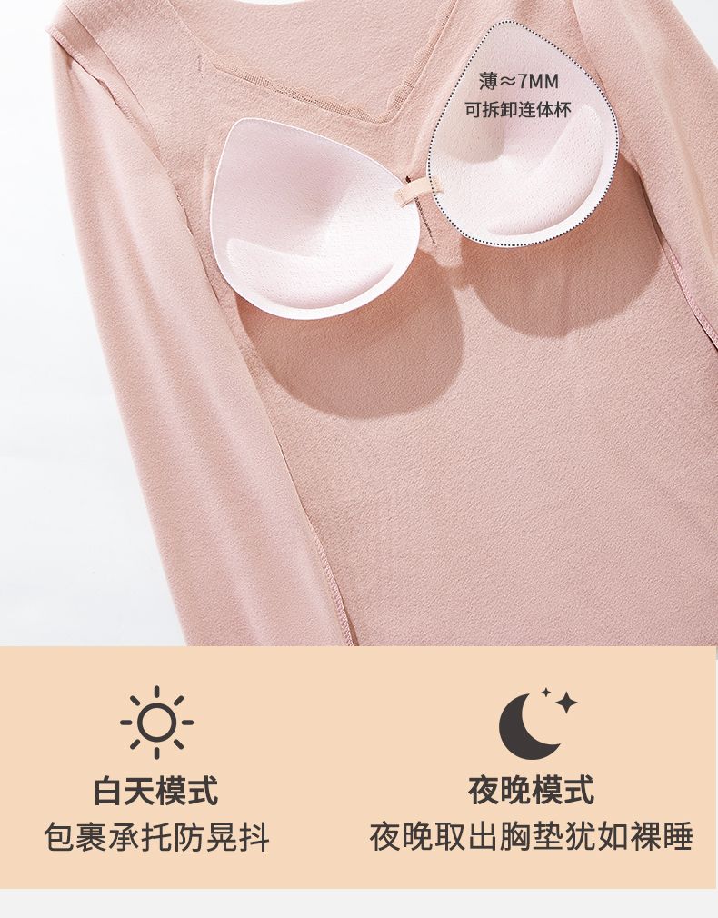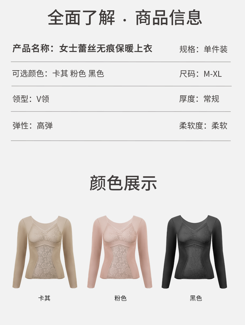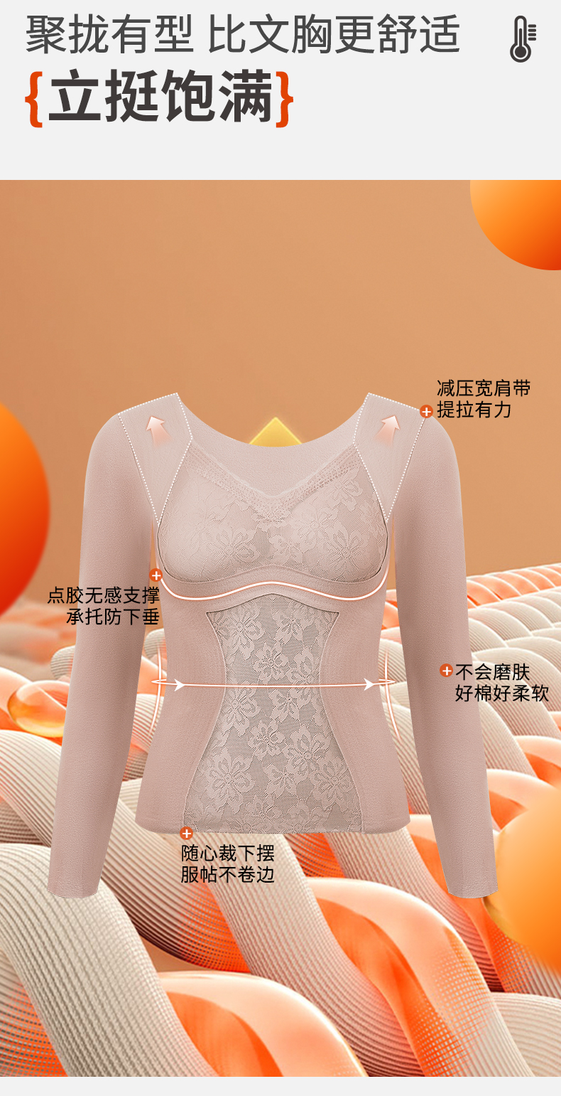 雅黛丽保暖上衣带胸垫长袖高弹显瘦舒适亲肤磨毛蕾丝打底衫可外穿