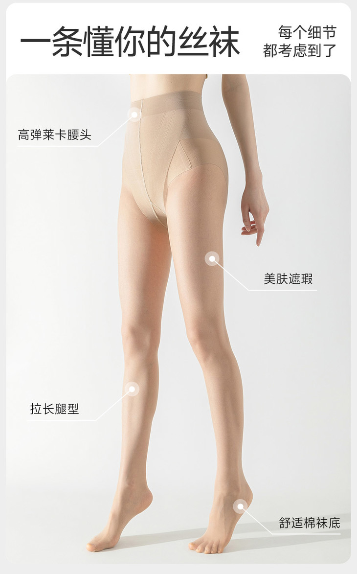 各种细节都很到位,腰口是莱卡LYCRA面料,前后还都有收腹提臀的设计,尤其是脚底,还有个可爱小脚丫,是吸汗防滑的针织棉底哦!整条袜袜弹力很好,细节也是满分,穿上身舒适不紧绷,80-140斤都可!不勾丝、不掉档、上腿自然,而且有白皙肤、自然肤、空姐灰、性感黑四色,都是百搭好看,特别推荐下空姐灰,超高级的!而且68块有2条,很划算!