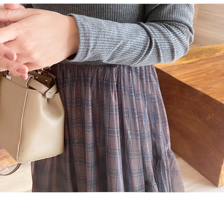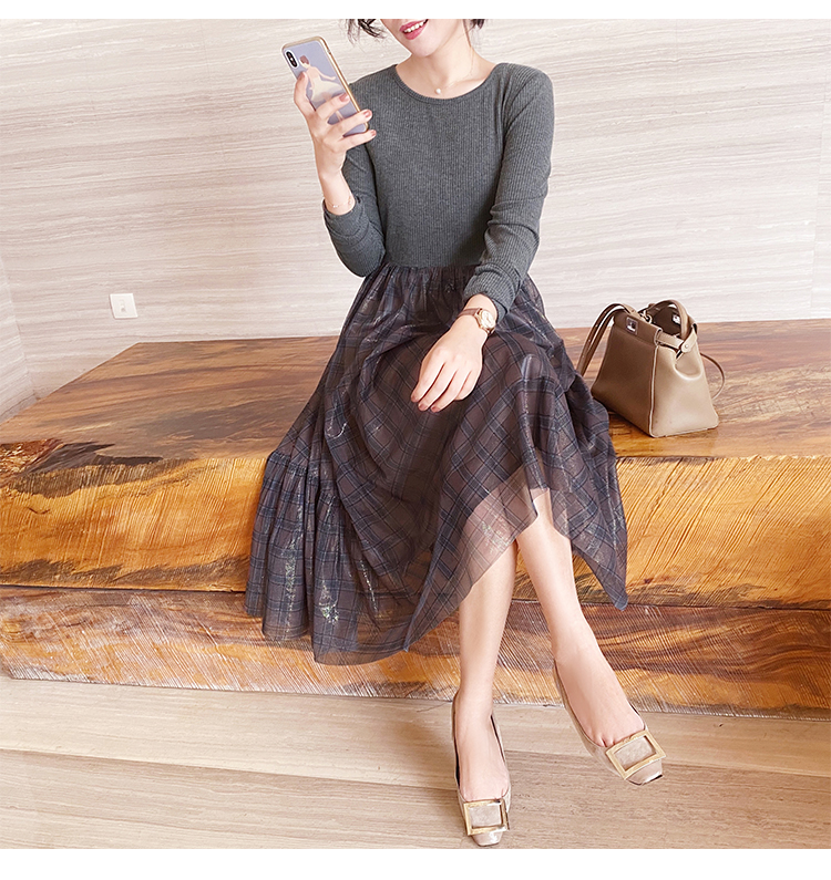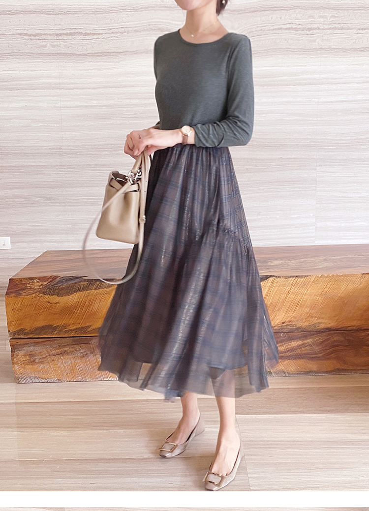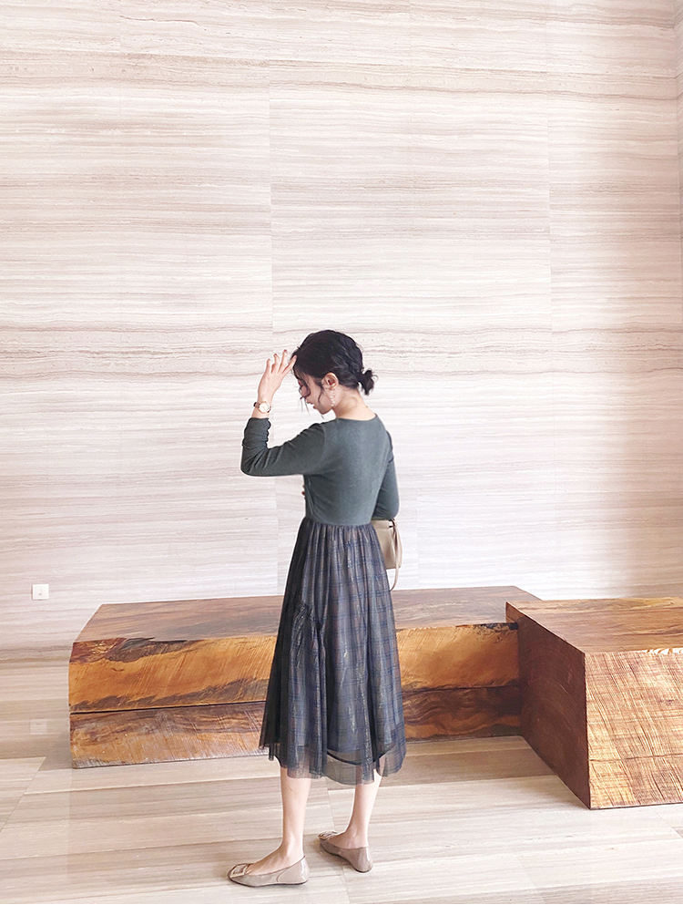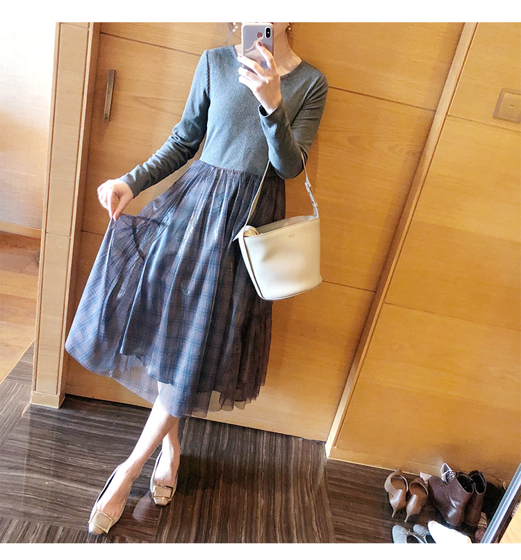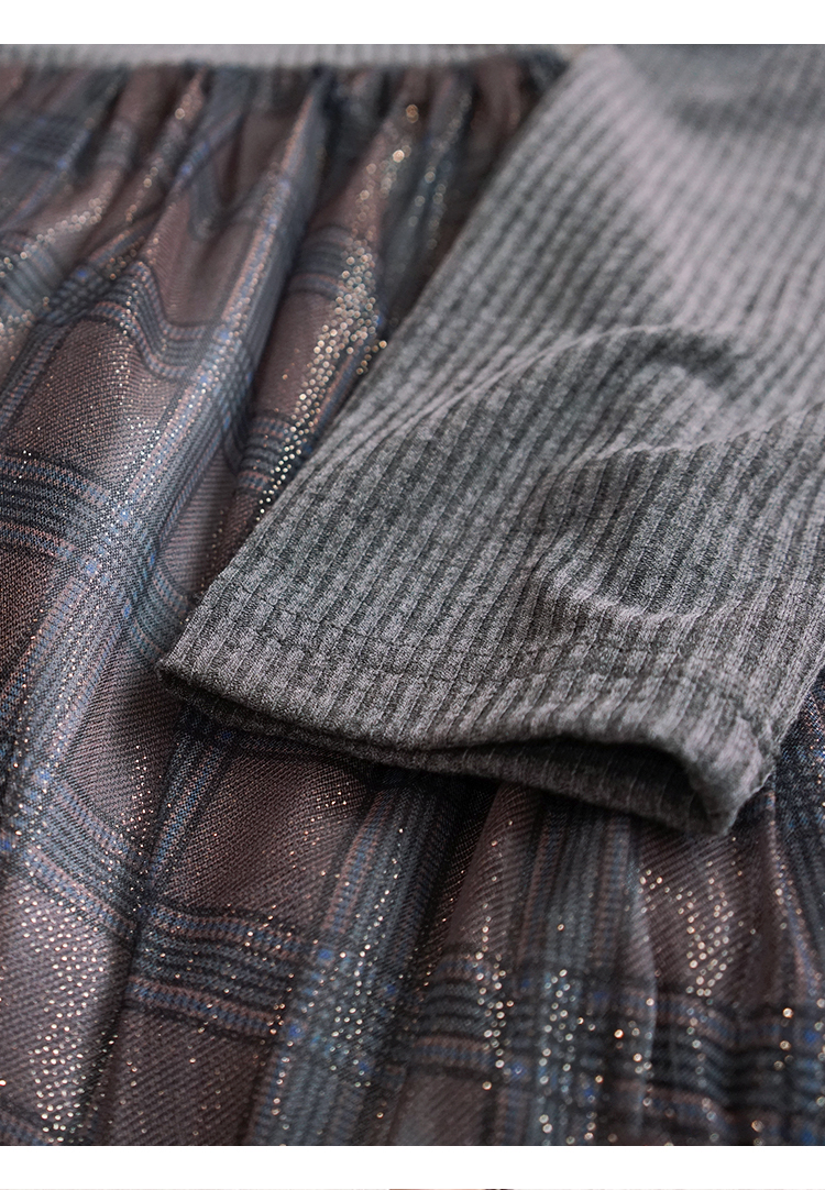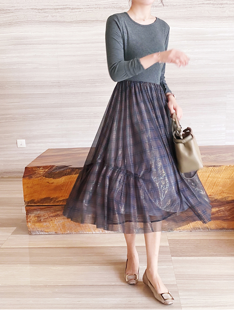舞舞舞 灰蓝色调罗纹拼接网纱连衣裙