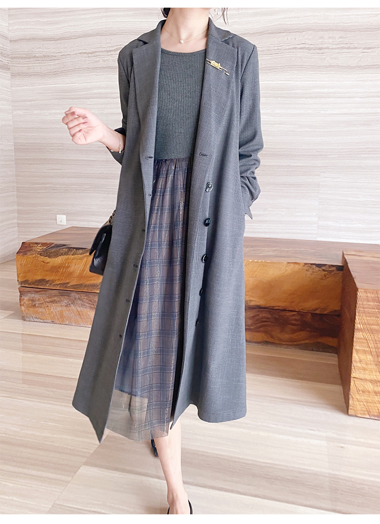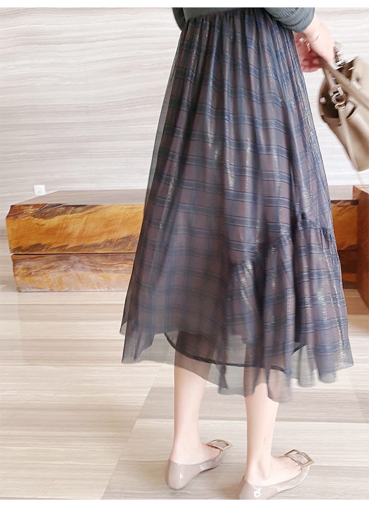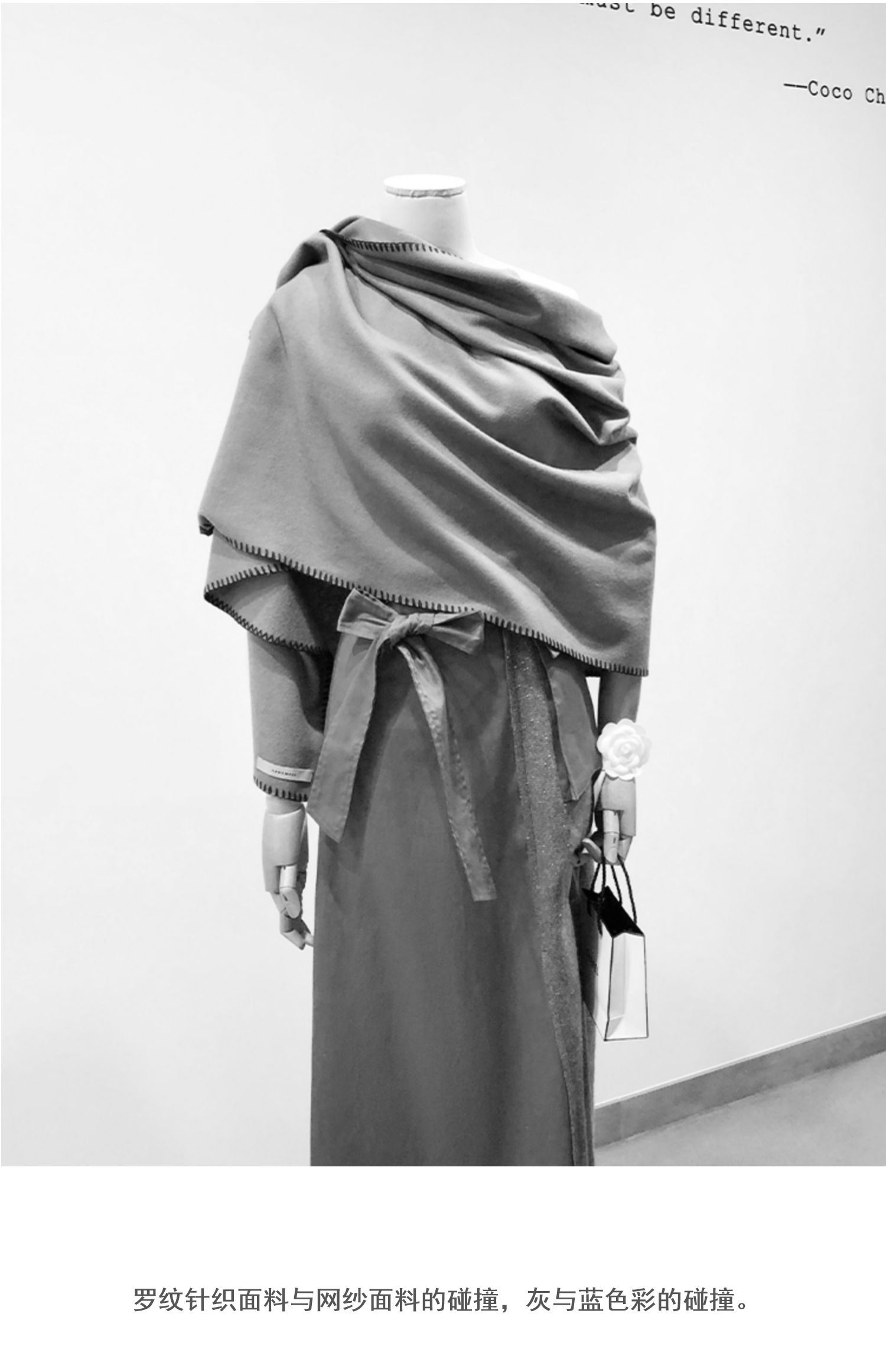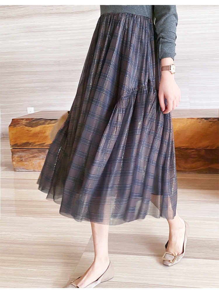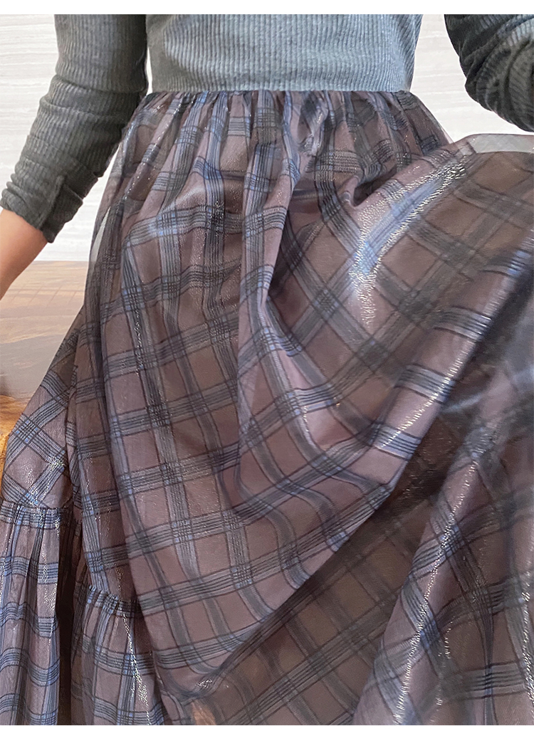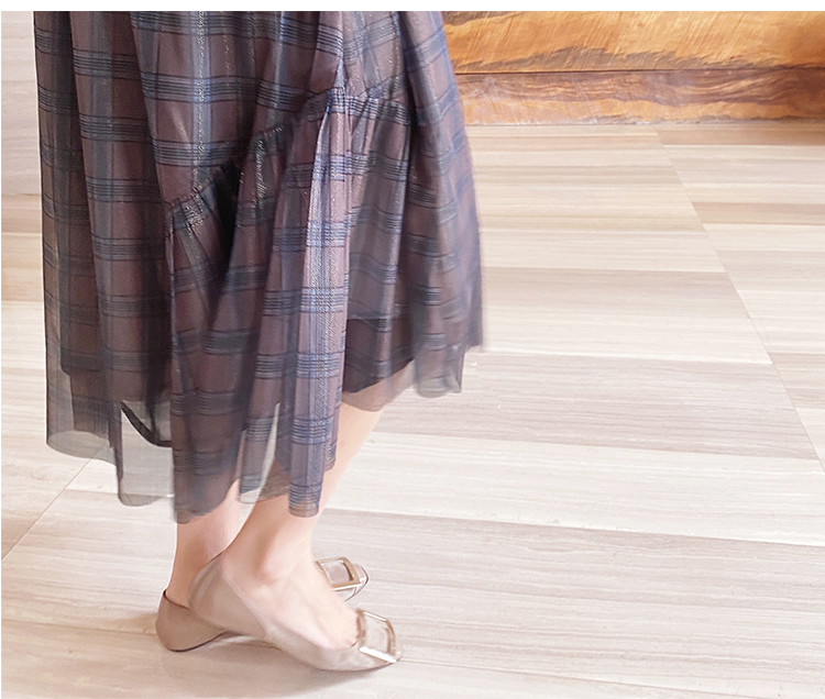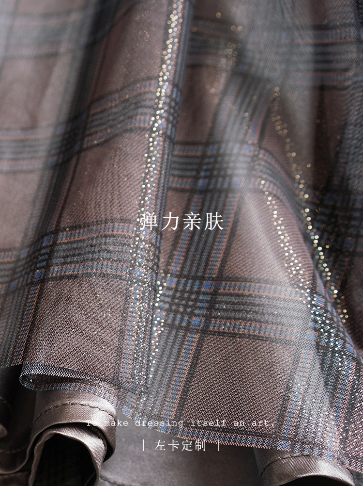 舞舞舞 灰蓝色调罗纹拼接网纱连衣裙