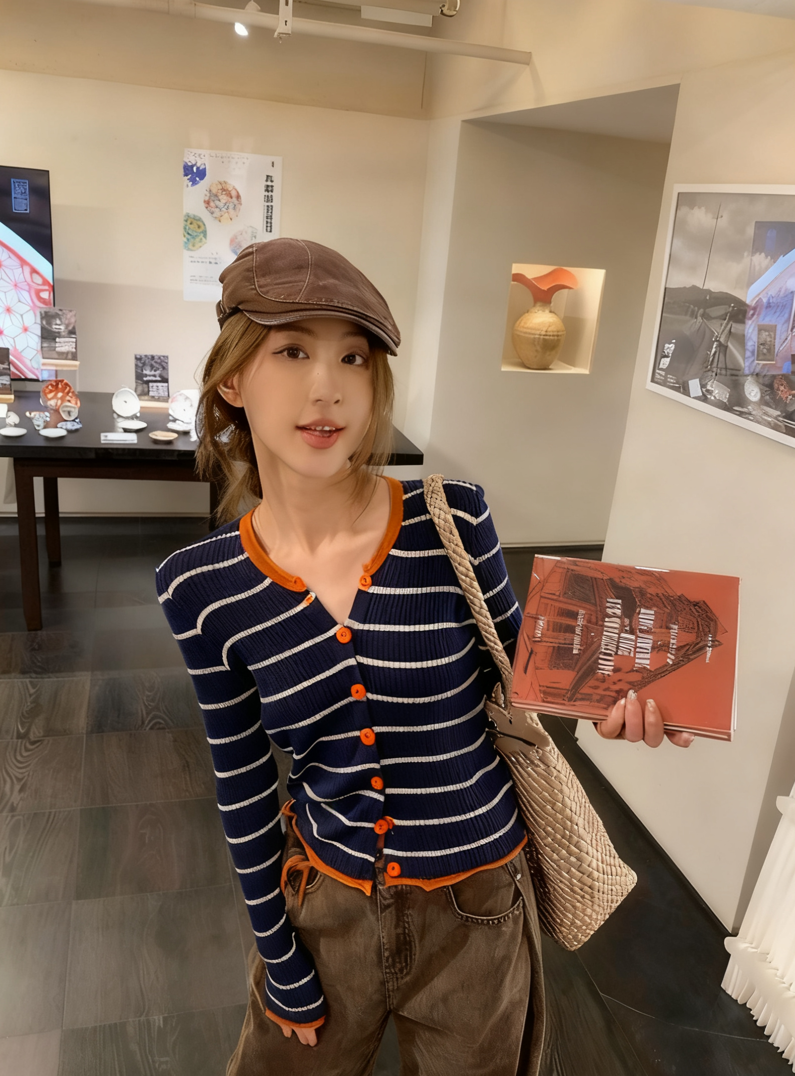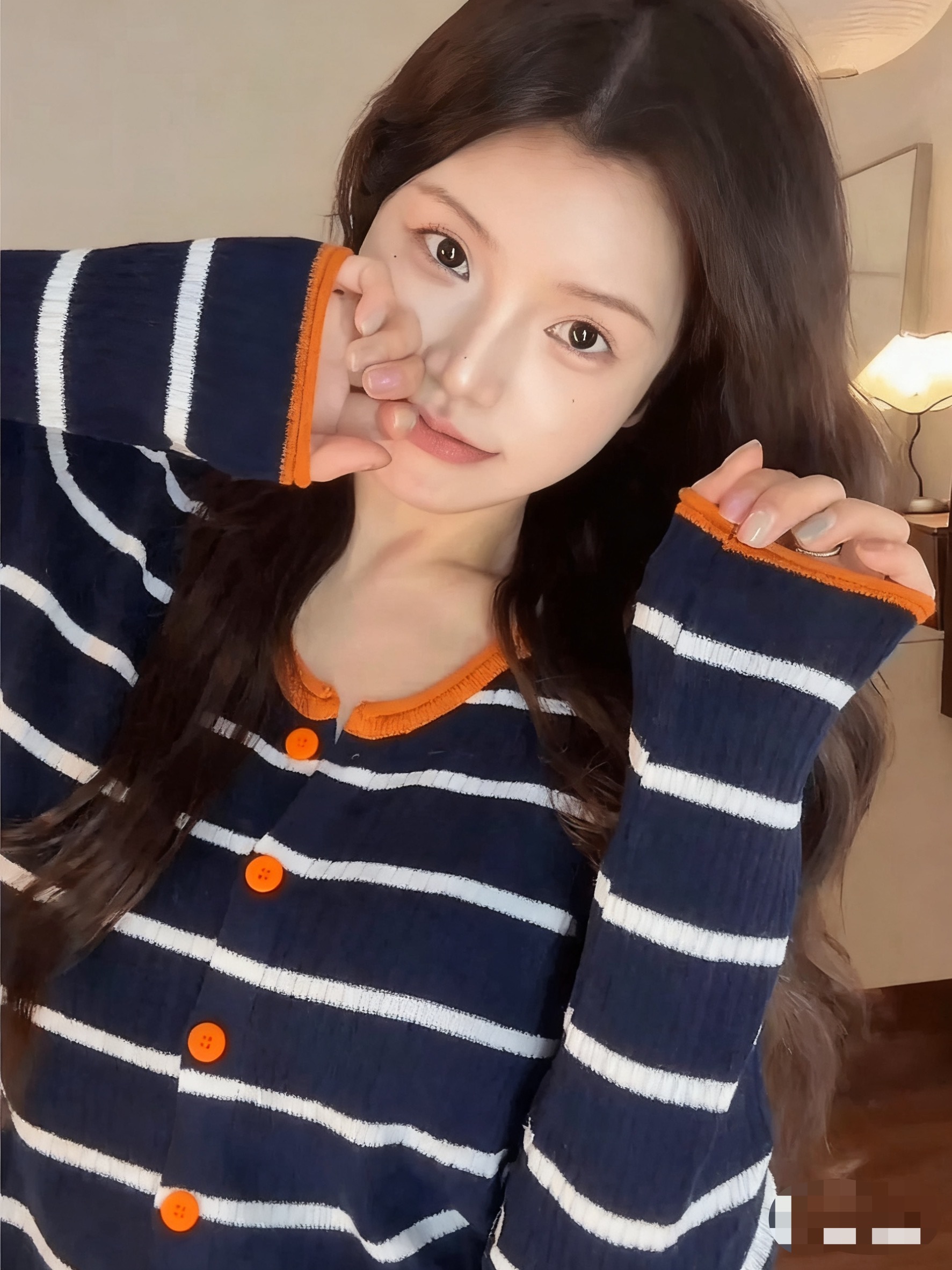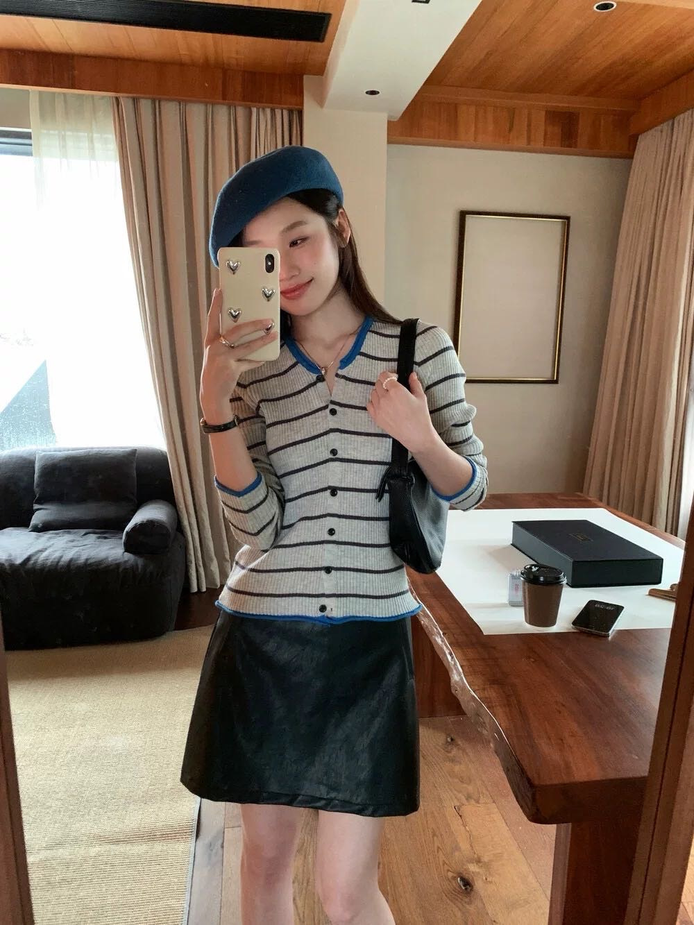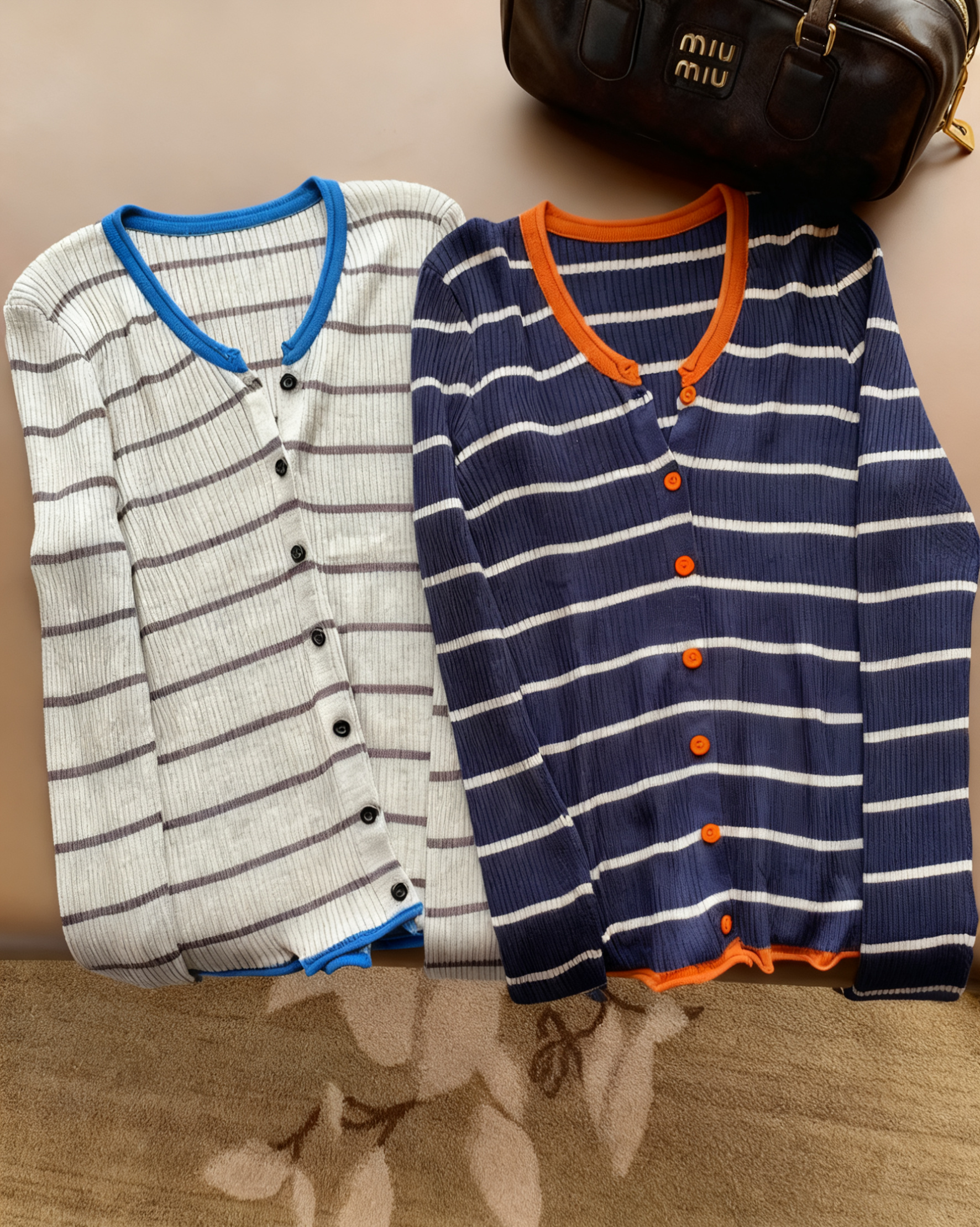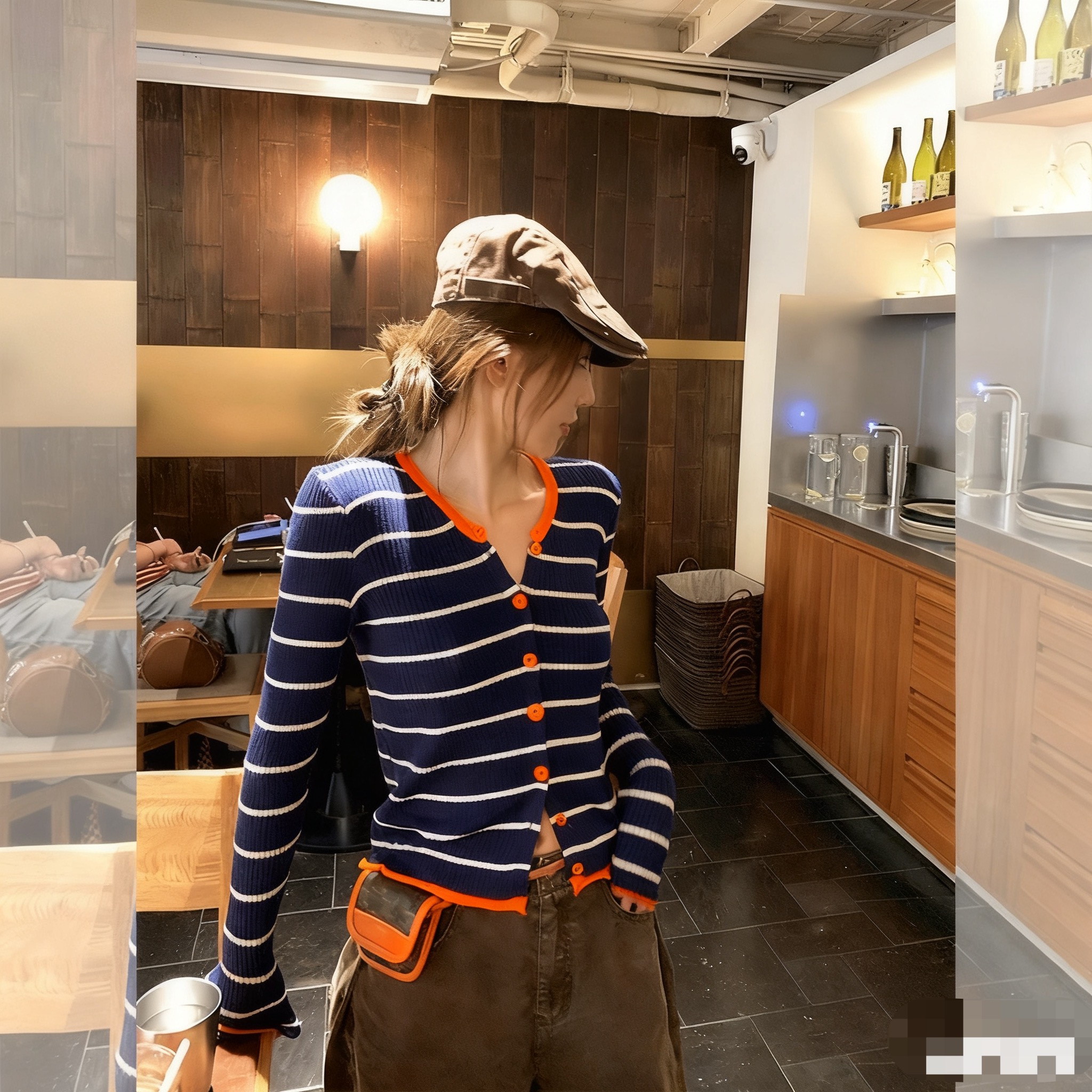 据说这款韩系撞色条纹针织开衫,在韩国专柜一上架就卖断货了⚠️这段时间一直在补单。