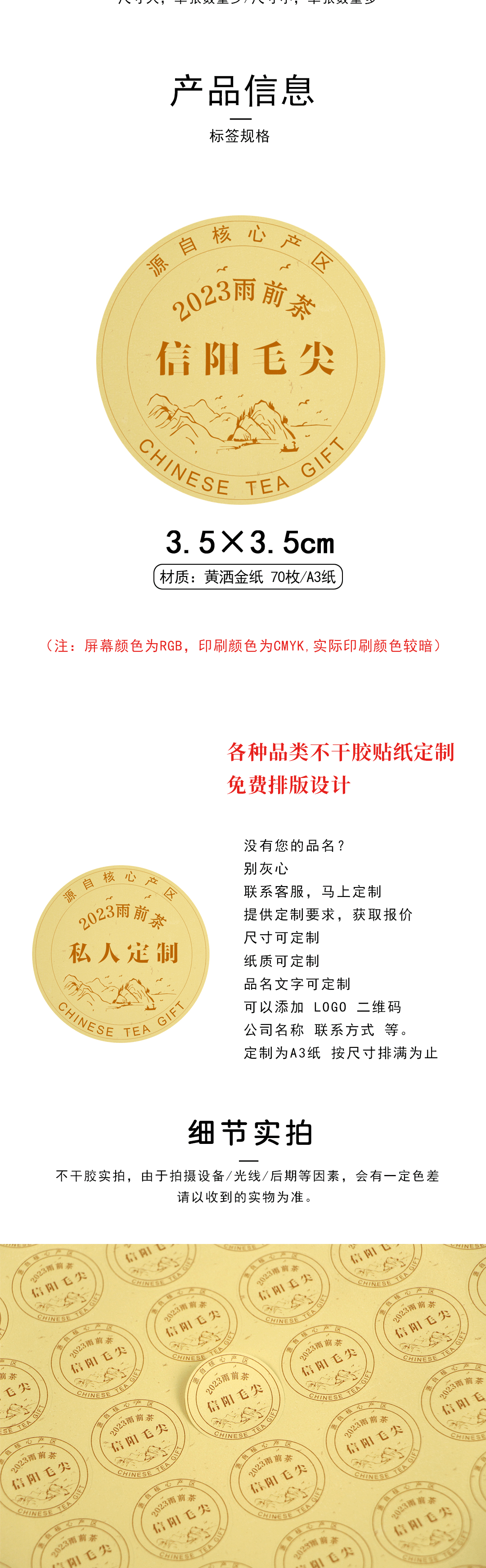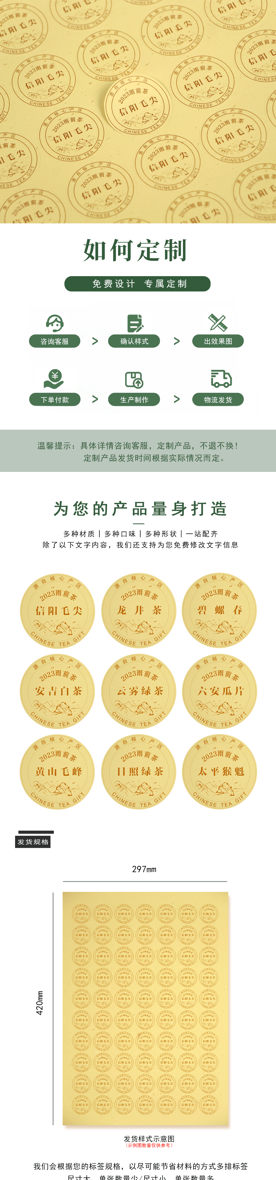 2025雨前茶信阳毛尖圆茶标黄色洒金纸一张6元, 满300元河南省内包邮