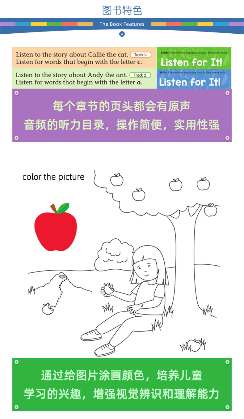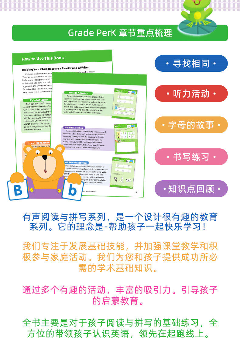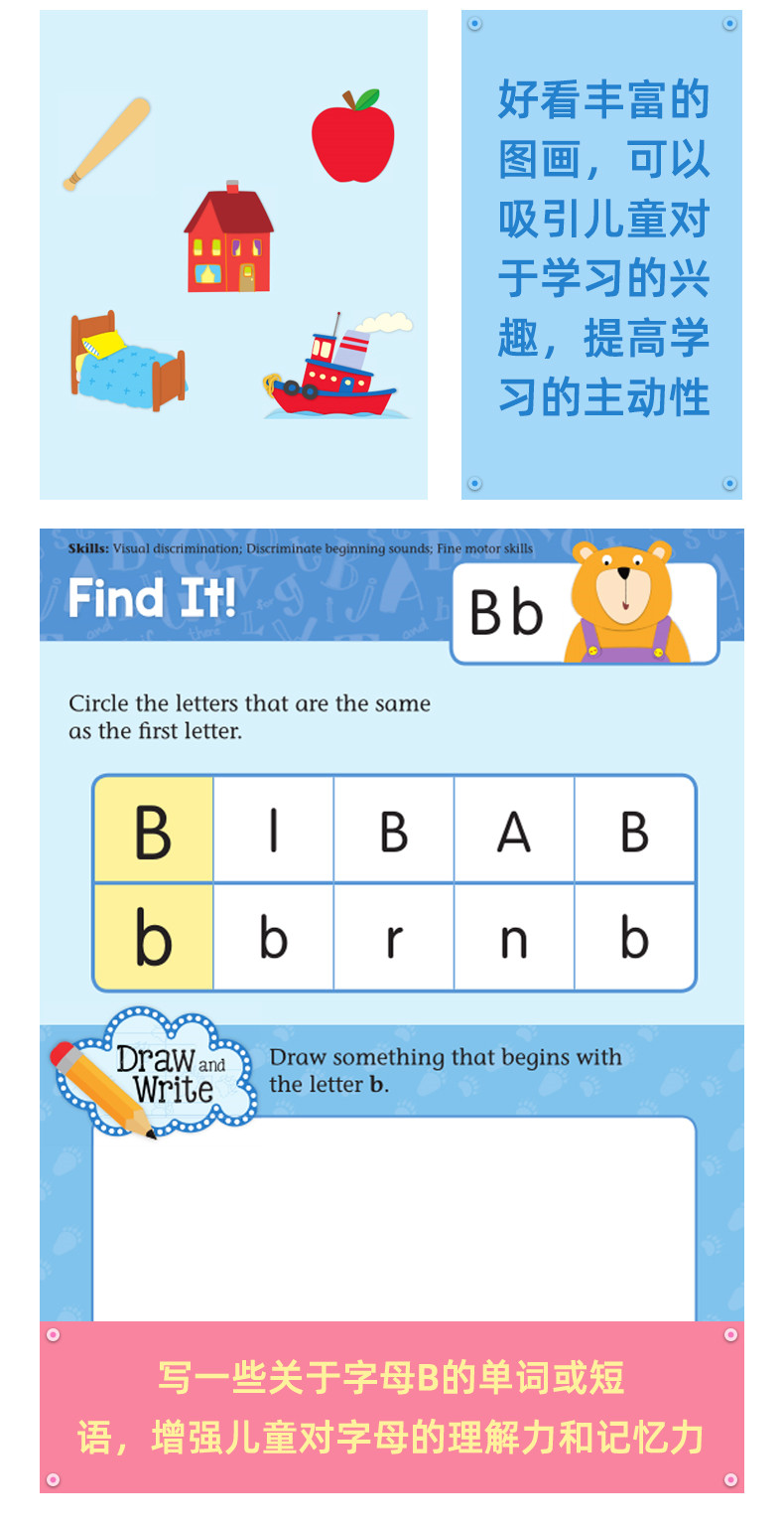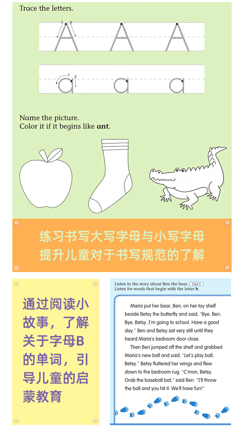 Read & Write系列以字母的学习为主线,帮助3-7岁的幼儿惊喜书写动作、掌握字母发音、学会阅读和书写简单的句子,融合故事、奖励贴纸、让幼儿趣味学习。