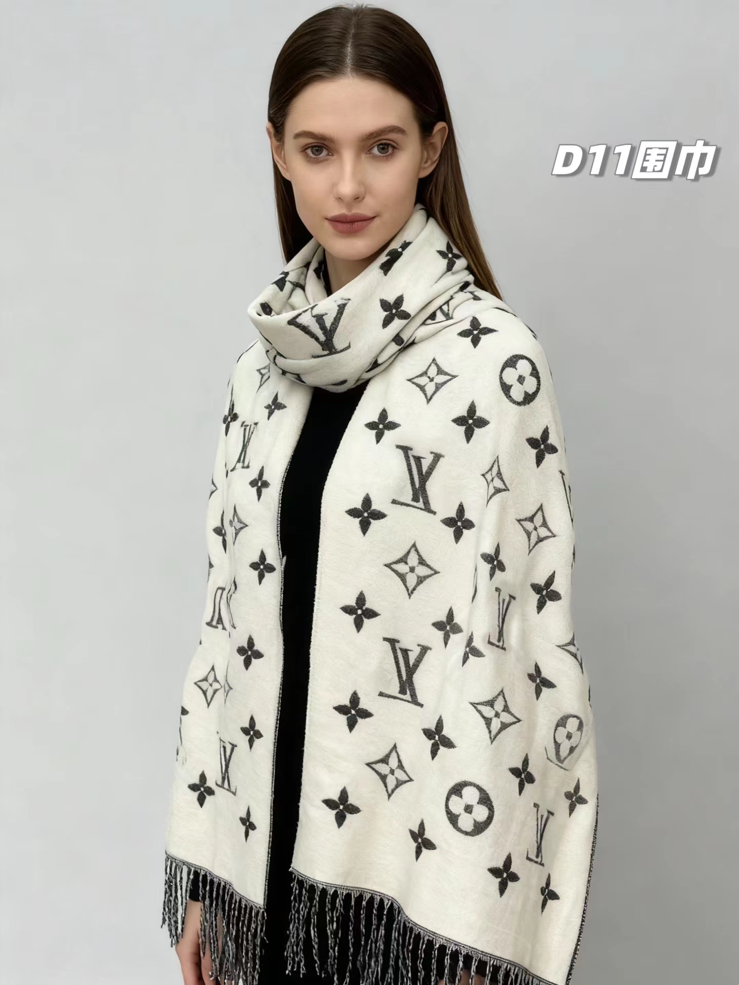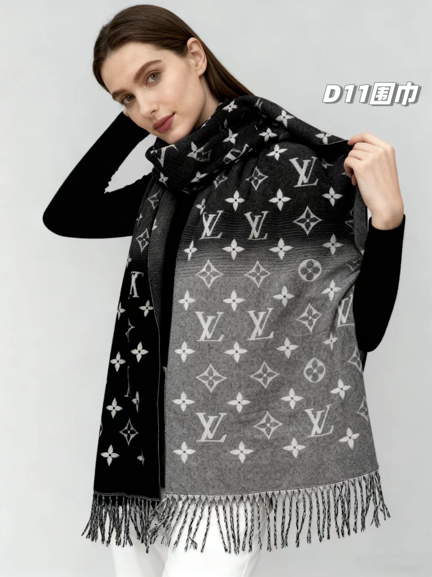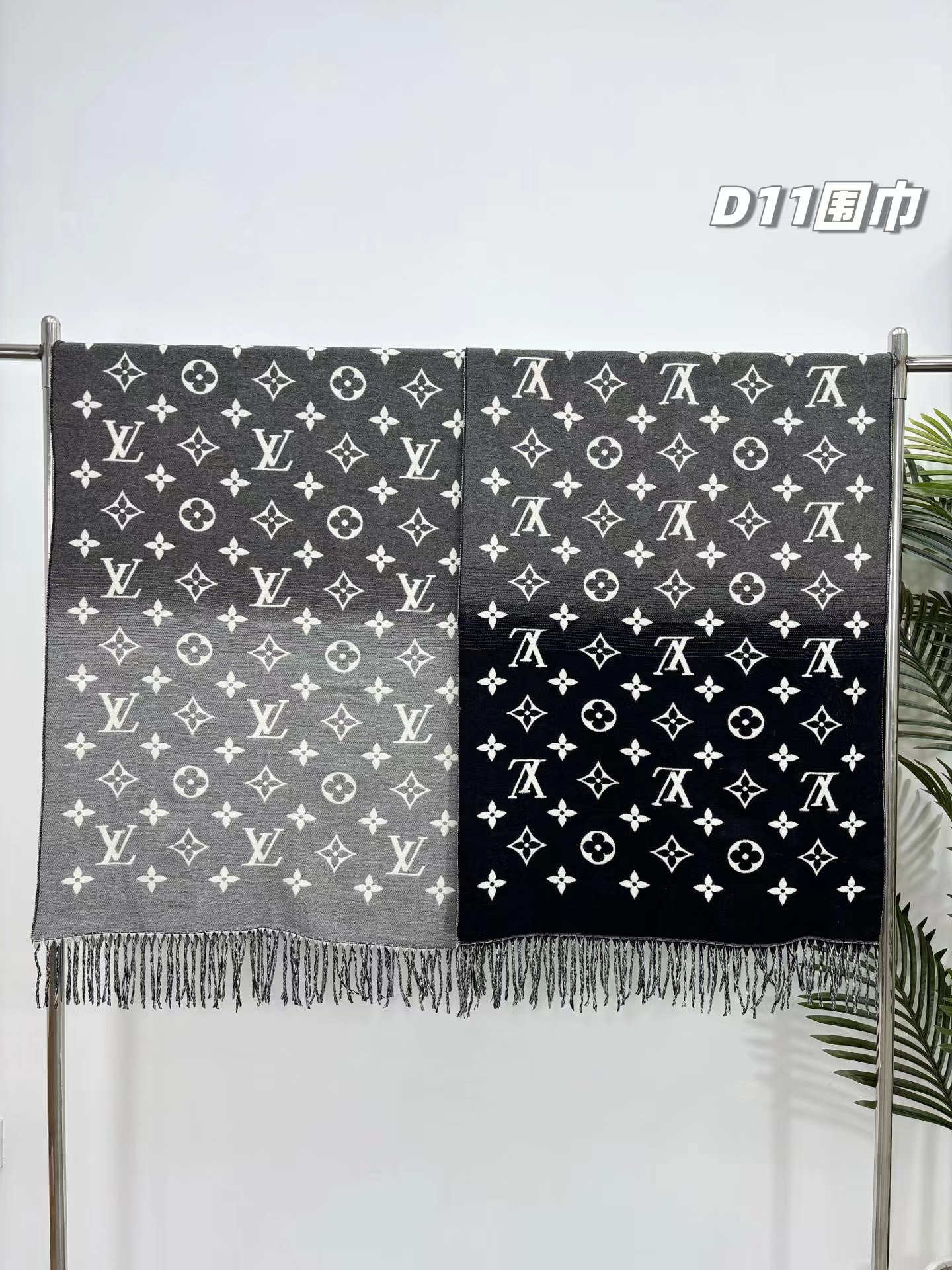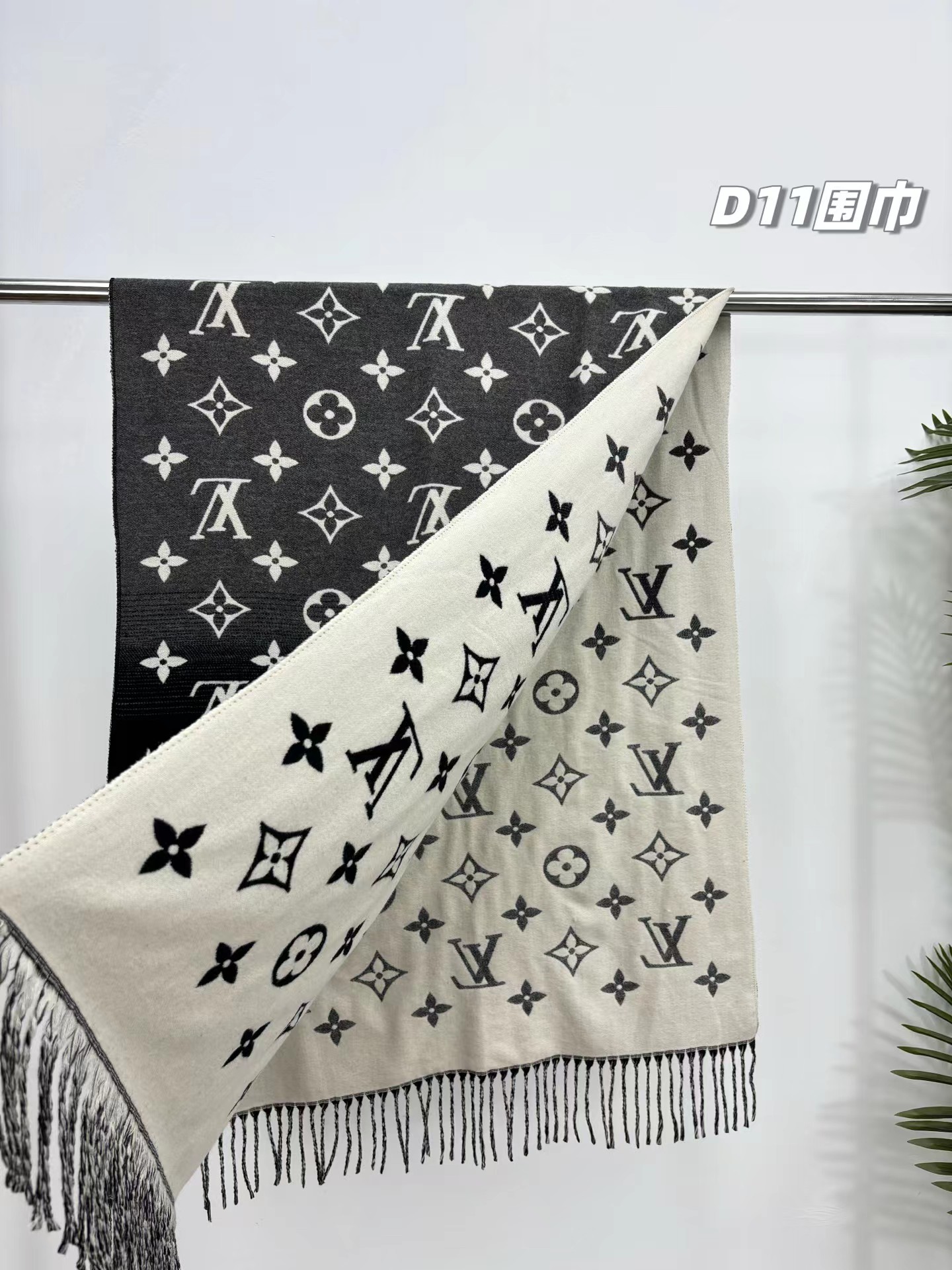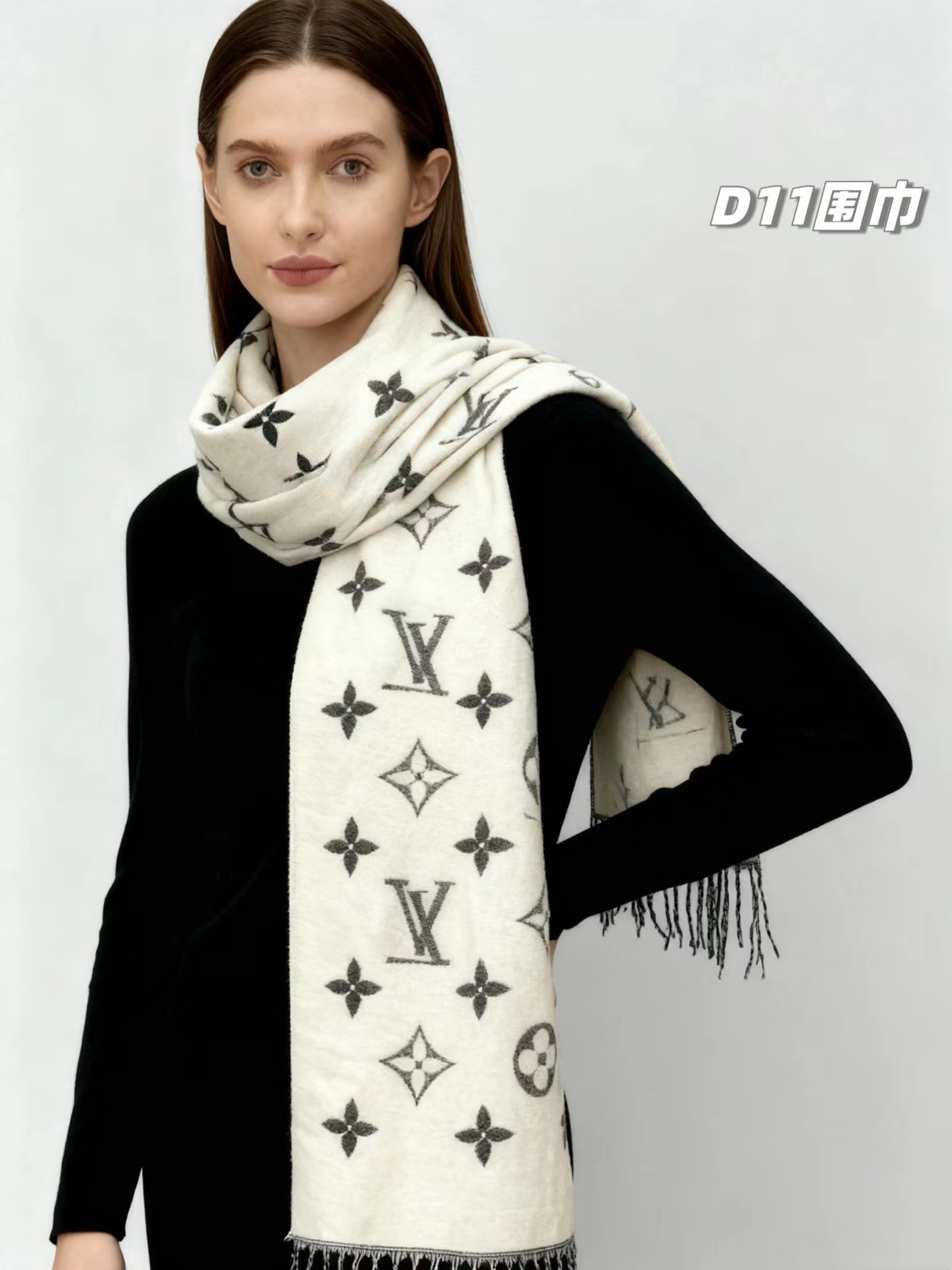羊绒围巾,情侣款可双面佩戴,保暖舒适亲肤,今冬醉舒服的一款围巾,没有之一!舒适亲肤,保暖性没得说,30%真丝+70%羊毛 ,细羊绒,亲肤性也没得说,真的不用介绍了!尺寸超大,65cm*180cm,上身自带高奢感,一面黑灰一面米色,品牌logo,给人一种气质、时尚、大气、糕贵的感觉,脑部上身效果,真的是好看!精典色,男女情侣款,适合任意年龄段任何场所,无需犹豫,入就欧了!