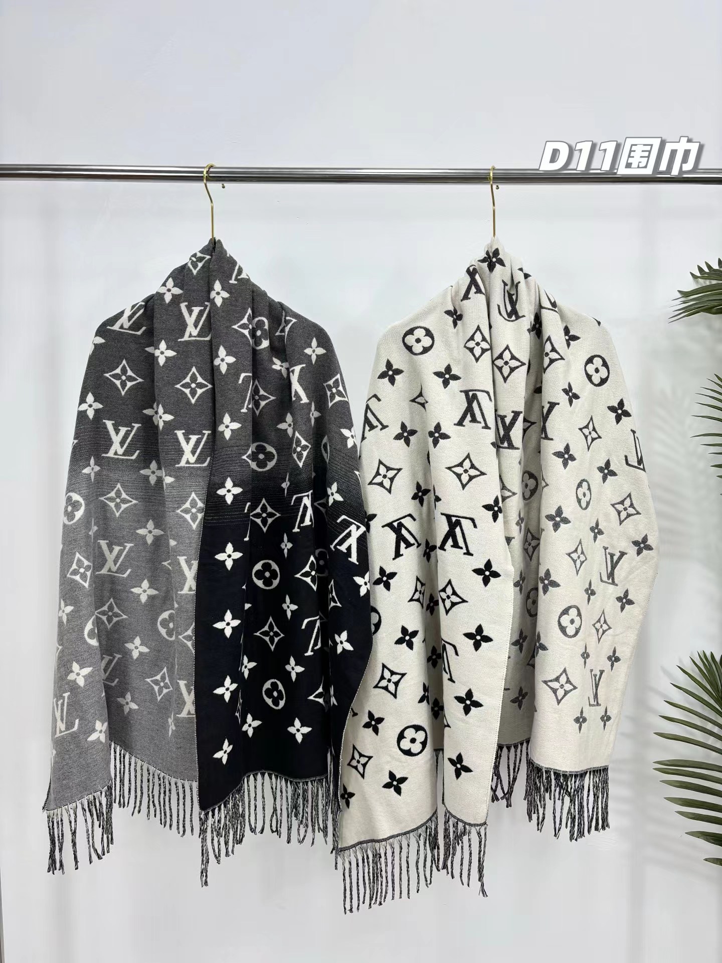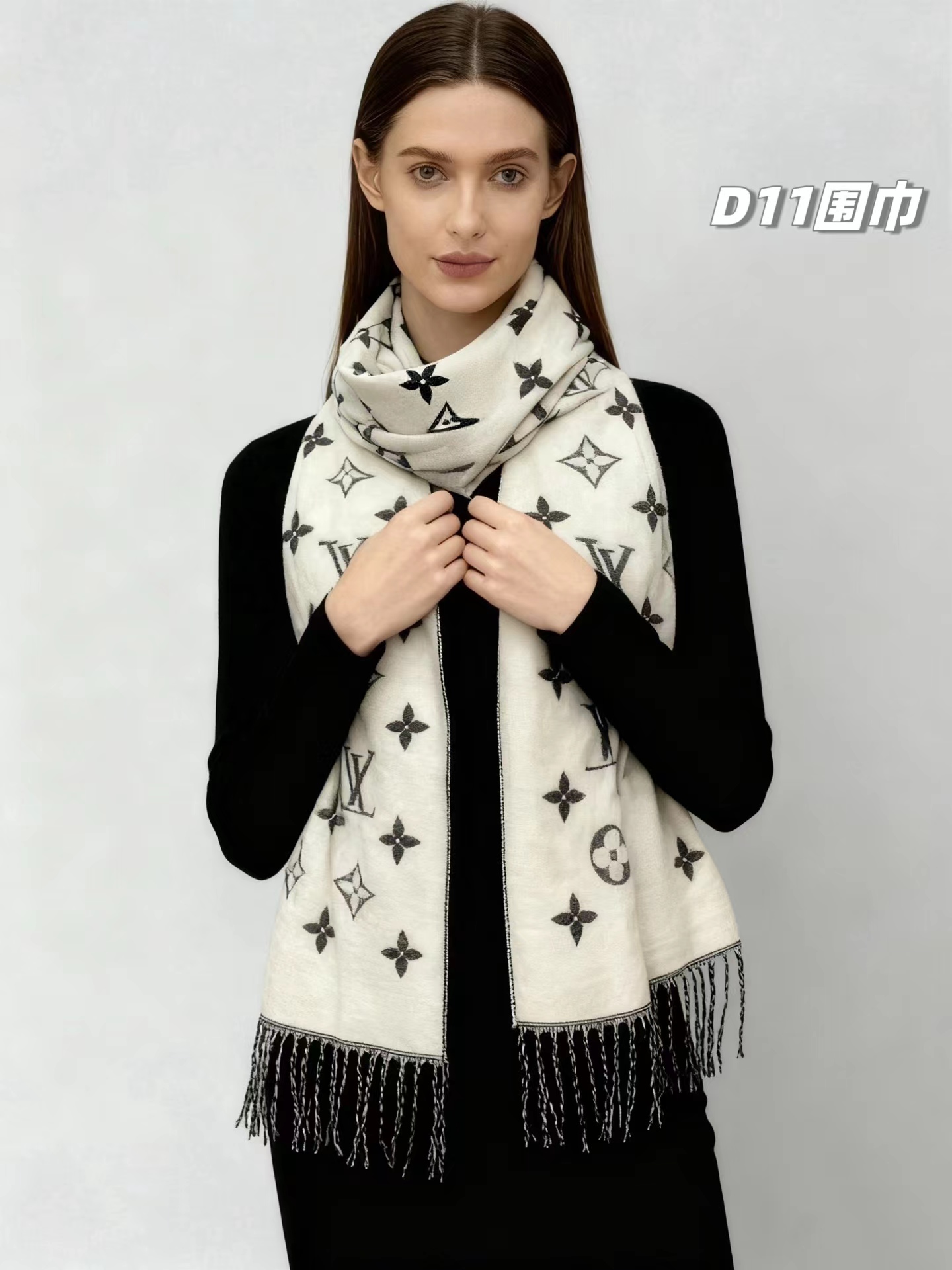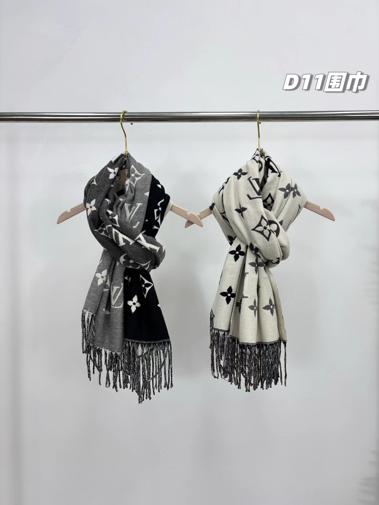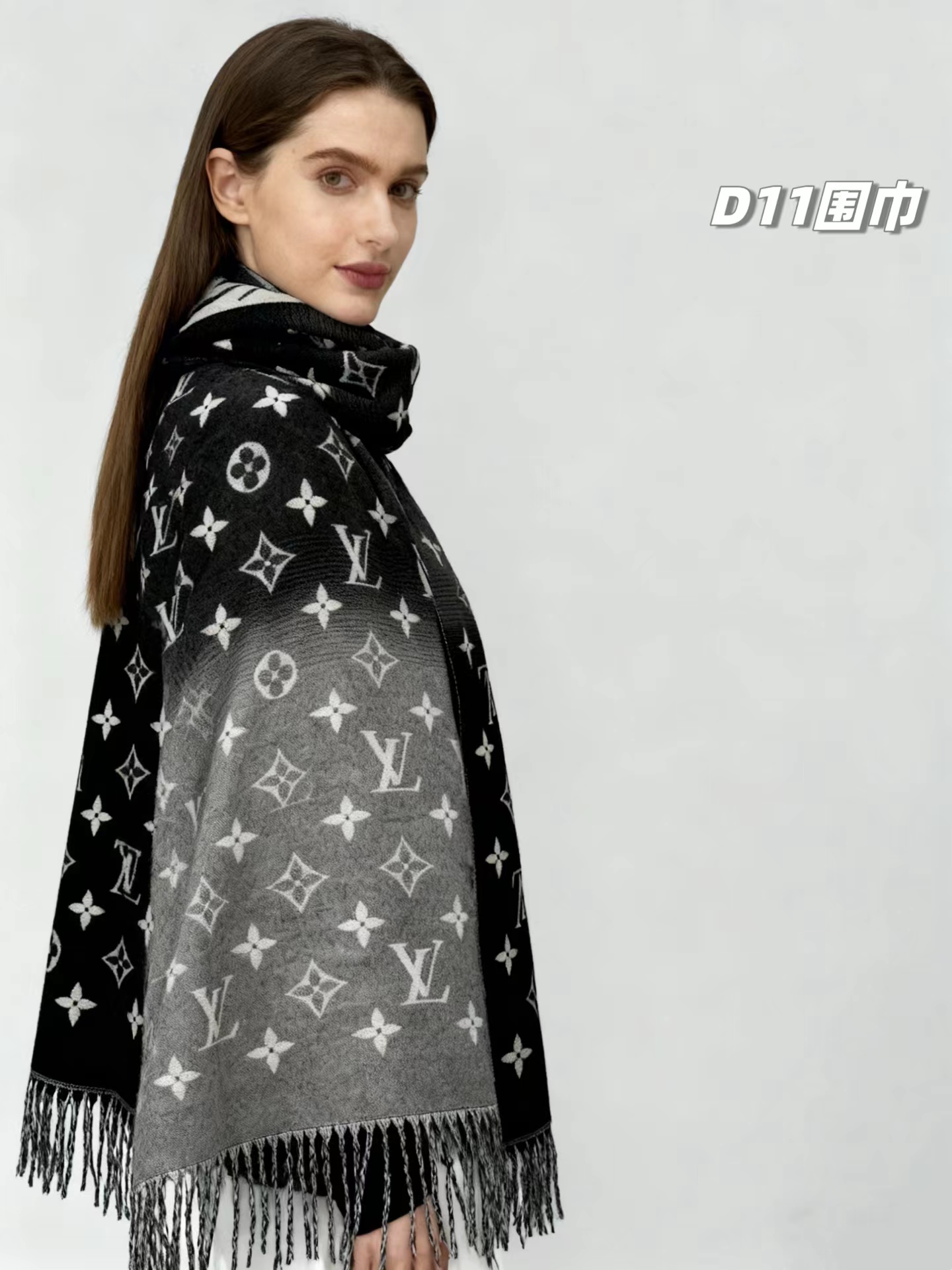 羊绒围巾,情侣款可双面佩戴,保暖舒适亲肤,今冬醉舒服的一款围巾,没有之一!舒适亲肤,保暖性没得说,30%真丝+70%羊毛 ,细羊绒,亲肤性也没得说,真的不用介绍了!尺寸超大,65cm*180cm,上身自带高奢感,一面黑灰一面米色,品牌logo,给人一种气质、时尚、大气、糕贵的感觉,脑部上身效果,真的是好看!精典色,男女情侣款,适合任意年龄段任何场所,无需犹豫,入就欧了!