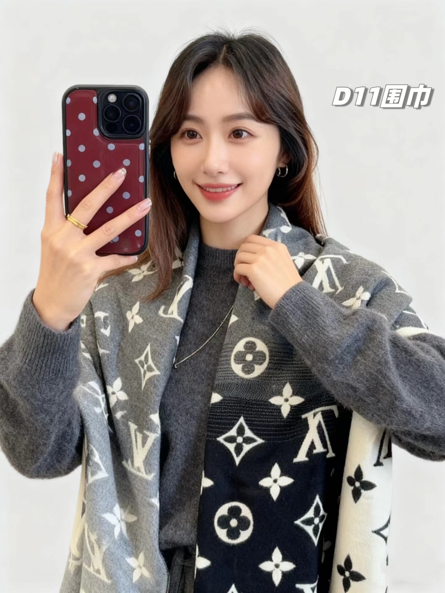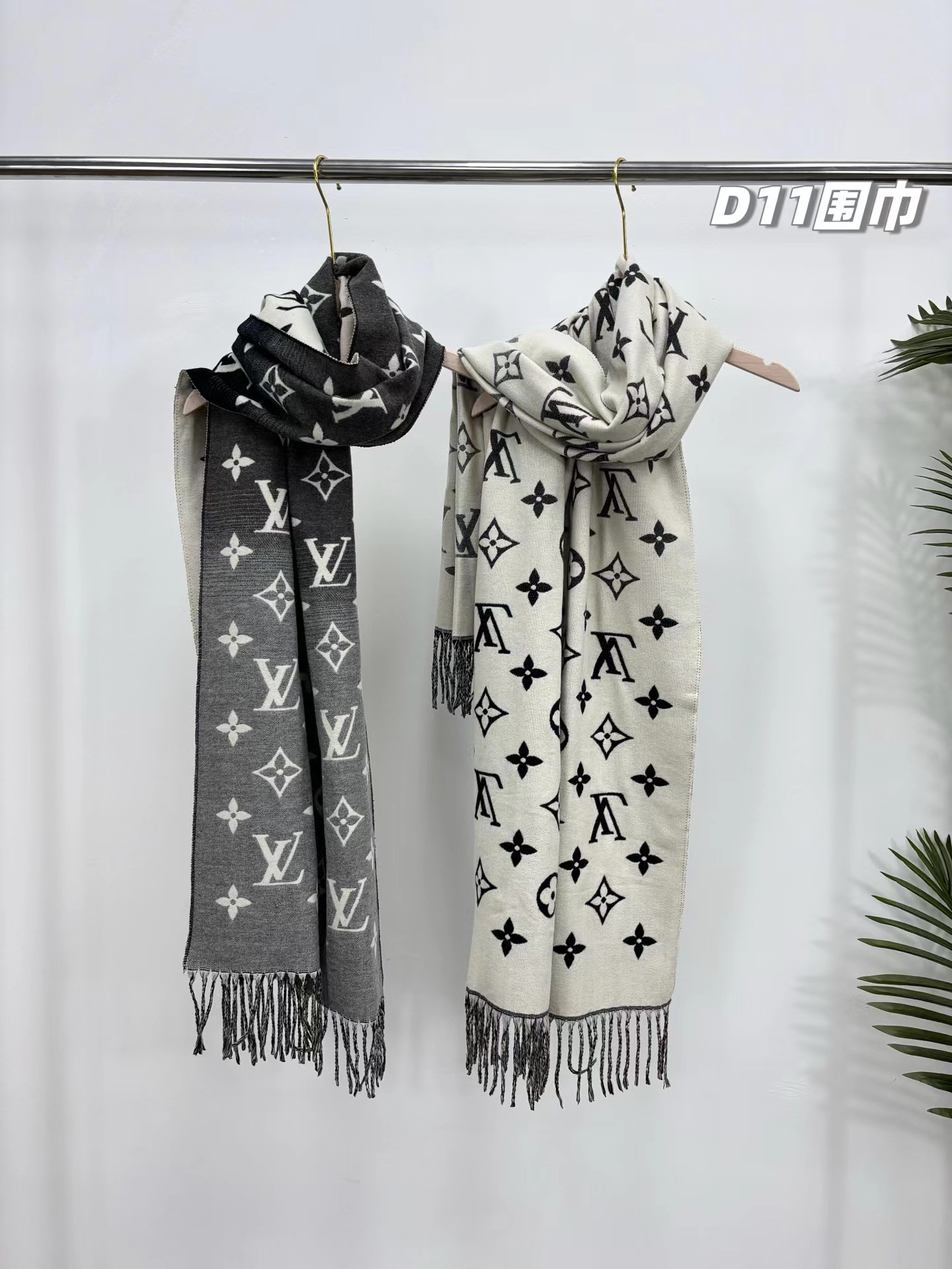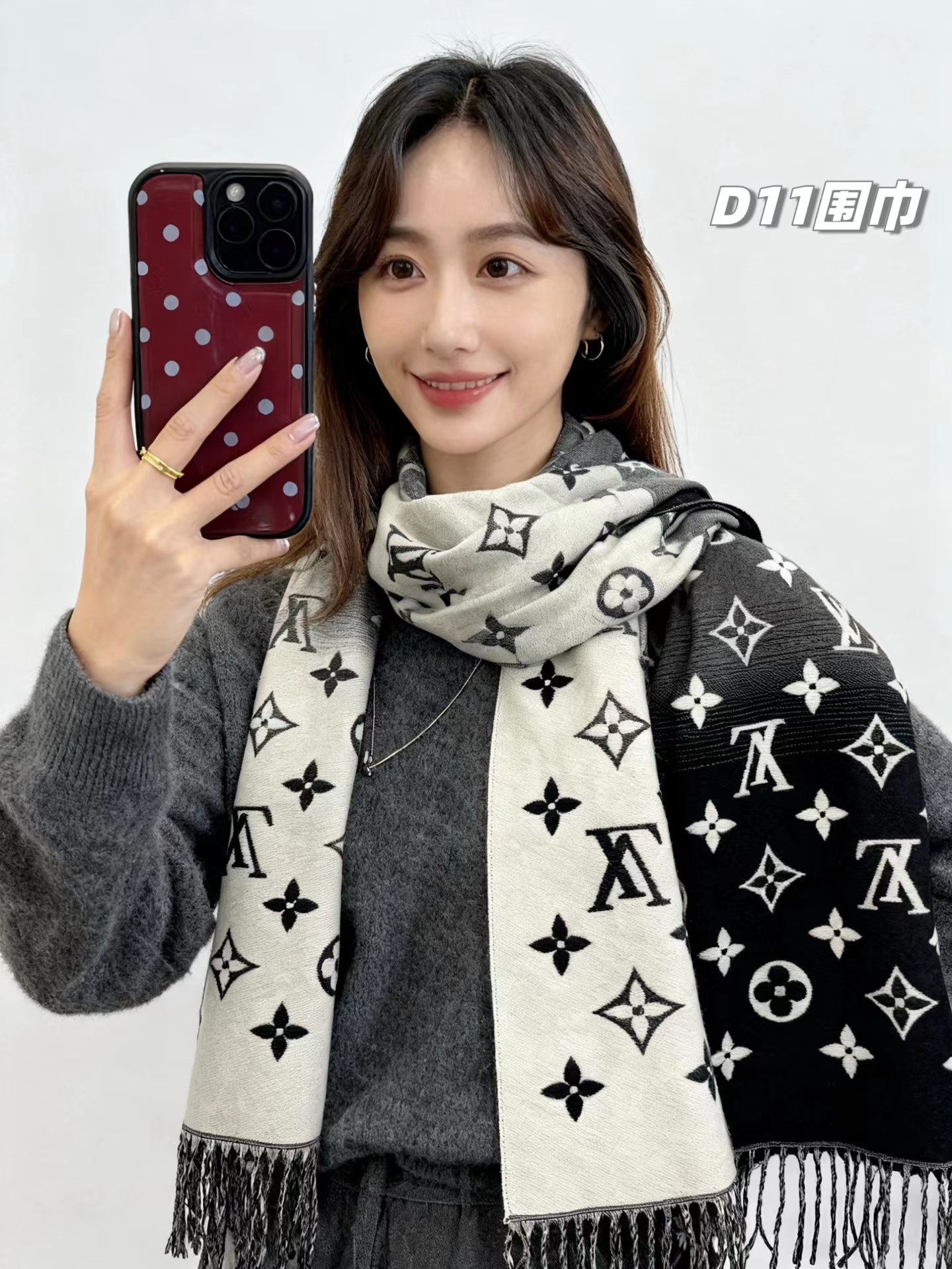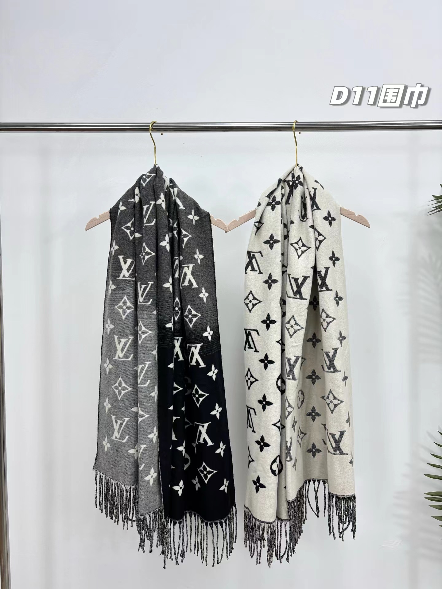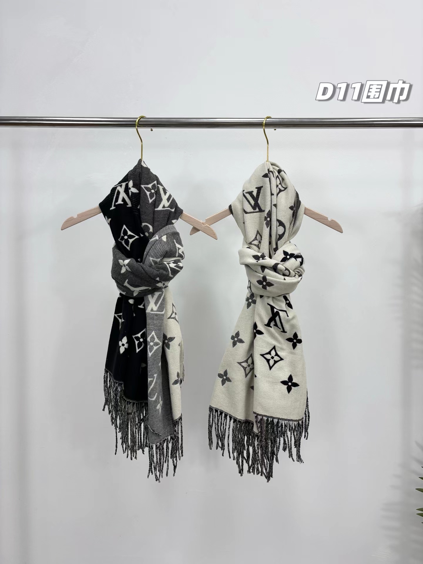羊绒围巾,情侣款可双面佩戴,保暖舒适亲肤,今冬醉舒服的一款围巾,没有之一!舒适亲肤,保暖性没得说,30%真丝+70%羊毛 ,细羊绒,亲肤性也没得说,真的不用介绍了!尺寸超大,65cm*180cm,上身自带高奢感,一面黑灰一面米色,品牌logo,给人一种气质、时尚、大气、糕贵的感觉,脑部上身效果,真的是好看!精典色,男女情侣款,适合任意年龄段任何场所,无需犹豫,入就欧了!