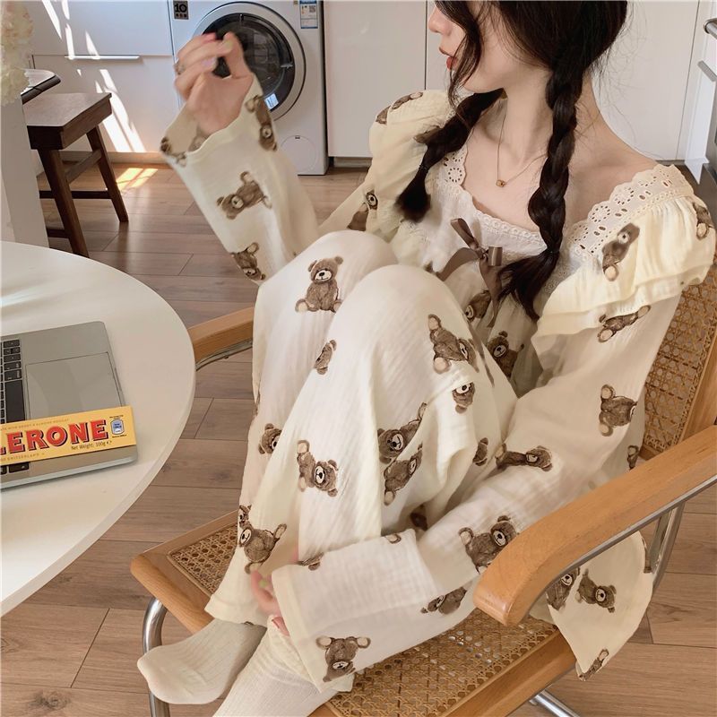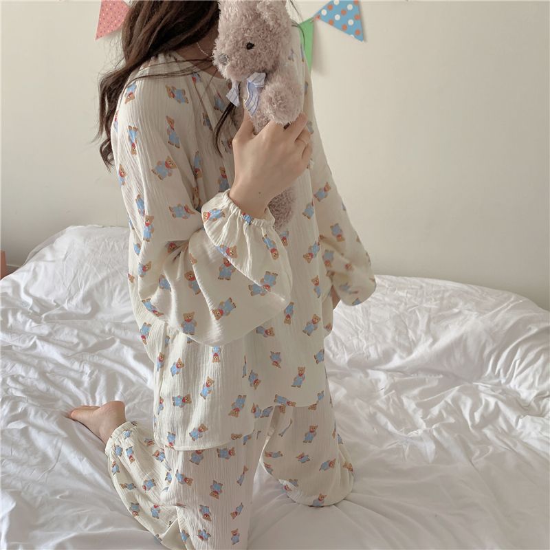 【秋季新款❗️长袖长裤睡衣】小熊蝴蝶结女冬天新款家居服套装女