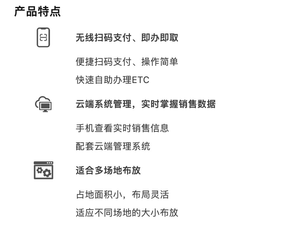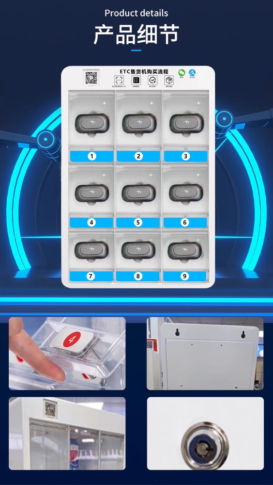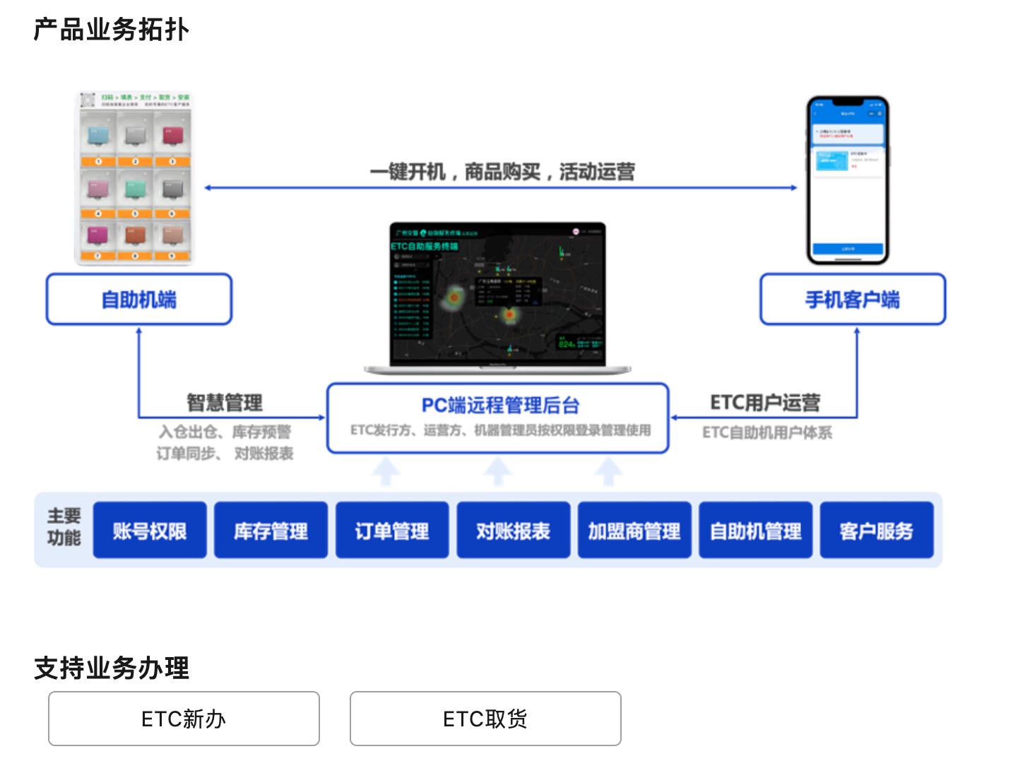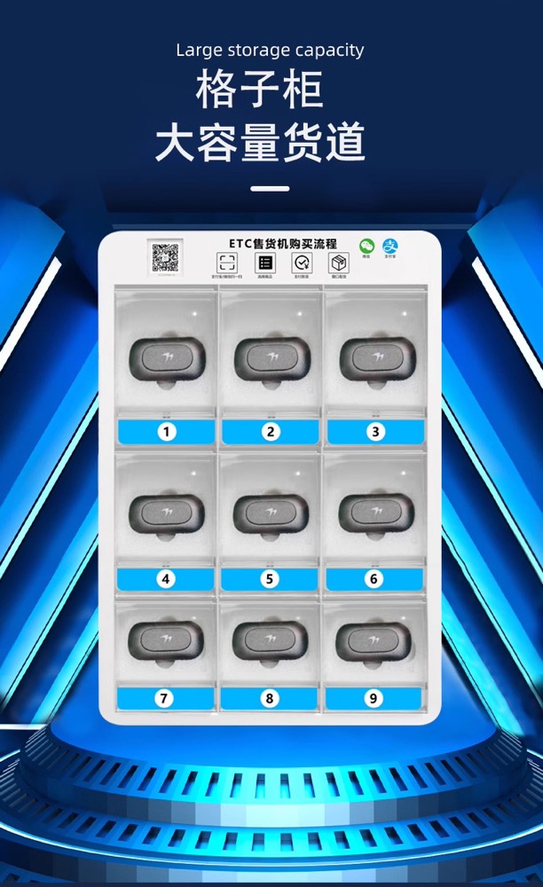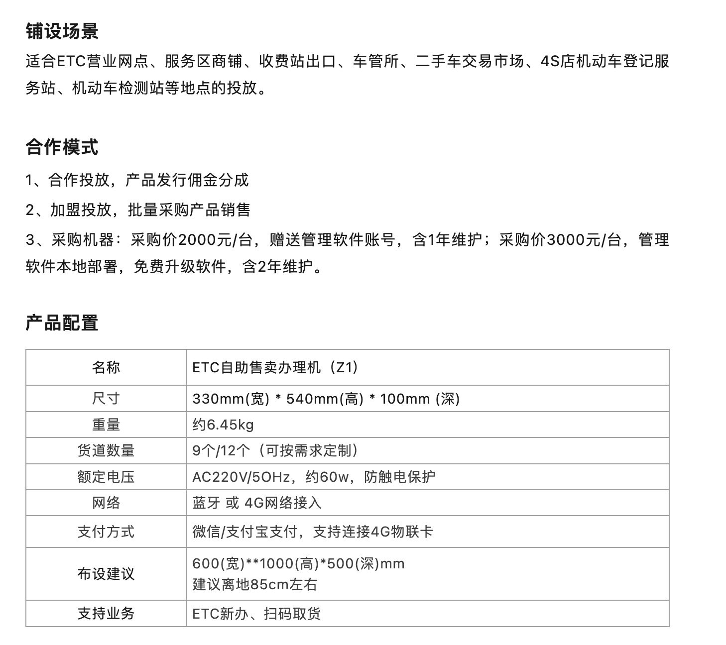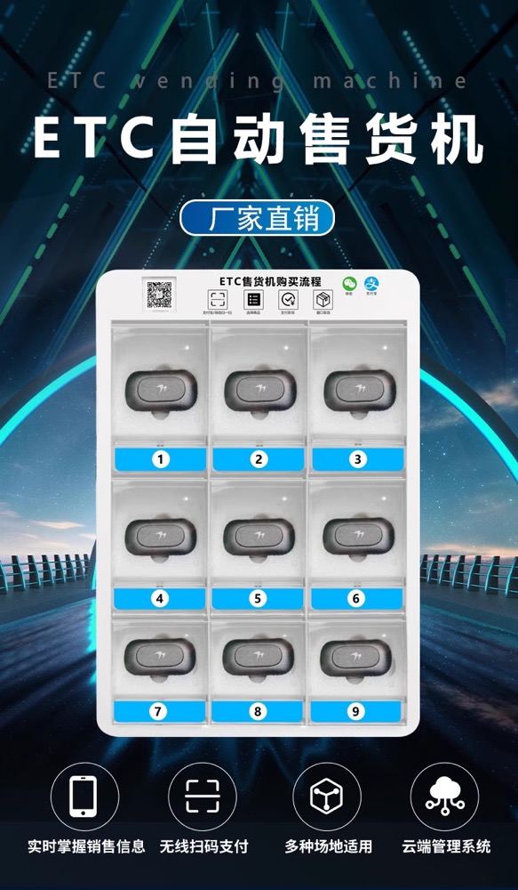 ETC自助售卖办理机(Z1)提供ETC免费领取及ETC新办服务,⽆线扫码⽀付实现快速⾃助办理。采⽤格⼦柜货道设计,多货舱独⽴控制,⽀持ETC品类灵活配货,用户即办即取。结构简单,体积⼩,⽅便运输及维护,可投放到各种⻆落,适⽤范围较⼴。