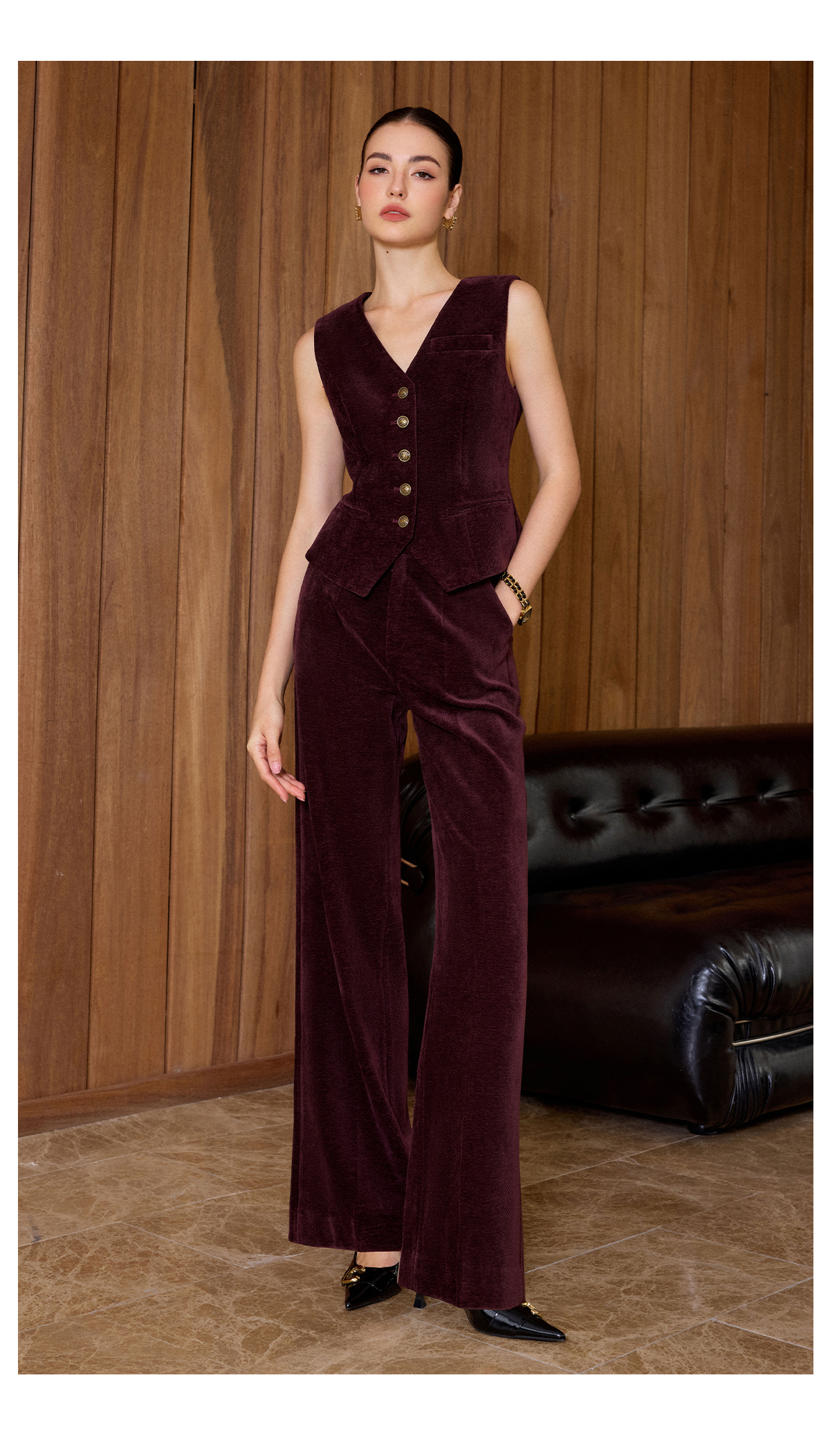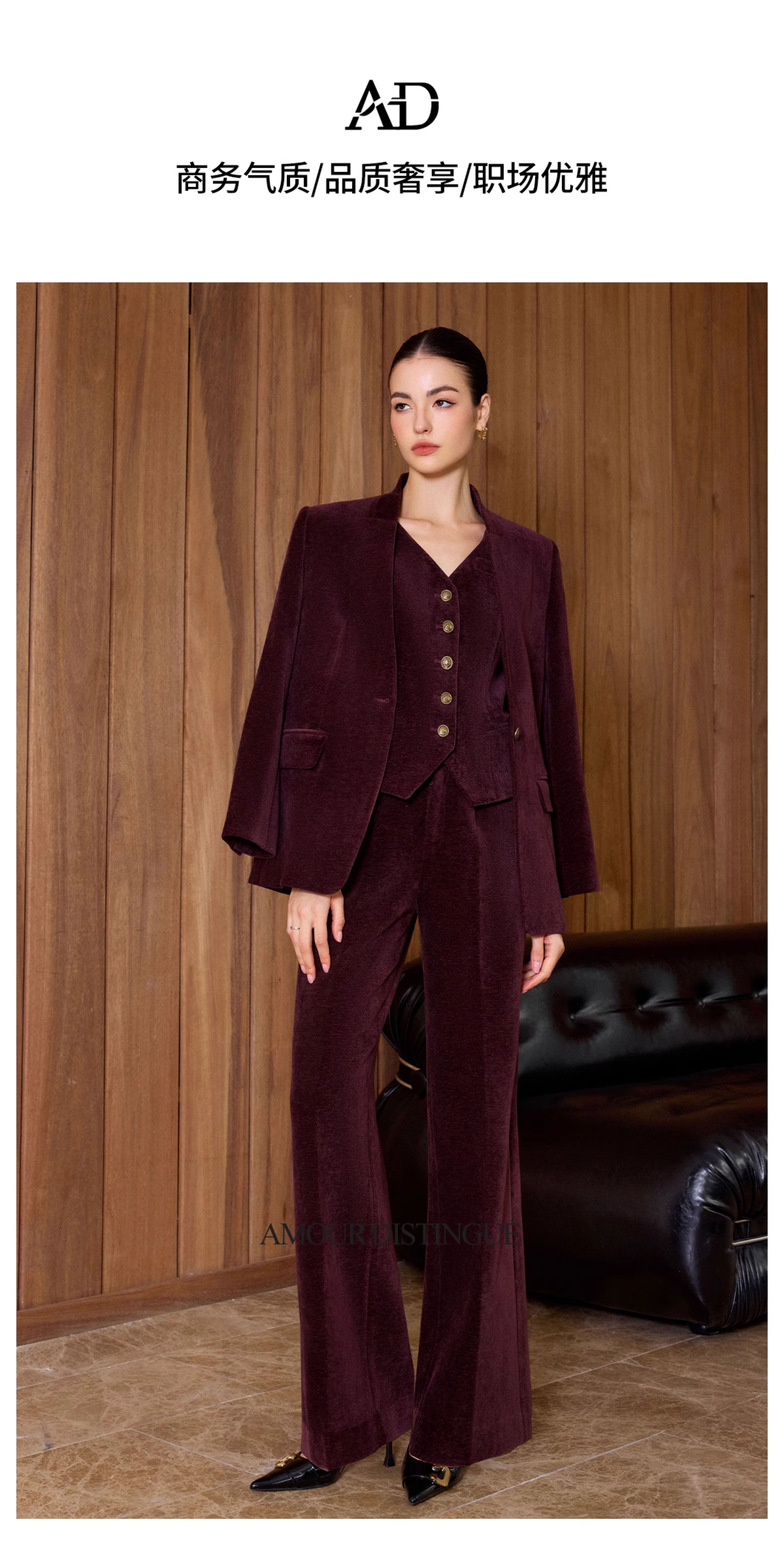 AD老钱风西装三件套女2025秋冬加厚灯芯绒马甲套装红色显瘦阔腿裤