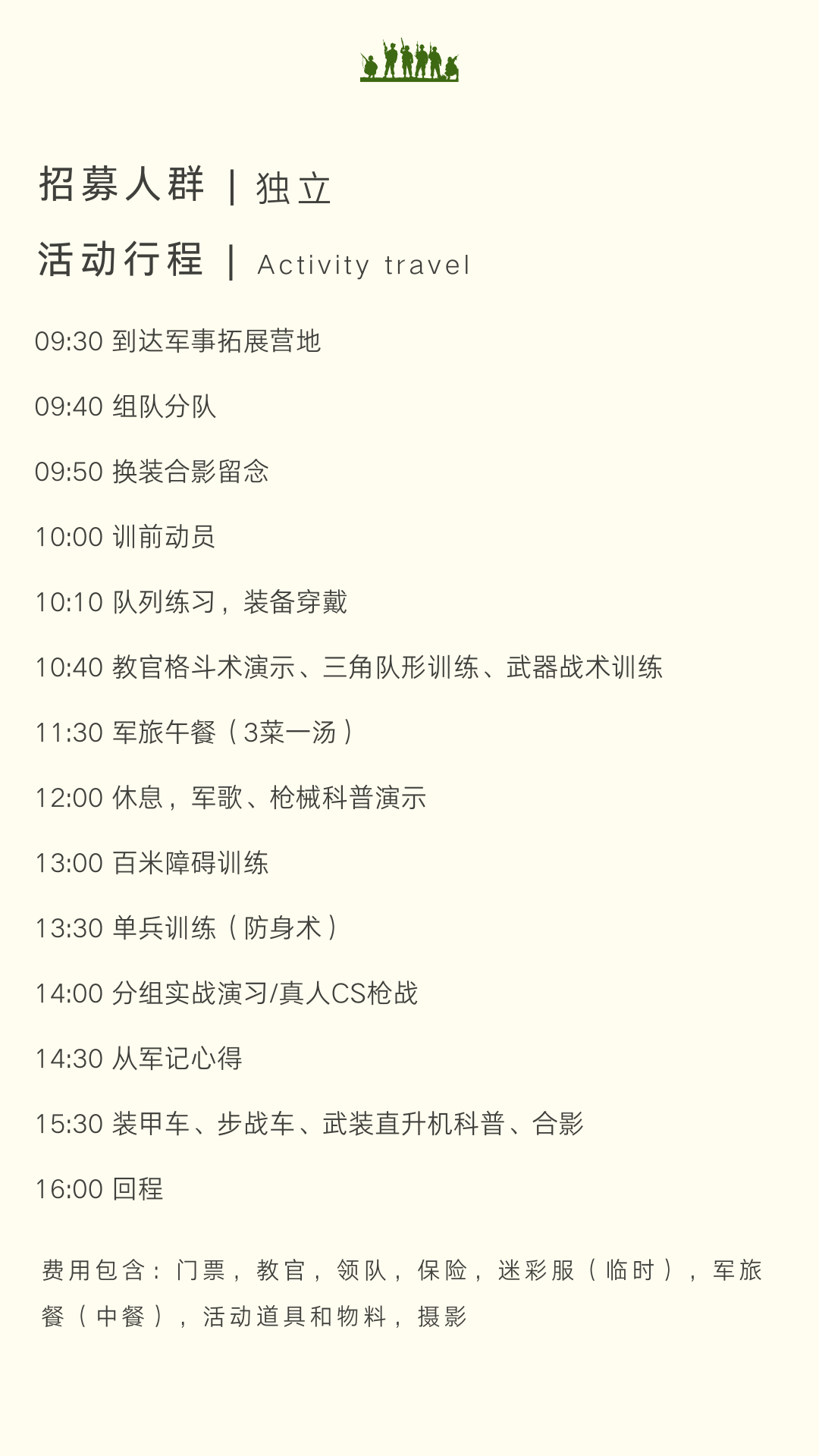 往返大巴车、责任险、意外险、领队老师、教官、跟拍摄影师