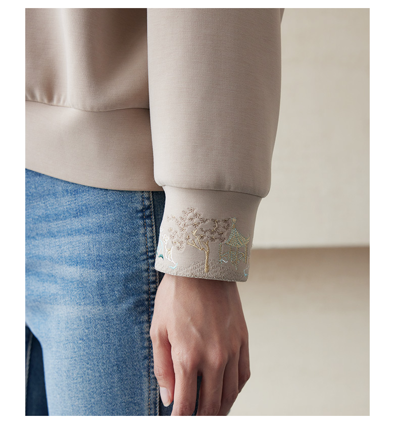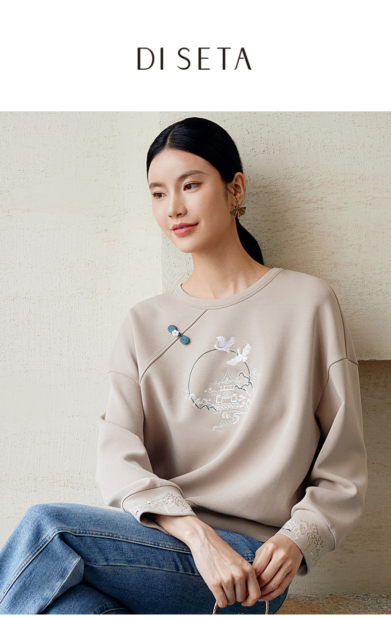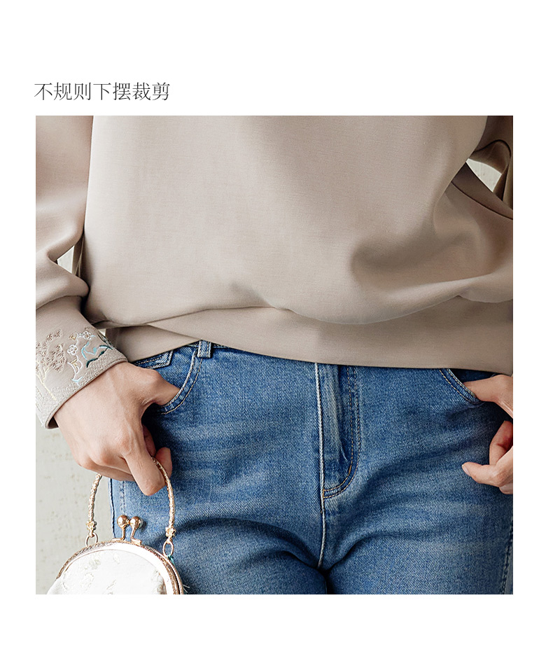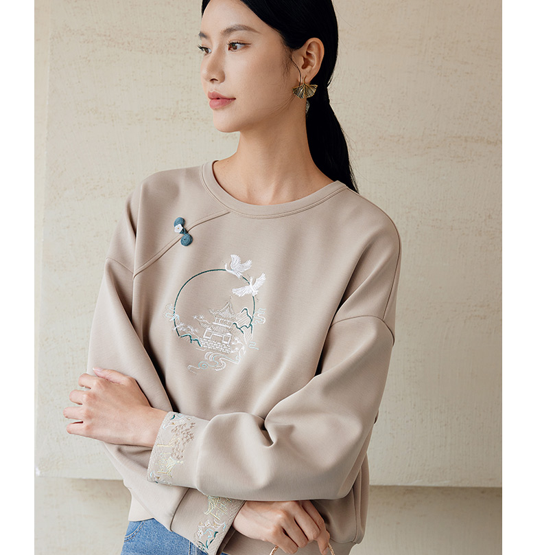 玳莎新中式绣花卫衣2024秋款斜襟设计感落肩袖宽松圆领上衣女 EC32302