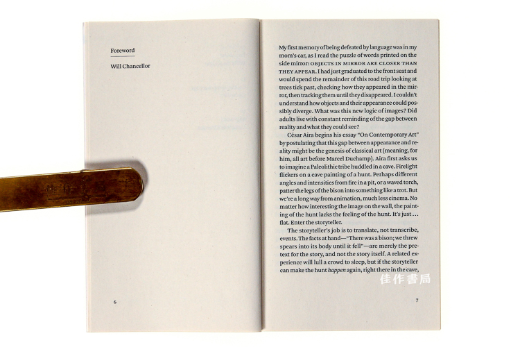 Like the great writers Walter Benjamin and Hermann Broch before him, Aira operates in the space between fiction and essay writing, art and analysis. Pursuing questions about reproducibility, art making, and limits of language, Aira’s unique voice adds new insights to the essential conversations that continue to inform our understanding of art.