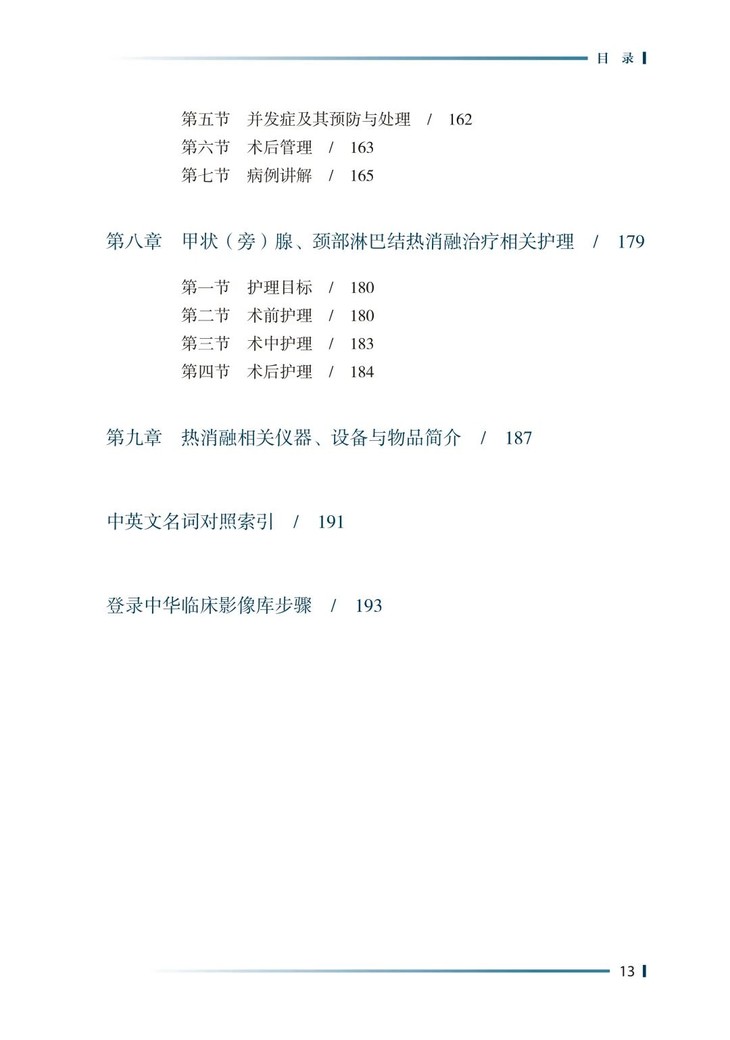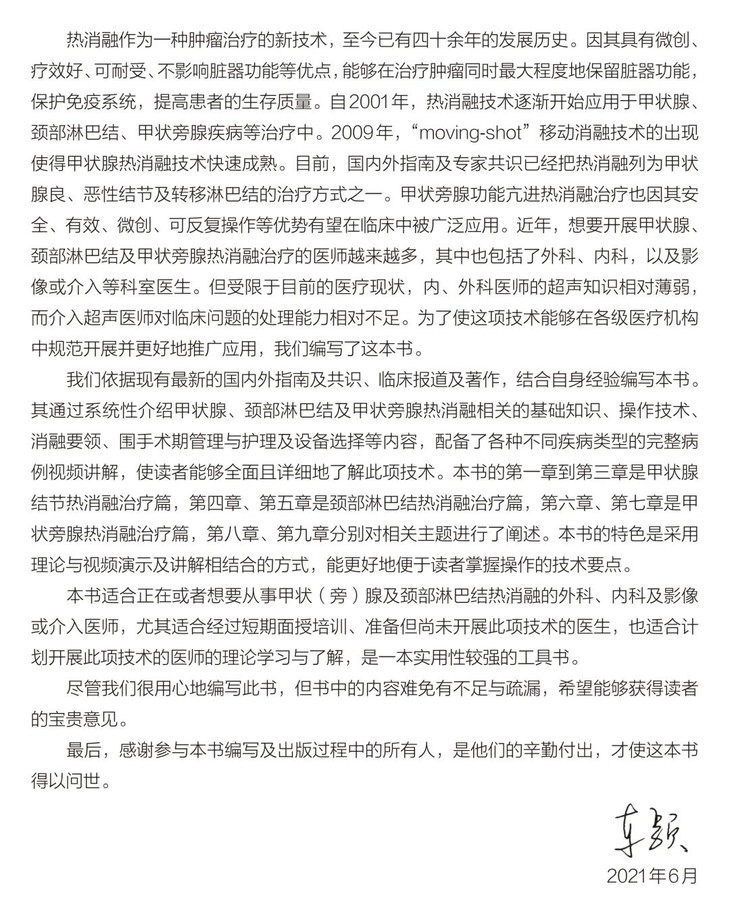 本书共9章,全面阐述了甲状腺结节热消融治疗、颈部淋巴结热消融治疗、甲状旁腺热消融治疗以及相关的护理和仪器设备选择。通过系统性介绍甲状腺、颈部淋巴结及甲状旁腺热消融相关的基础知识、操作技术、消融要领、围手术期管理与护理及设备选择等内容,配备了各种不同疾病类型完整病例视频讲解,使读者能够全面且详细地了解此项技术。