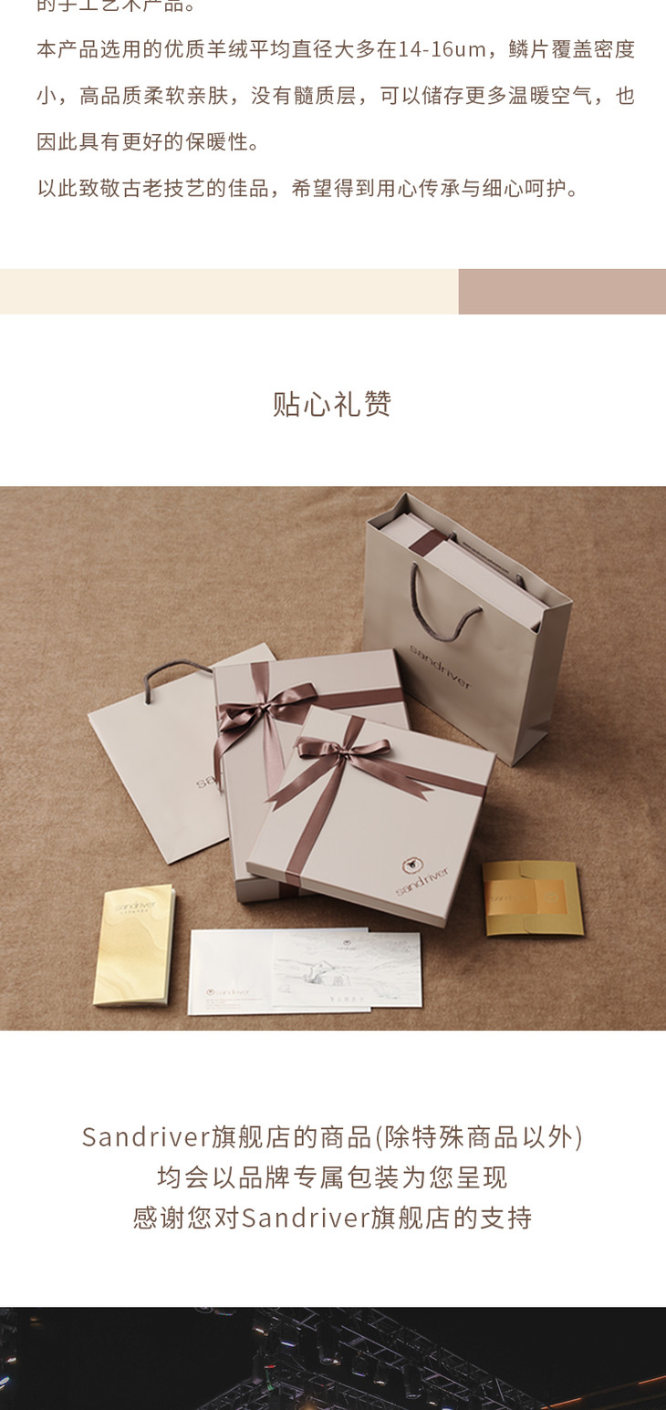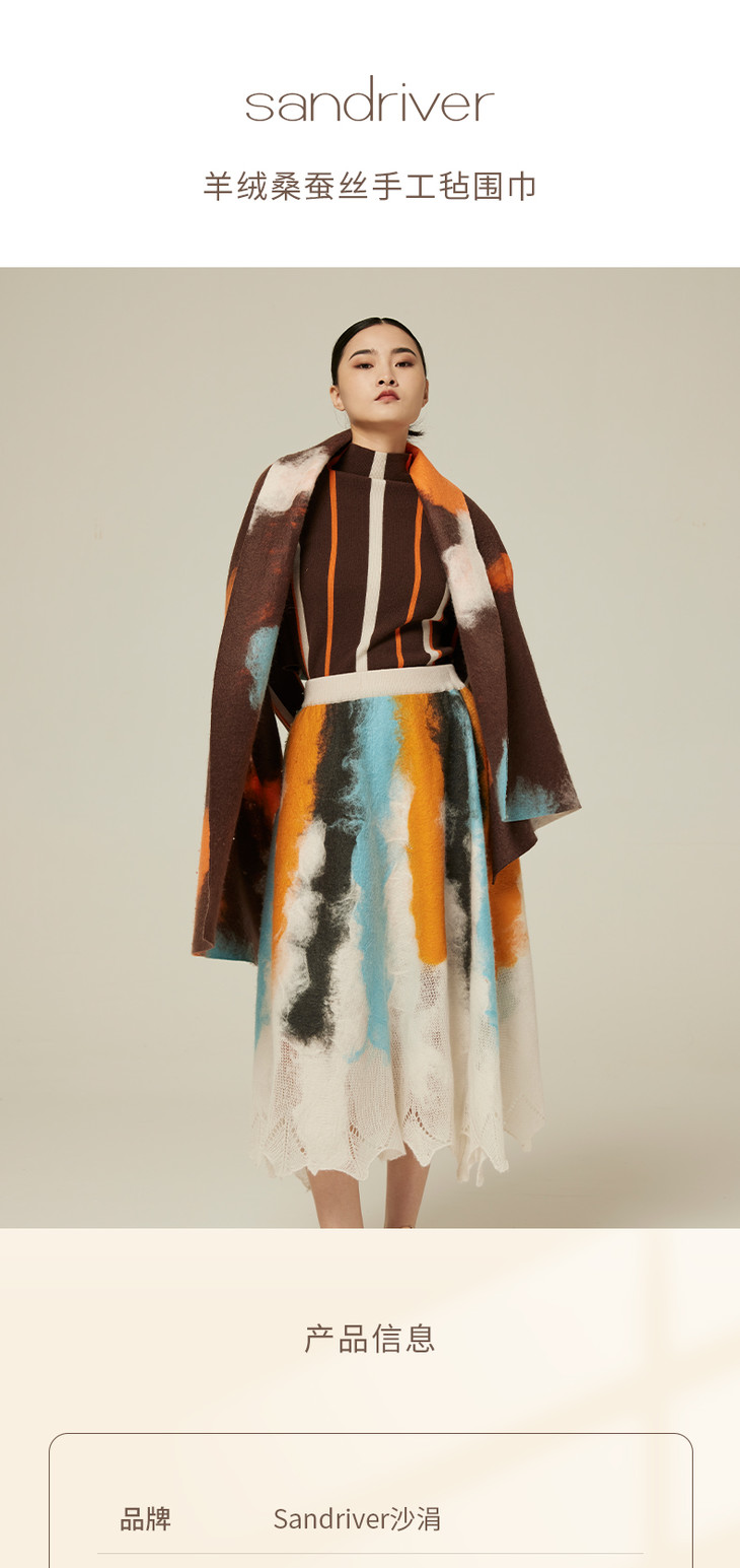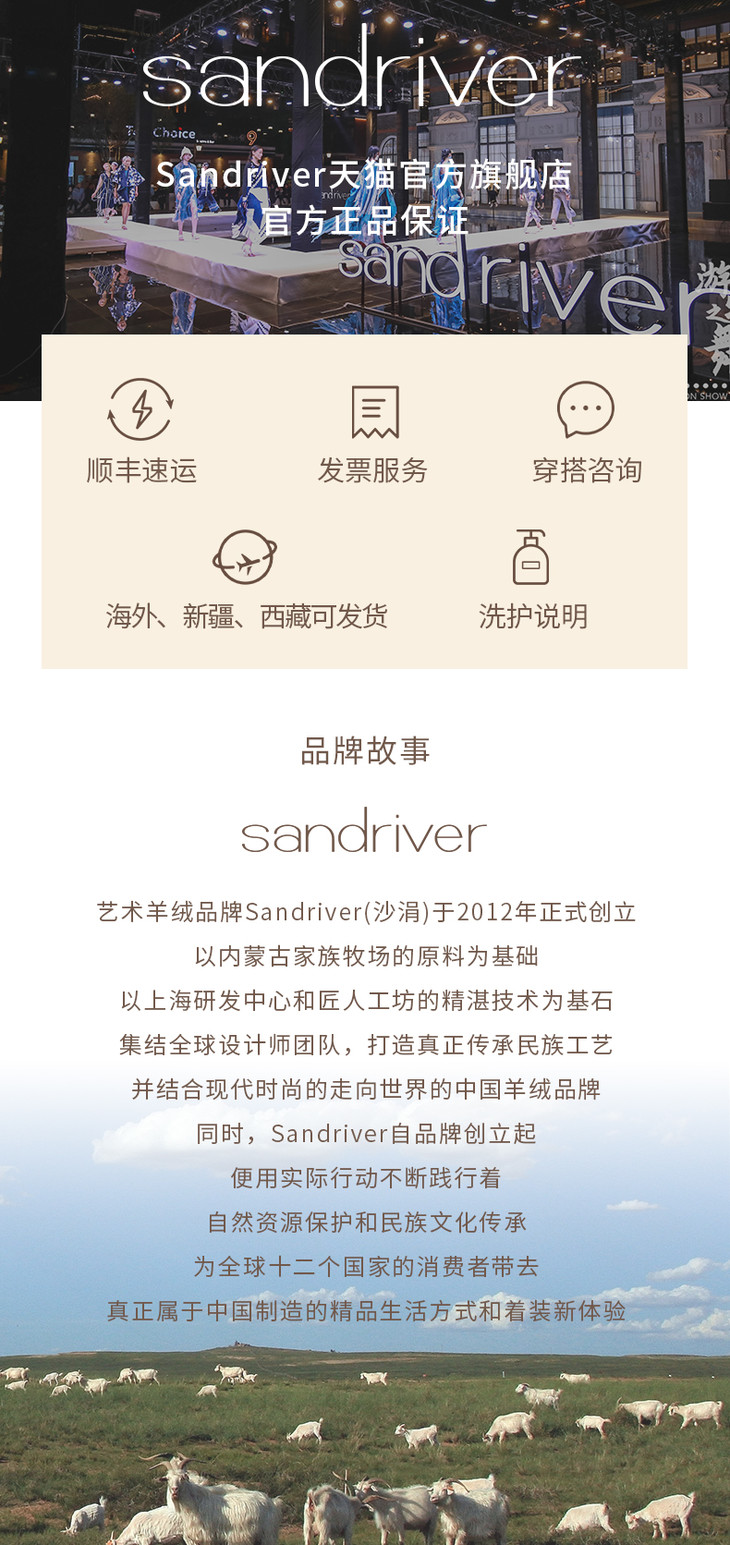历年在巴黎时装周亮相,享誉世界的艺术羊绒品牌[Sandriver 沙涓]由羊绒布道者郭秀玲女士创立。阿拉善自有牧场纯种羔羊绒,日本国宝设计师小筱顺子,上海自有基地精工细作。承载羊绒情怀,坚持匠人品质。